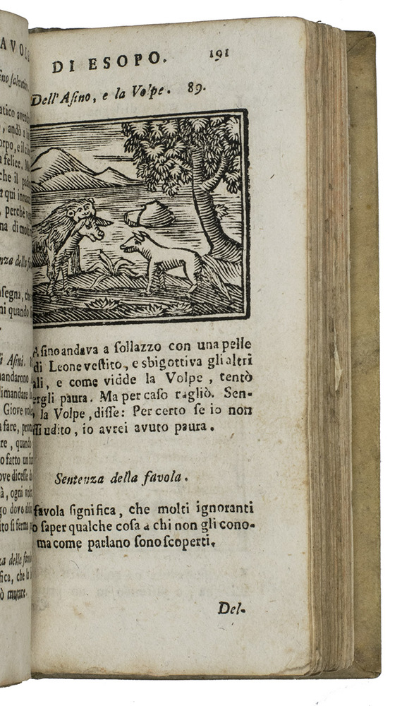 One of the many editions of this extended collection of 400 fables, collected and translated in Italian by Giulio Landi (1498-1580), an Italian author, philosopher and classical scholar, well-known for his description of the Island Madeira. As mentioned on the title the Vita of Aesop comes first, composed in Italian on the basis of Max. Planudes Life, by Giulio Landi. The corpus of the Fables, includes no less than 400 animal fables, some collected from other sources (including Fables by Landi himself). The Fables are illustrated with 90 anonymous woodcuts. Several woodcuts are repeated, especially at the end, for the fables taken from other sources. All fables close with a moral, here called Sentenza, intended for the instruction and amusement of the youth.