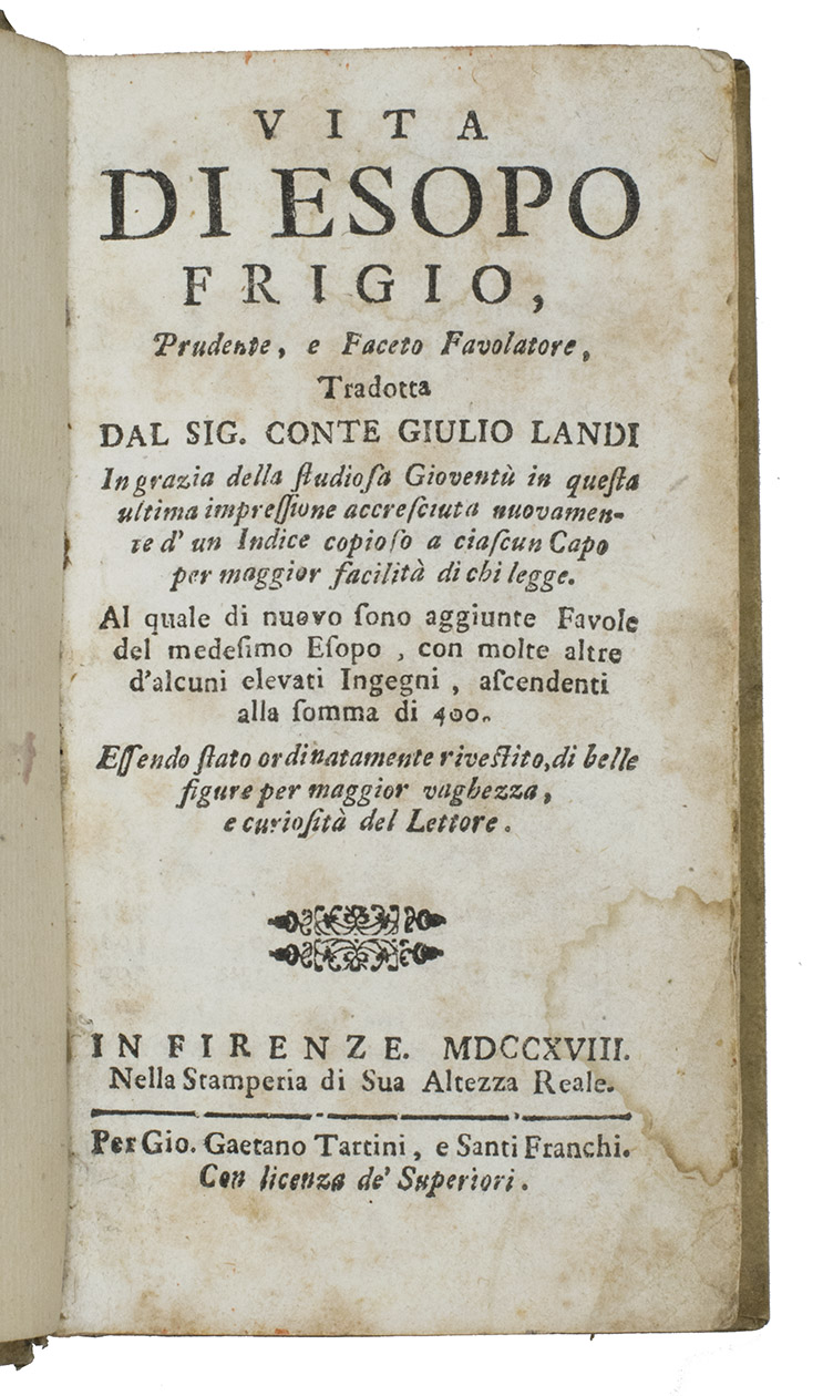 Vita di Esopo Frigio, prudente, e faceto favolatore, Tradotta dal Sig. Conte Giulio Landi in grazia della studiosa Gioventu ... Al quale di nuovo sono aggiunte Favole del medesimo Esopo, con multe alter dalcuni elevati Ingegni, ascendenti alla somma di 400 ...