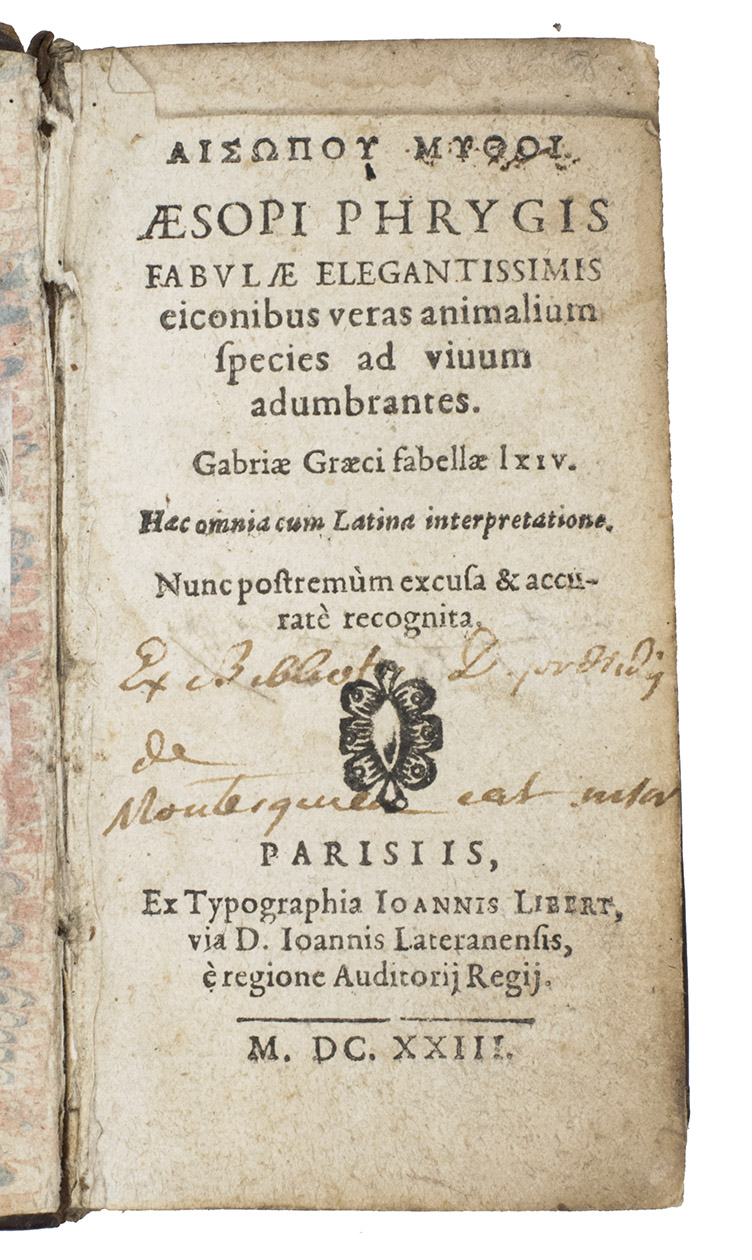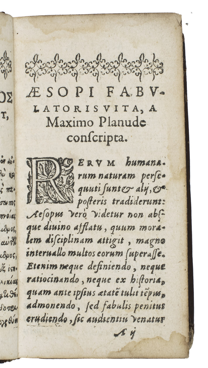 Very rare 24ş edition of 150 prose fables by Aesop and 43 verse fables by Babrius (here called Gabrius) in Greek and Latin on facing pages, remotely based on the text of the illustrated humanistic editions published by Jean de Tournes in Lyons. While the existence of Aesop (ca. 620-ca. 584 BCE) as a story teller is attested in many early sources, the canon that appears under his name contains fables passed down orally and rendered in literary form by many authors over the centuries. Babrius wrote verse fables shortly before 200 CE that were later rendered in Greek prose and added to the Aesop canon. Although the title-page indicates that the fables are illustrated, the present edition never contains woodcuts: Libert apparently copied his title from one of the illustrated editions. He does include Maximus Planudess extensive account of Aesops life preceding the fables.