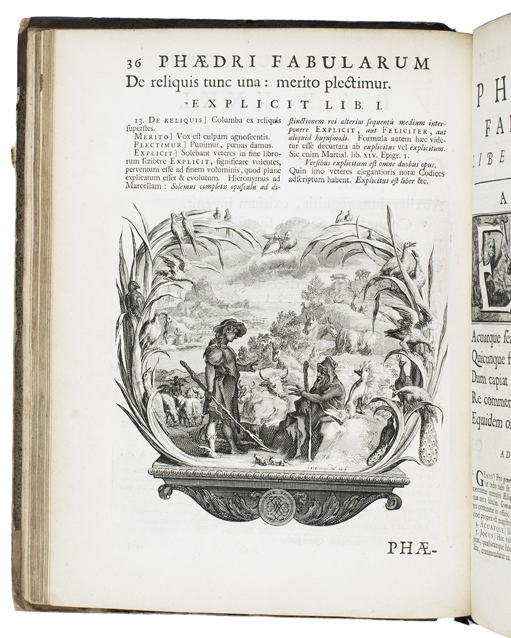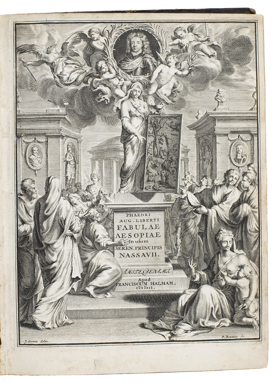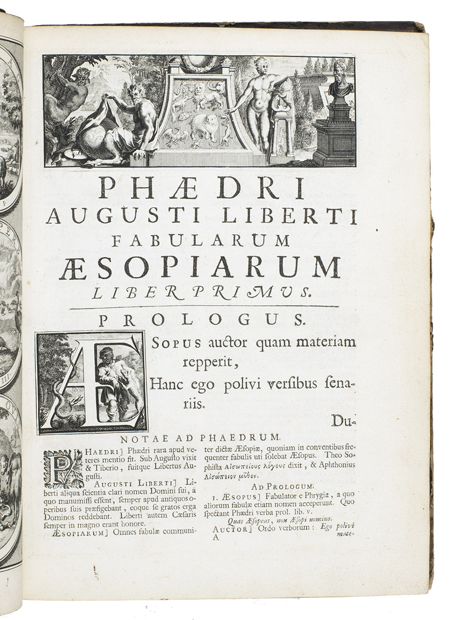 Gorgeous edition of the 94 Aesop fables with 5 additional fables found by the German philologist and classical scholar Marquart Gudius, together with his extensive and scholarly notes, printed in two columns below each fable, the whole prepared by David van Hoogstraten (1658-1724), the conrector of the Latin School of Amsterdam (1694-1722). Apart from being a prolific Dutch and Neo-Latin poet, he was an esteemed linguist and philologist who edited a number of classical authors. His present splendid Phaedrus edition, intended for and dedicated to the young Stadholder of Friesland and Groningen, the "crown-prince" Johan Willem Friso of the Nassau family, is magnificently printed in the style of the French "in usum Delphini" editions made for Le Grande Dauphin.