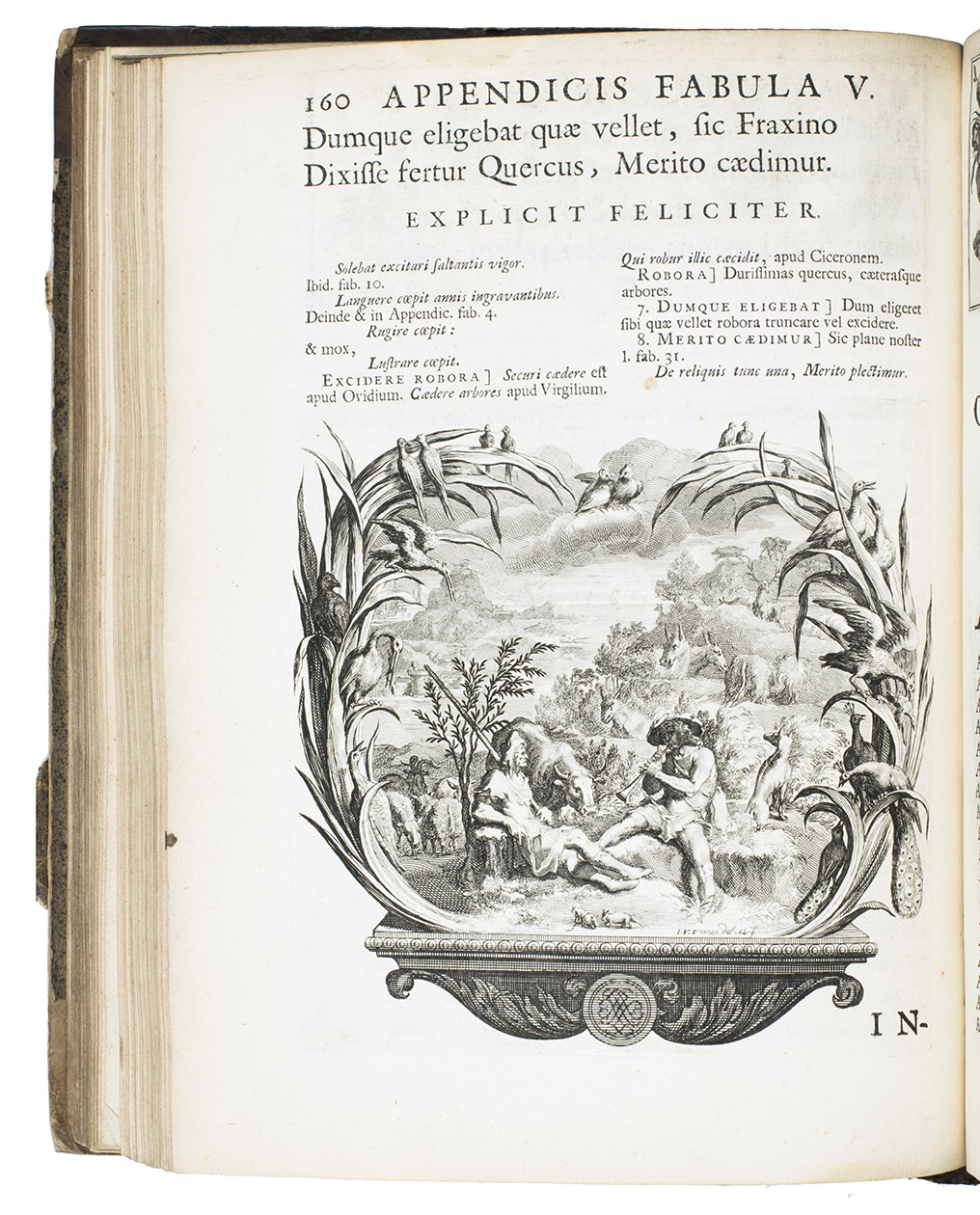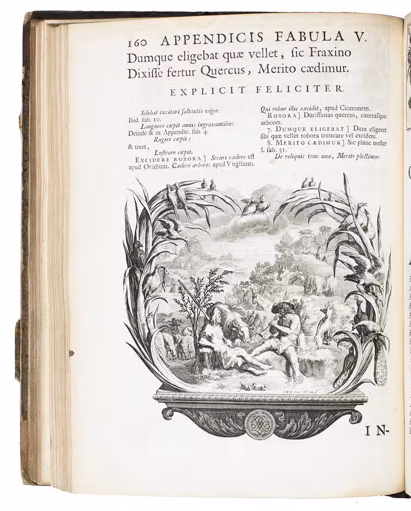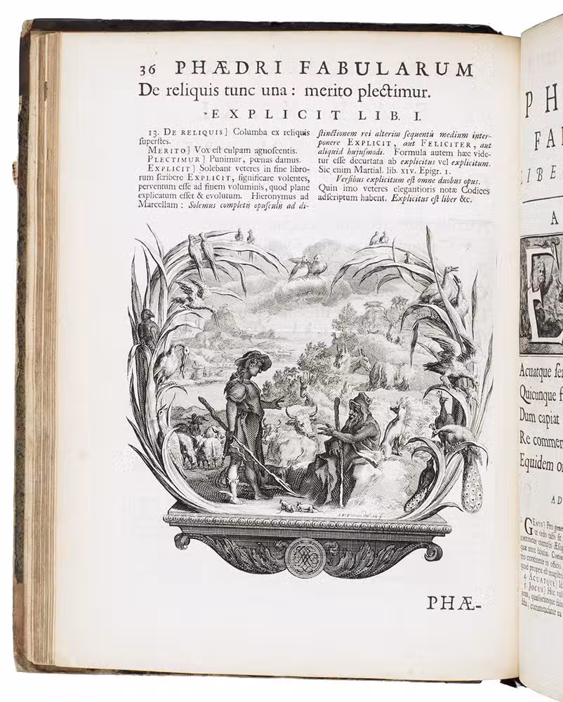 Gorgeous edition of the 94 Aesop fables with 5 additional fables found by the German philologist and classical scholar Marquart Gudius, together with his extensive and scholarly notes, printed in two columns below each fable, the whole prepared by David van Hoogstraten (1658-1724), the conrector of the Latin School of Amsterdam (1694-1722). Apart from being a prolific Dutch and Neo-Latin poet, he was an esteemed linguist and philologist who edited a number of classical authors. His present splendid Phaedrus edition, intended for and dedicated to the young Stadholder of Friesland and Groningen, the "crown-prince" Johan Willem Friso of the Nassau family, is magnificently printed in the style of the French "in usum Delphini" editions made for Le Grande Dauphin.