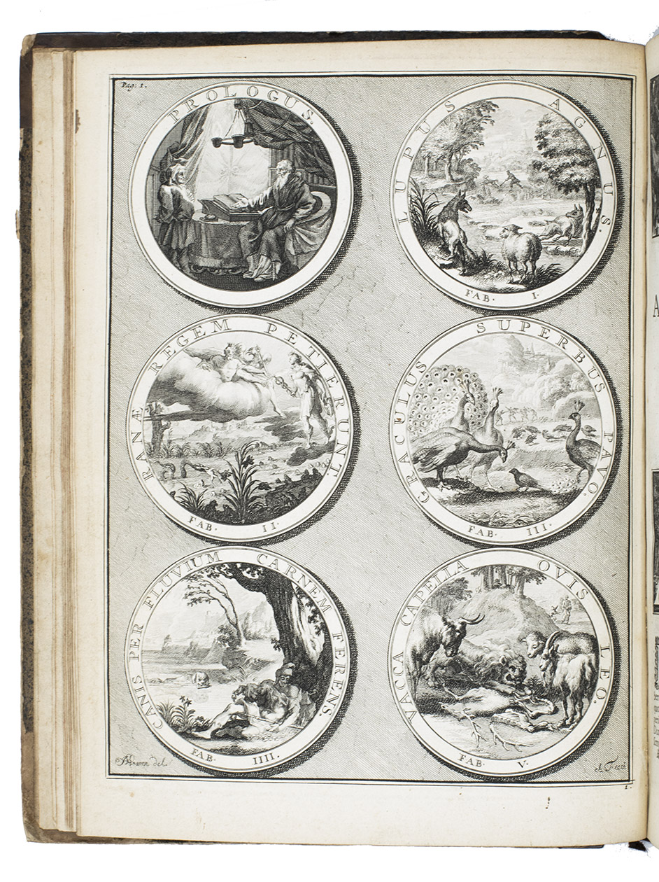 Amsterdam, François Halma, 1701. 4to. With an engraved frontispiece, an engraved printer's device on the title-page, a folding portrait of the dedicatee and 18 engraved plates with 6 roundels on each plate illustrating the 99 fables and 5 prologues, 3 portraits of Aesop and tailpieces and historiated initials. Contemporary half calf, brown sprinkled paper sides, brown spine label with title in gold, red sprinkled edges. [32], 160, [84] pp.