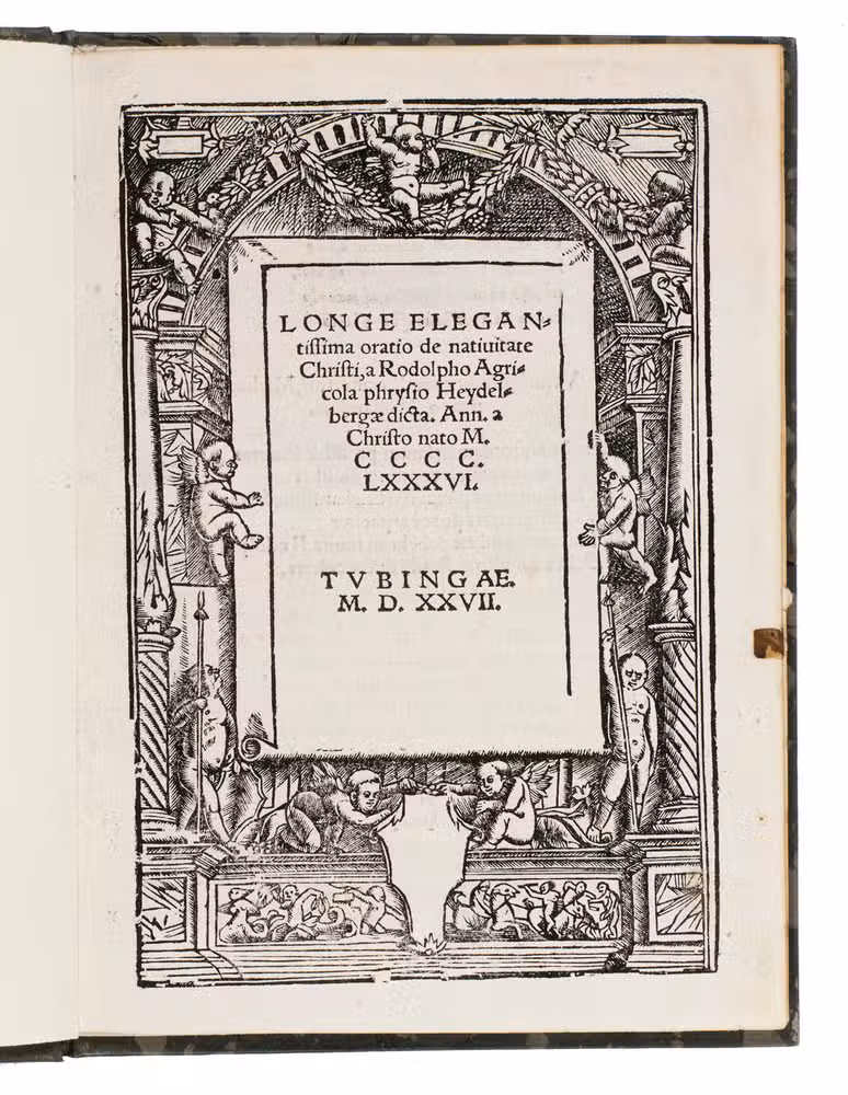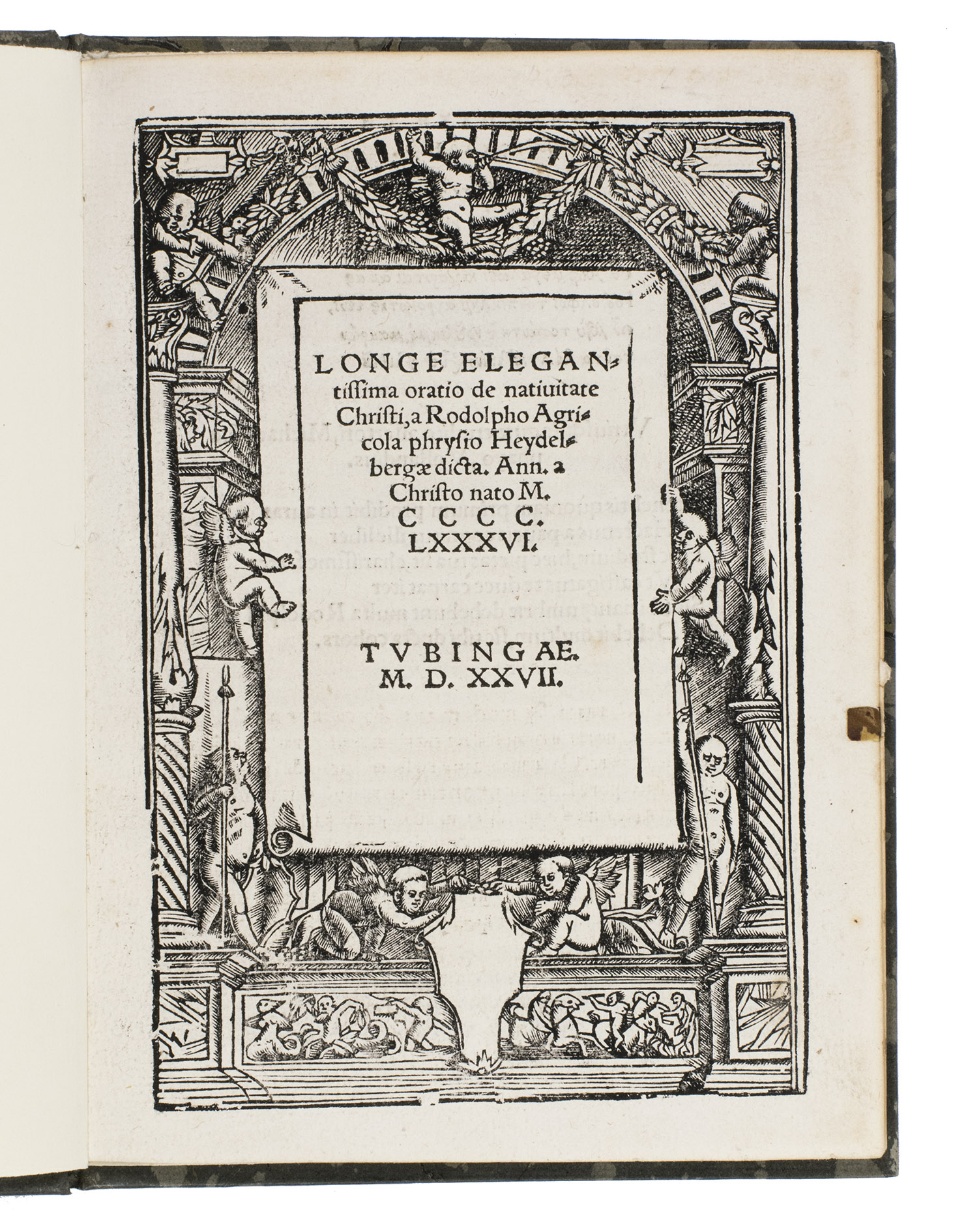First edition of the celebrated Christmas oration, delivered in 1484 before the assembled clergy of the Diocese of Worms, though the title erroneously dates it to 1486. The oration was given by Rodolphus Agricola (also known as Roelof Huisman, 1444-1485), one of the first Humanists of the northern Low Countries. The editor, Caspar Volland (1500-1554), who taught poetics and rhetoric at Tübingen, ensured that Agricolas eloquent Latin prose reached a wider audience of Renaissance Humanists. The editor, Caspar Volland (1500-1554), who taught poetics and rhetoric at Tübingen, ensured that Agricolas eloquent Latin prose reached a wider audience of Renaissance humanists.