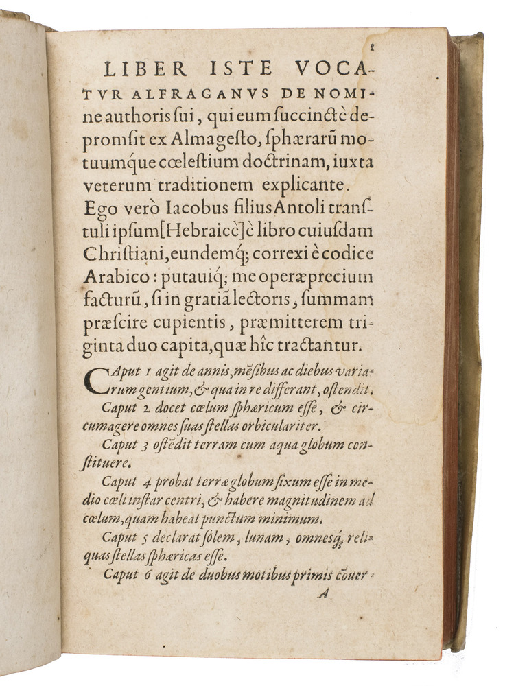 Rare first edition of the Latin translation of a very influential astronomical work, which was in large part responsible for spreading Ptolemaic astronomy in medieval and early modern Europe. Written in the 9th century, it was a summary of Ptolemy's Amalgest, but circulated in Europe long before the Amalgest itself was first translated into Latin (1496). The work was referenced by numerous medieval authors, and it is known that Dante Alighieri also used it for two of his works (Vita Nuovo and Convivio). Despite its importance, however, the present edition is quite scarce, as we have only been able to trace one other copy in sales records of the past 100 years.