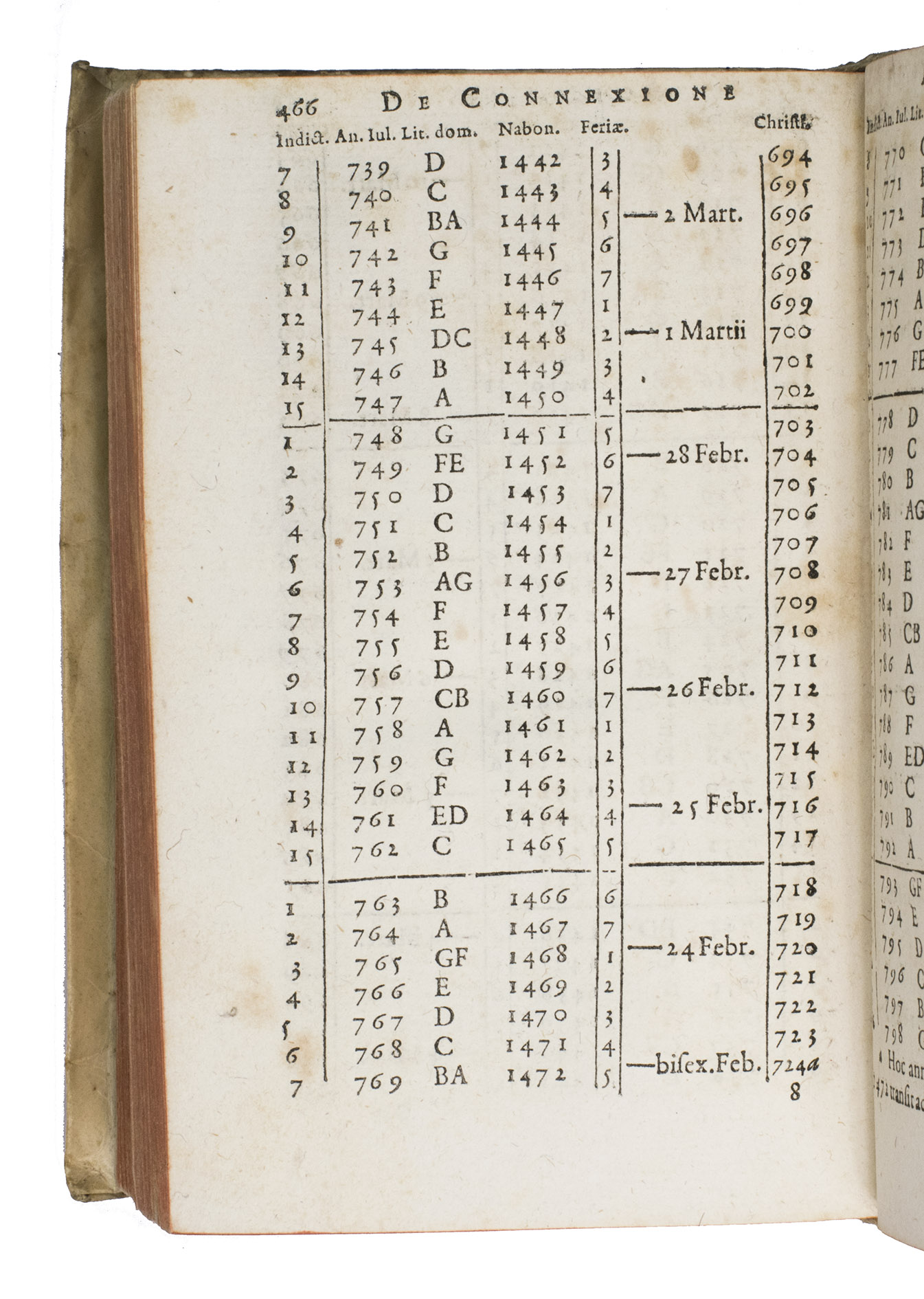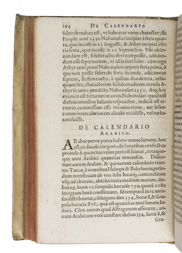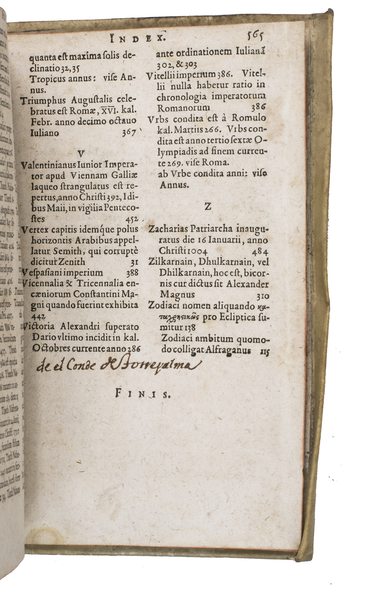 With a crossed out ownership annotation on the recto of the first flyleaf, an annotation ("f=10=") on the verso of the first flyleaf, a calculation in an 18th-century hand on page 25, and another annotation in a different 18th-century hand on pp. 531 and 565 ("de el Conde de Storrepalma"). The edges and corners of the boards are slightly scuffed and the vellum is slightly stained, with an imprint of a label on the spine, a green ink scribble and partially rubbed off writing in blue ink on the front board. The work is somewhat browned throughout, with a water stain in the outer margin of the first 30 pages, slightly affecting the text, the head margin has been cut slightly short, without affecting the text. Otherwise in good condition. De la Lande, Bibliographie astronomique, p. 121; DSB 4, p. 541-545; Houzeau & Lancaster 1115; USTC 676537; VD16 A 1203; Zinner 3368.