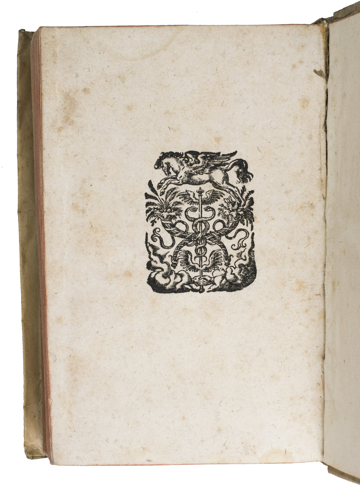 Frankfurt, Andreas Wechel (heirs of), Claude de Marne, and Johann Aubry, 1590. 8vo. With a woodcut vignette on the title page and the final leaf, a woodcut decorated initial, and a woodcut head- and tailpiece. Near contemporary overlapping vellum with the manuscript title on the spine, remnants of ties, red edges. [1], [1 blank], [12], [2 blank], 565, [1], [1 blank], [1] pp.