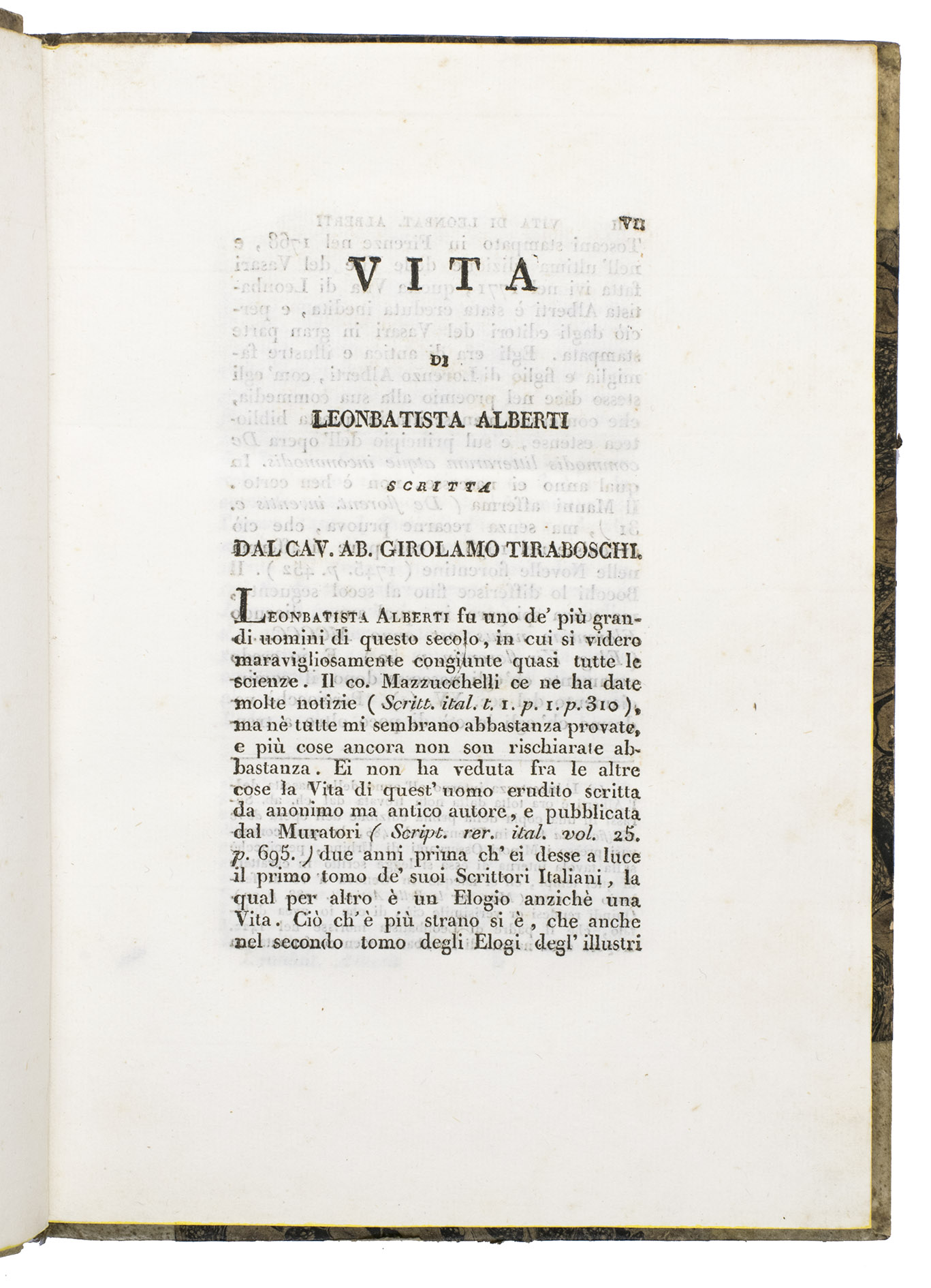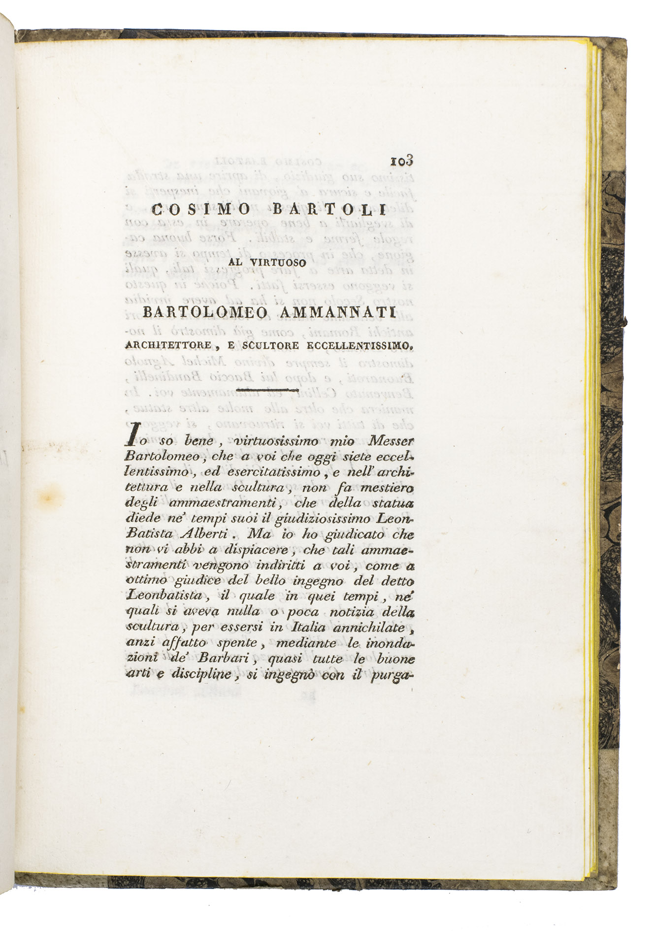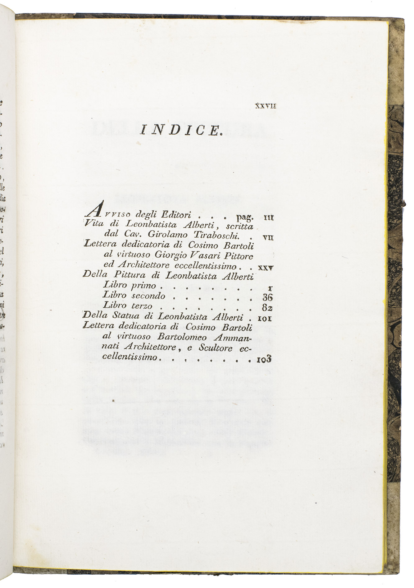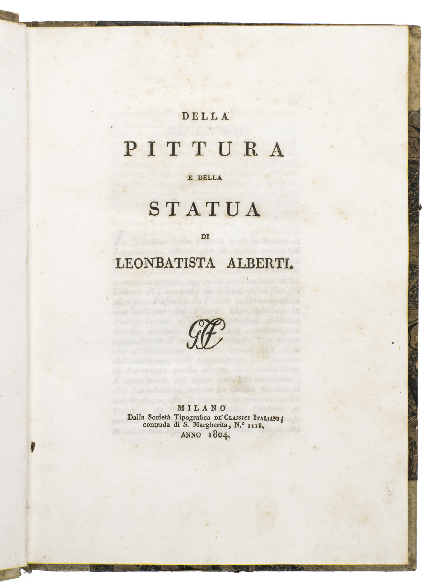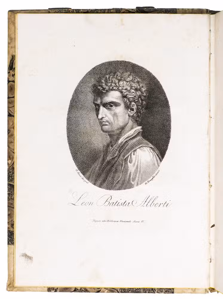A classic scholarly edition of two important treatises, on painting and sculpture, by the great Florentine architect, Leon Battista Alberti (1404-1472), this edition adding a 20-page biography. The text of the treatises was translated from the Latin by Cosimo Bartoli (1503-1572) and the life of Alberti written by Girolamo Tiraboschi (1731-1794). It includes two letters written by the translator, one to the painter and architect Giorgio Vasari and the other to the architect and sculptor Bartolomeo Ammannati, as well as a three-page preface by the publisher, Guisti, Ferrario & Co. The treatise on painting (pp. 1-99), divided in 3 parts, is a theoretical classic and of essential importance for the history of perspective.