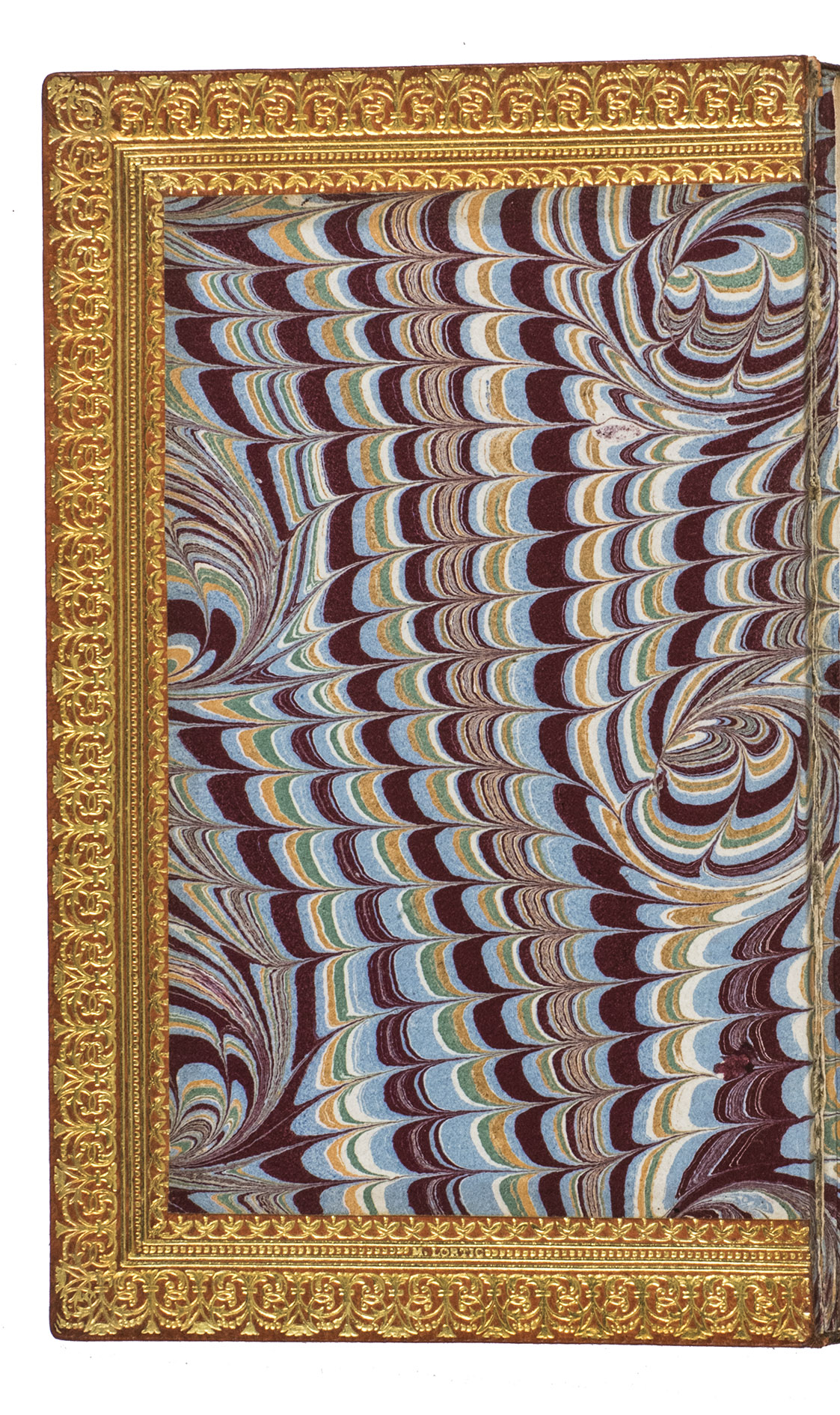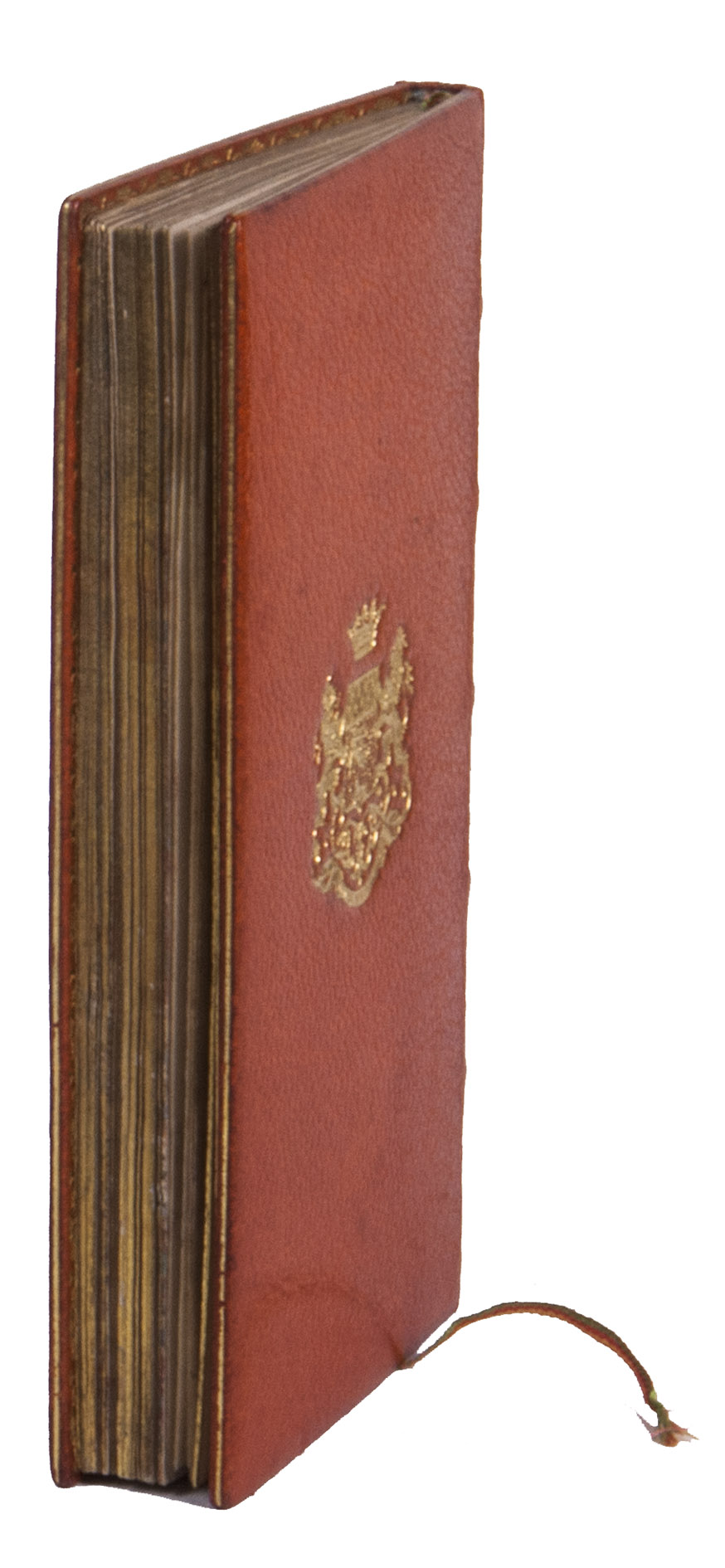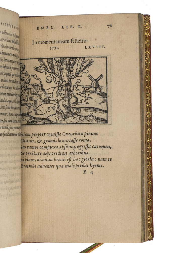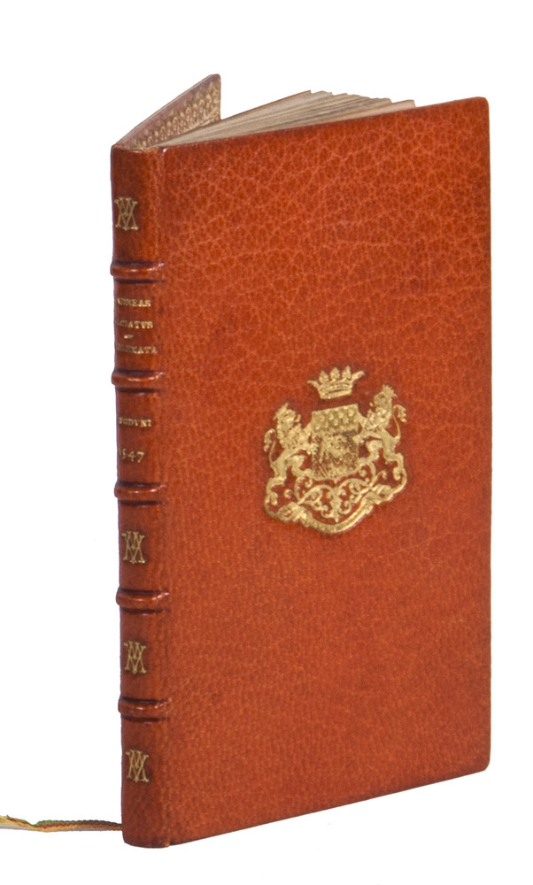 Lyon, Jean de Tournes et Guillaume Gazeau, 1547. 16mo. With a woodcut printer's device on the title page, a variant woodcut printer's device on the verso of the last leaf, and 113 half-page woodcut emblems by Bernard Salomon. 19th-century gold-tooled orange morocco by Marcellin II Lortic in Paris, with the author, title, and imprint lettered in gold on the spine, the gilt armorial supralibros of the Prince d'Essling in the centre on both sides, and his initials "VM" on the spine, gold-tooled board edges and turn-ins, gilt edges, marbled end papers. 143, [1] pp.