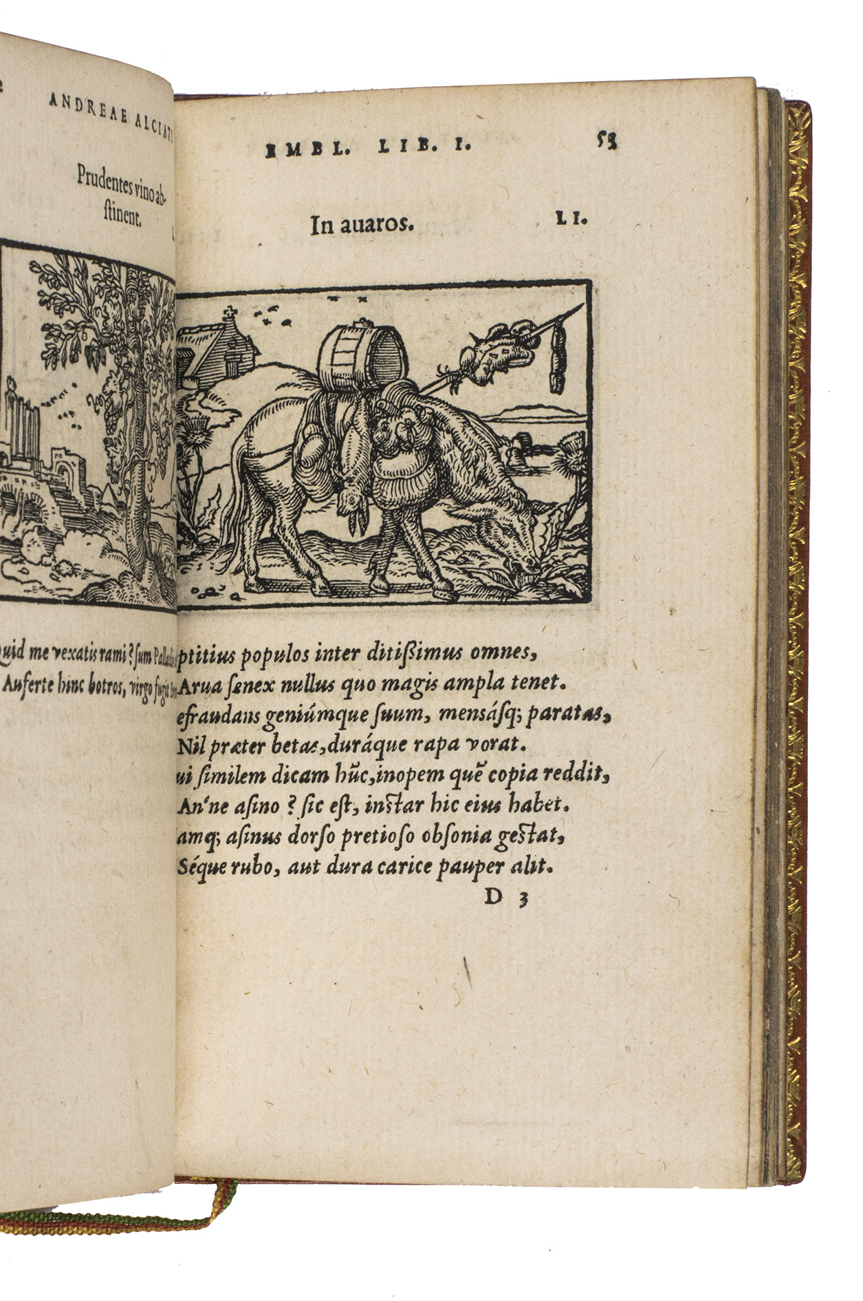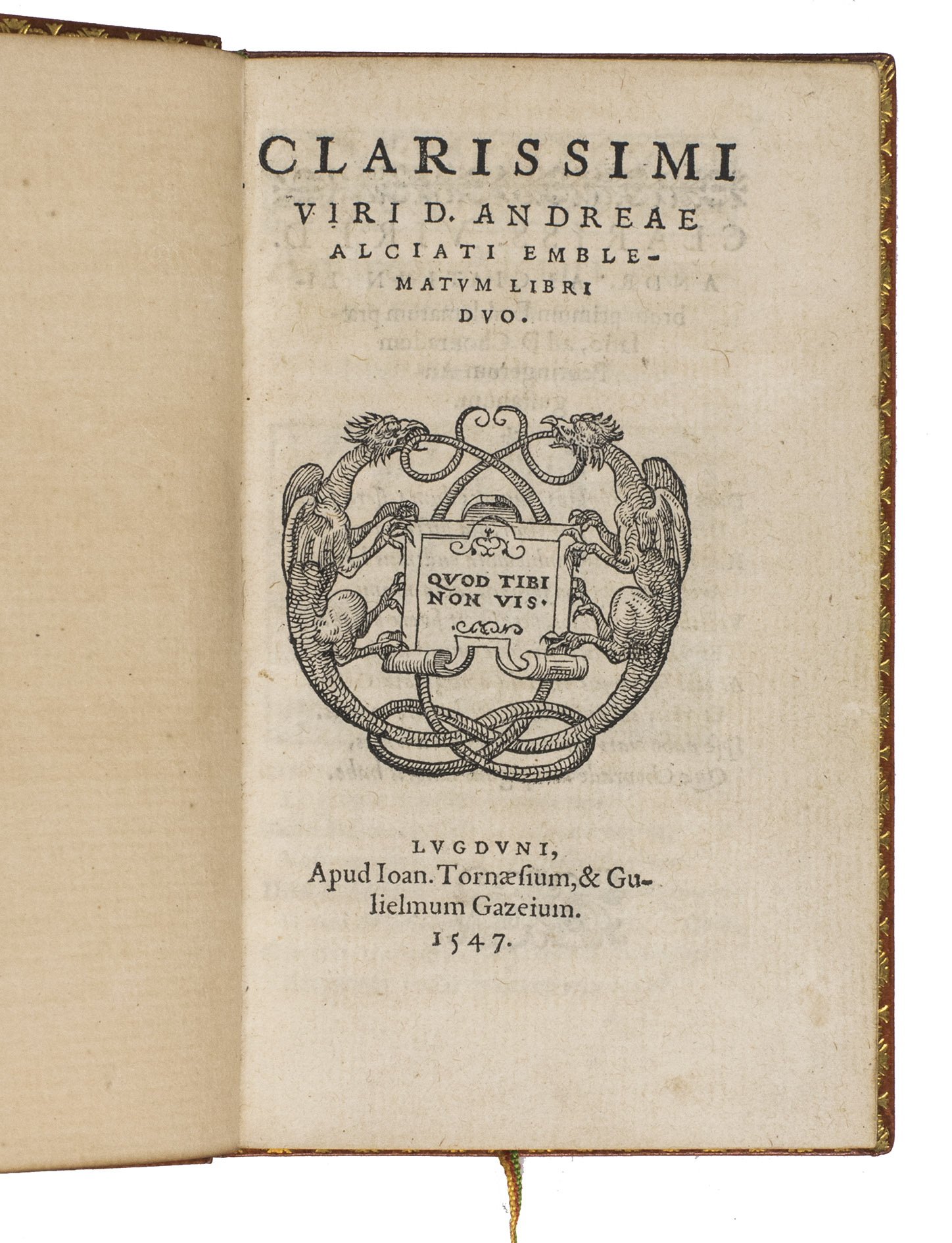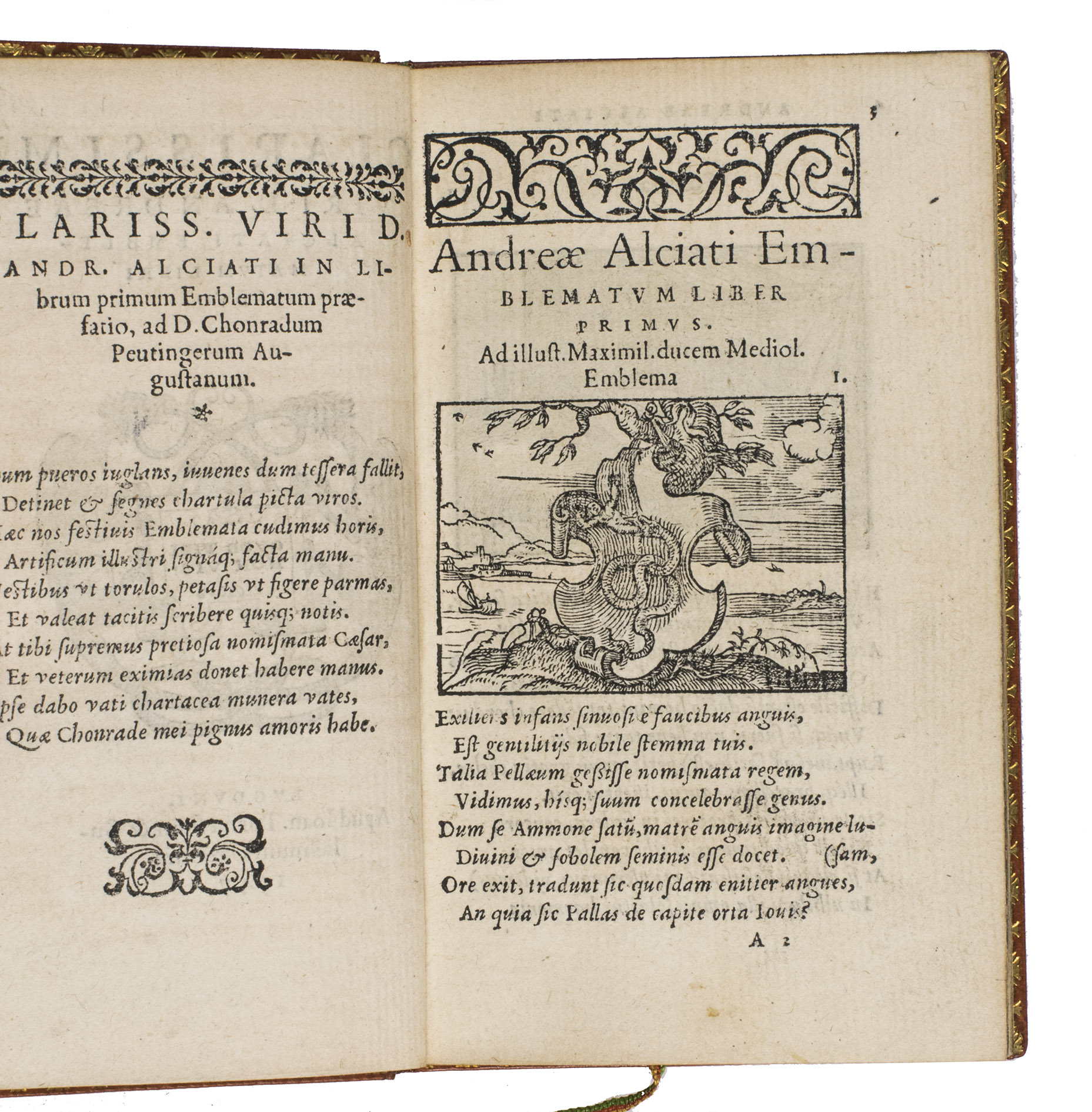 With the bookbinder's name (M LORTIC) tooled in gold at the foot of the front turn-in. The binding is in excellent condition. The front free flyleaf is detached, but still present, the work is lightly browned throughout, leaf B2 has been professionally restored. Otherwise in good condition. Adams et all, Bibliography of French emblem books, F.019; BM STC French, p. 8; Cartier I, p. 216-9 (nr. 72); Duplessis, 24; Green, Alciati, 29; Landwehr, Romanic emblem books, 34; Pettegree & Walsby, French vernacular book, 52395; Praz p. 249; USTC 124288 (6 copies); cf. Buisson, p. 16 (1549 ed.); Mortimer 17 (1580 ed.).