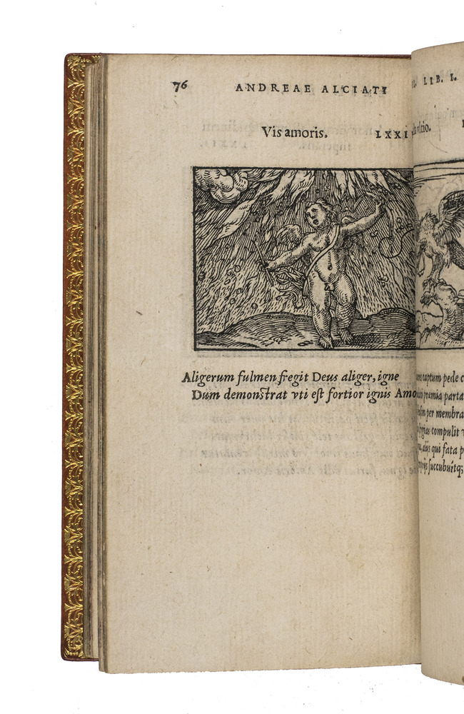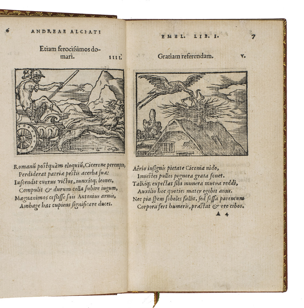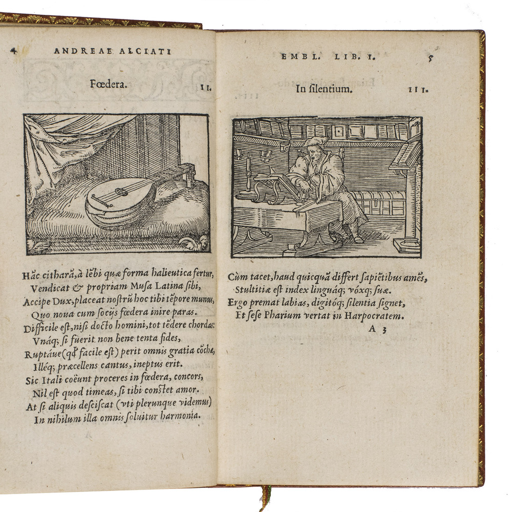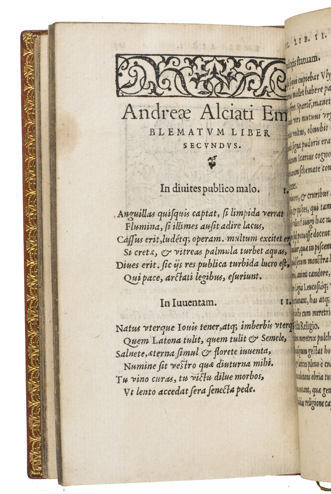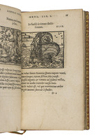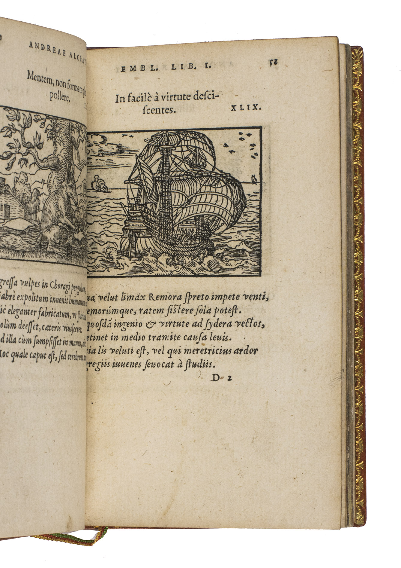 With the bookbinder's name (M LORTIC) tooled in gold at the foot of the front turn-in. The binding is in excellent condition. The front free flyleaf is detached, but still present, the work is lightly browned throughout, leaf B2 has been professionally restored. Otherwise in good condition. Adams et all, Bibliography of French emblem books, F.019; BM STC French, p. 8; Cartier I, p. 216-9 (nr. 72); Duplessis, 24; Green, Alciati, 29; Landwehr, Romanic emblem books, 34; Pettegree & Walsby, French vernacular book, 52395; Praz p. 249; USTC 124288 (6 copies); cf. Buisson, p. 16 (1549 ed.); Mortimer 17 (1580 ed.).