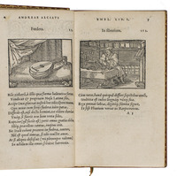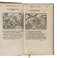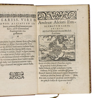 Rare first edition of the expanded Emblematum libellus, described as "the most skilful of the Alciati interpretations" (Mortimer). The present edition is the first to include the beautiful woodcut series made for De Tournes by Bernard Salomon (ca. 1506-1559), or "Le Petit Bernard". This series was published separately only one year before by the Aldine printing house in Venice. The present copy has been beautifully bound by the Parisian bookbinder Marcelin Lortic (1852-1928) for the library of the Prince d'Essling, Victor Masséna d'Essling et de Rivoli (1836-1910).
