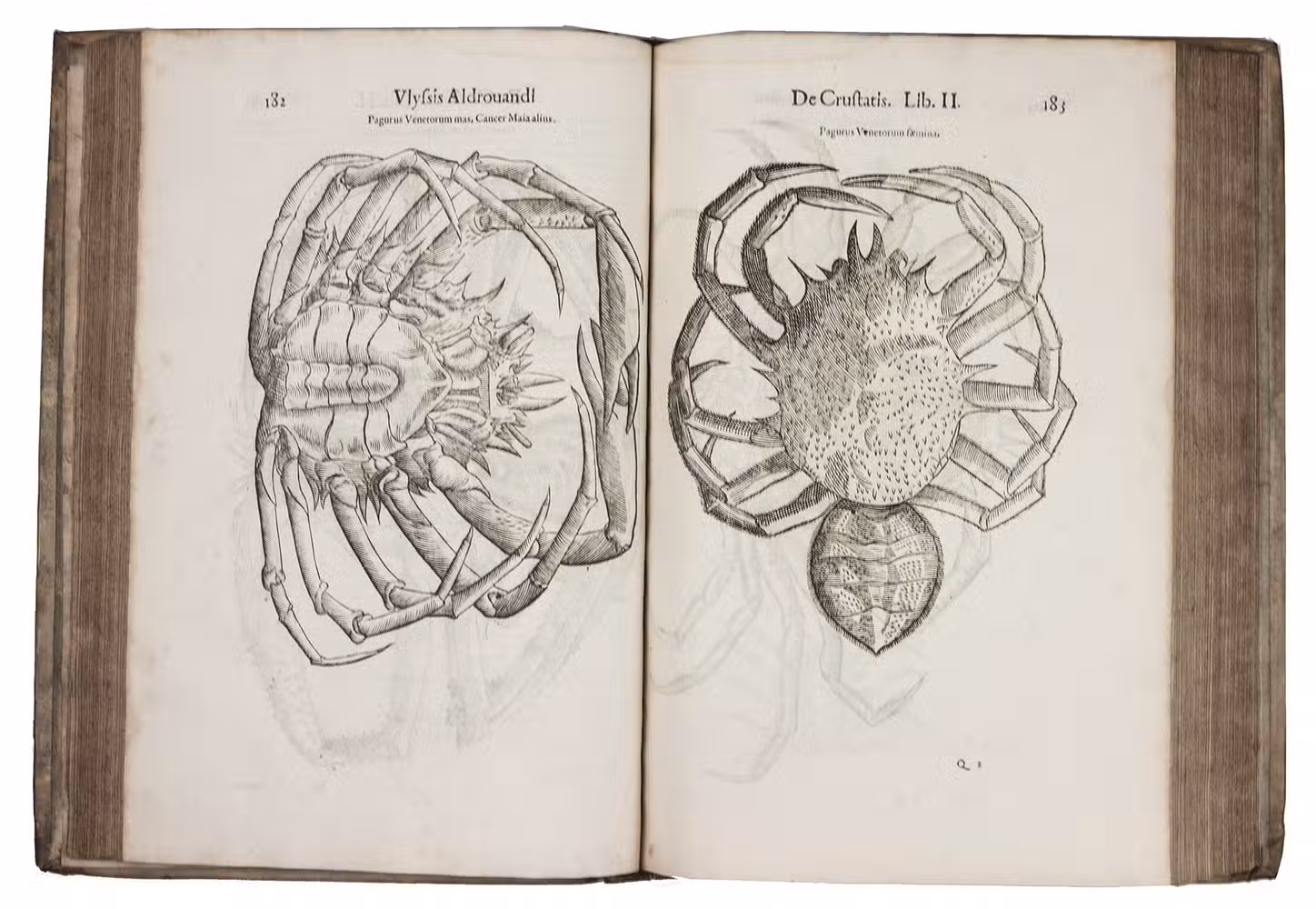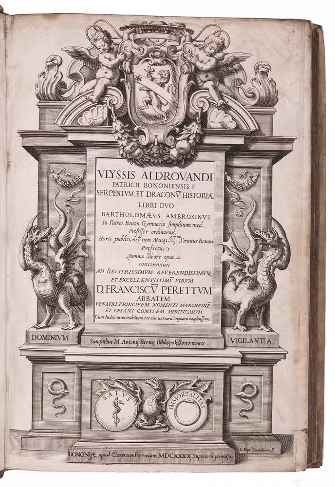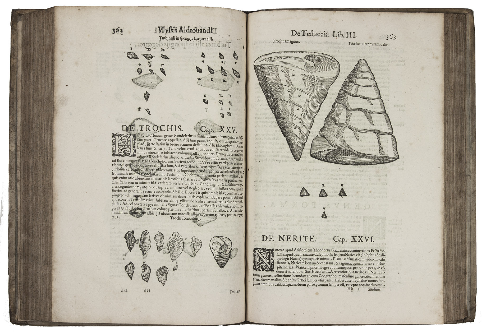 Ten first (1599-1668) and three later (1634-1638) editions forming the complete works of Ulisse Aldrovandi (1522-1605), an Italian botanist, pharmacologist and a professor of botany at the university of Bologna. This massive encyclopaedia, most volumes published posthumously, was based on natural history specimens and drawings in Aldrovandi's own museum in Bologna. Already in the 1570s he welcomed visitors from near and far to his museum and at his death in 1605 he left it to the city of Bologna, making it the first institutional herbarium.