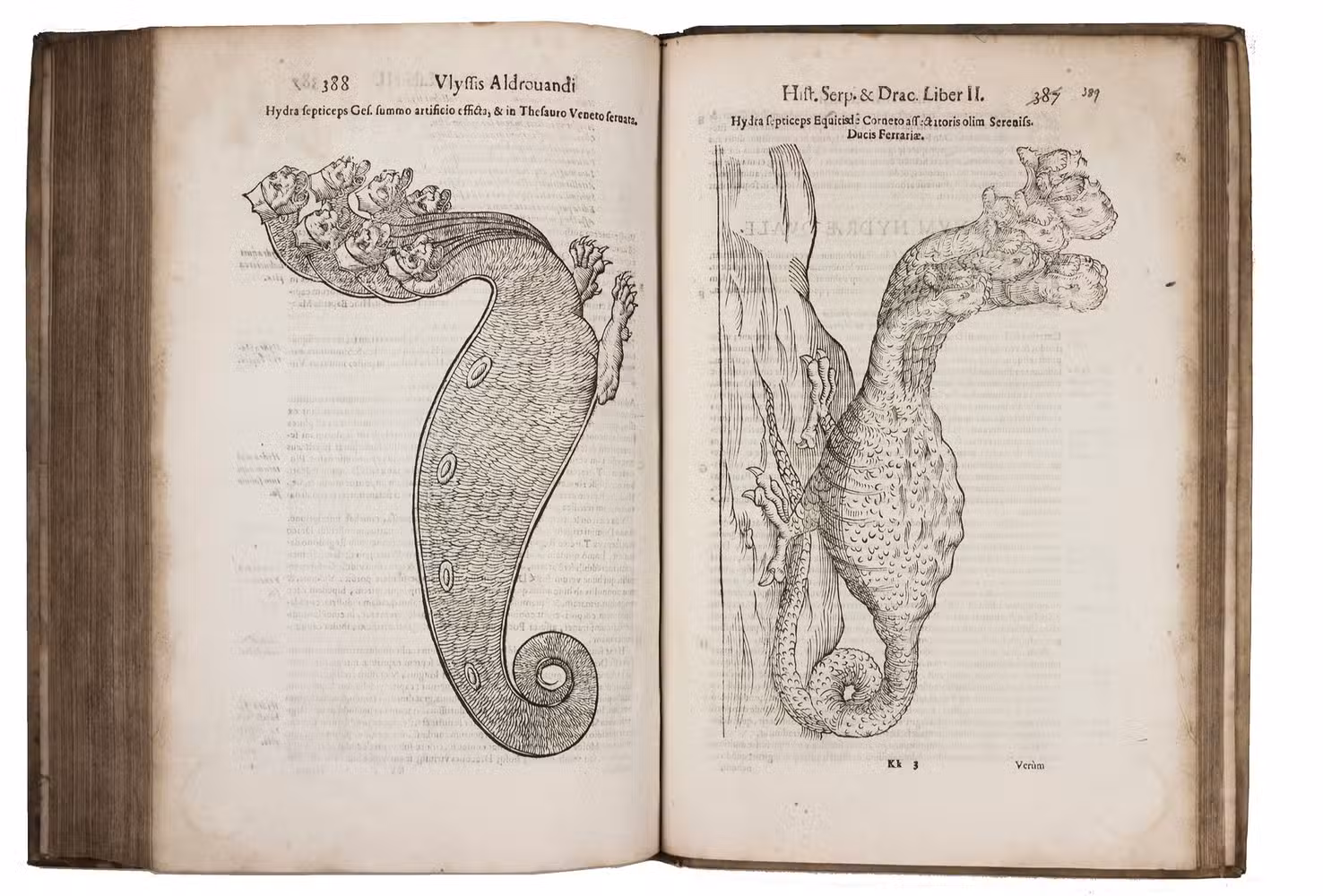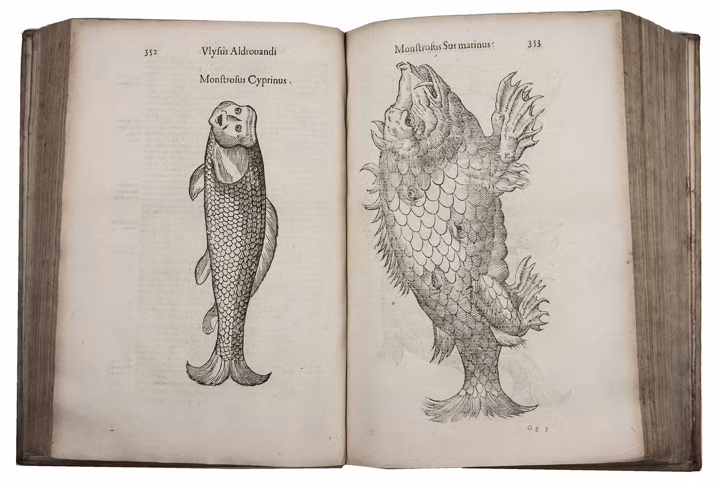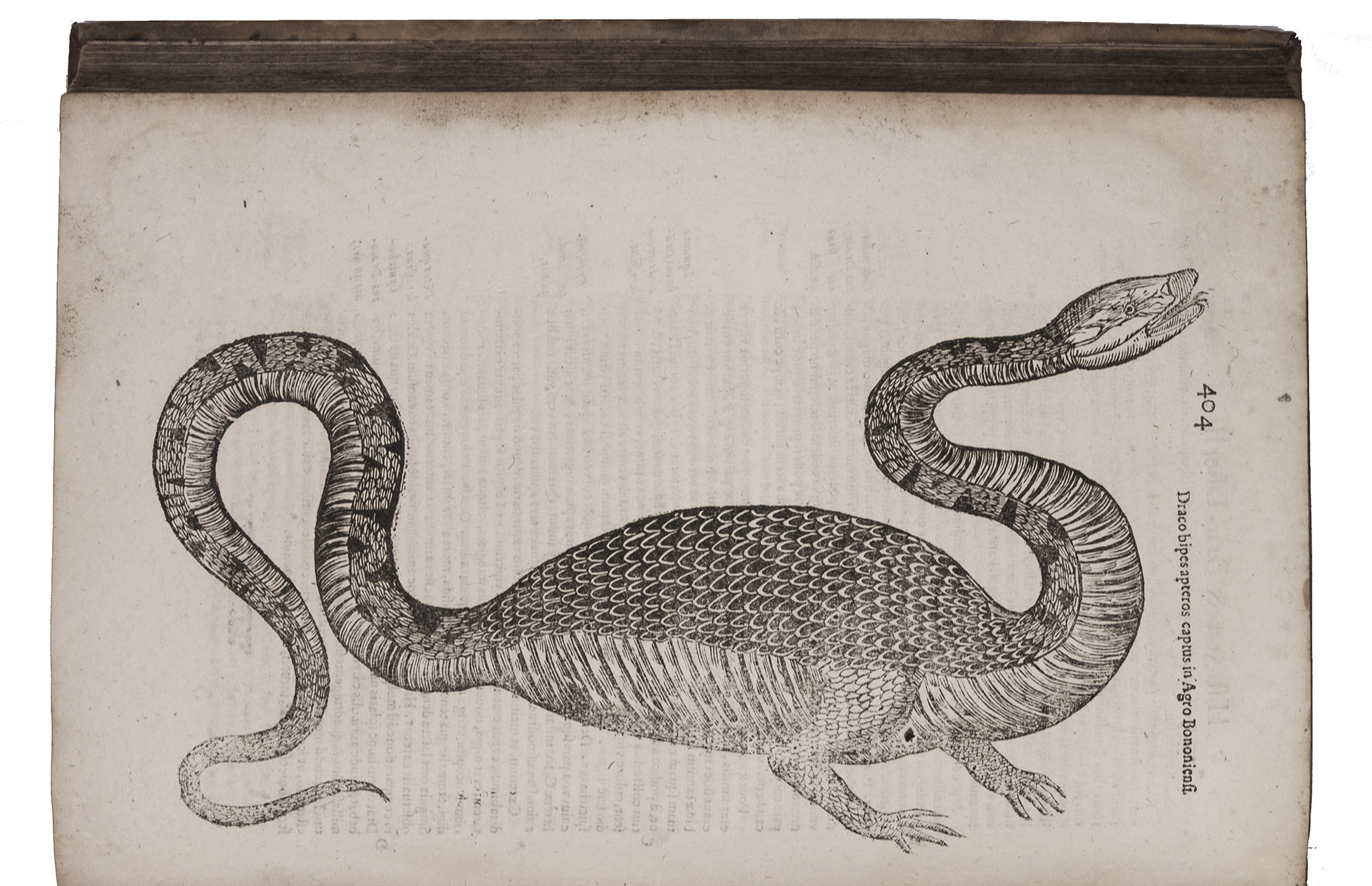 Ten first (1599-1668) and three later (1634-1638) editions forming the complete works of Ulisse Aldrovandi (1522-1605), an Italian botanist, pharmacologist and a professor of botany at the university of Bologna. This massive encyclopaedia, most volumes published posthumously, was based on natural history specimens and drawings in Aldrovandi's own museum in Bologna. Already in the 1570s he welcomed visitors from near and far to his museum and at his death in 1605 he left it to the city of Bologna, making it the first institutional herbarium.