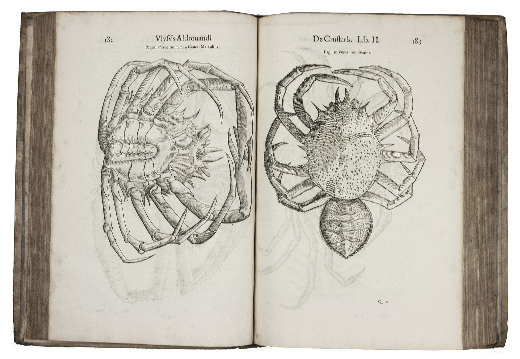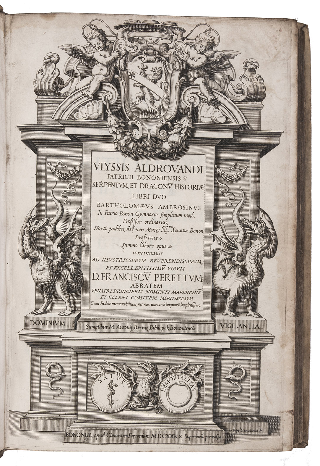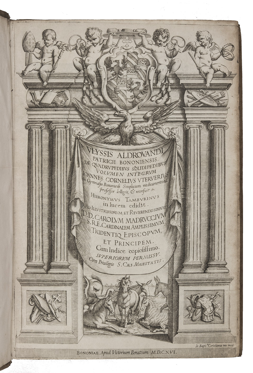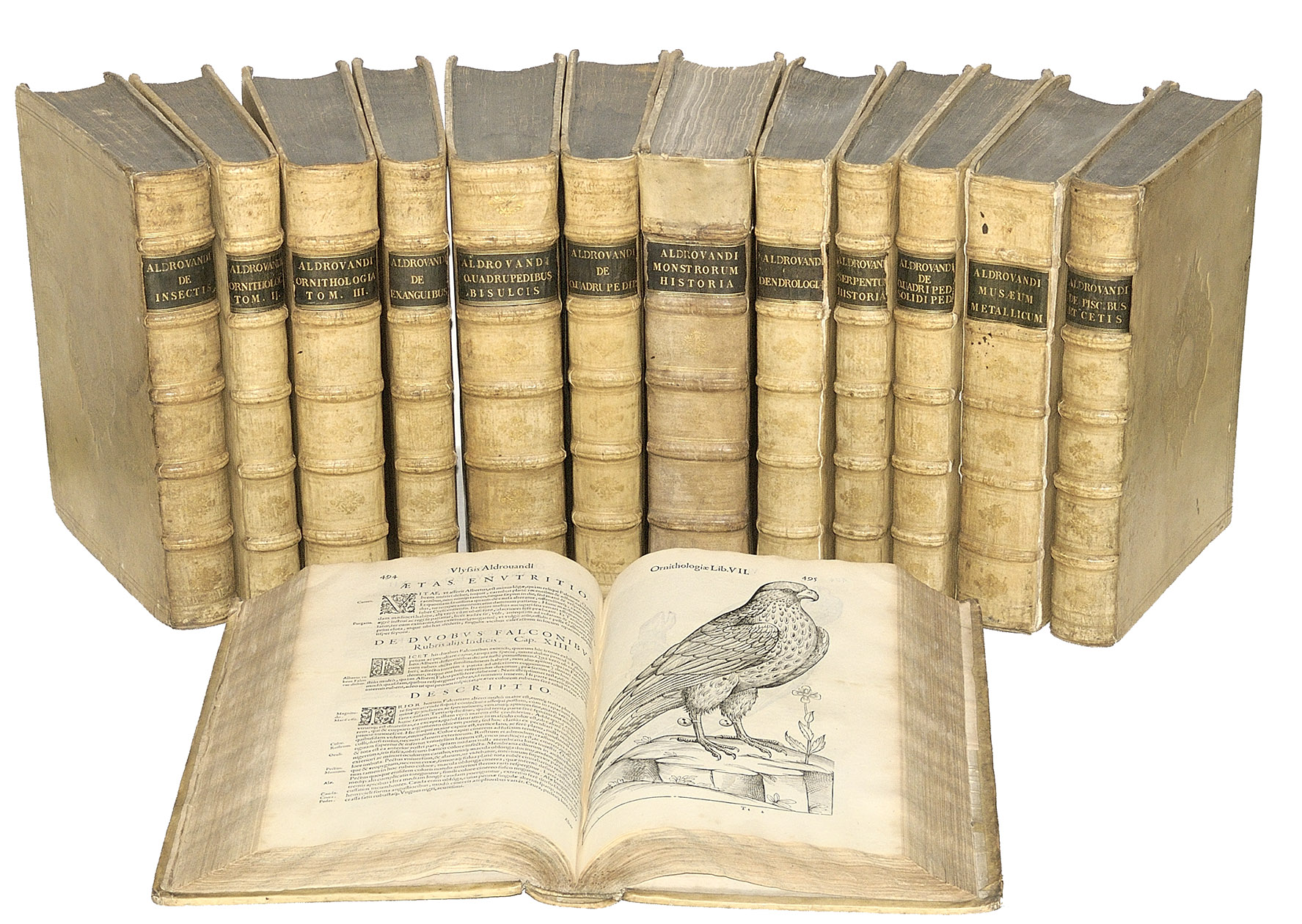 Bologna, 1599-1668. 13 volumes. Folio (35 x 24 cm). With an engraved title page to each volume, an engraved full-page portrait of Aldrovandi in 3 volumes and several thousand woodcut illustrations in the text, mostly after designs by J. Ligozzi and many full-page. Blind-tooled vellum (ca. 1645 & ca. 1670), with a large centrepiece on each board (the 11 volumes dated 1599-1642 from a single block; the 2 volumes dated 1648 & 1667 from a different block), the spines uniformly gold-tooled in the 18th-century.