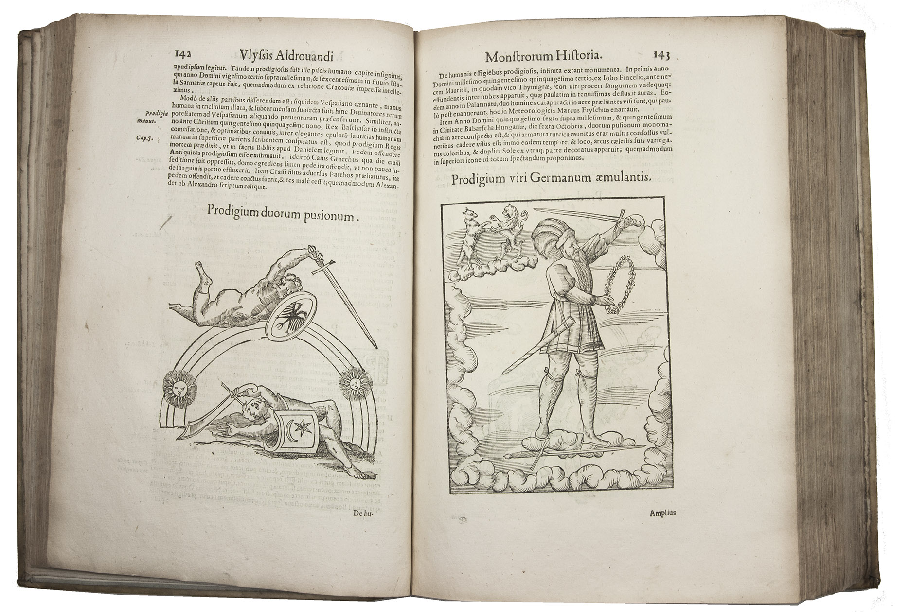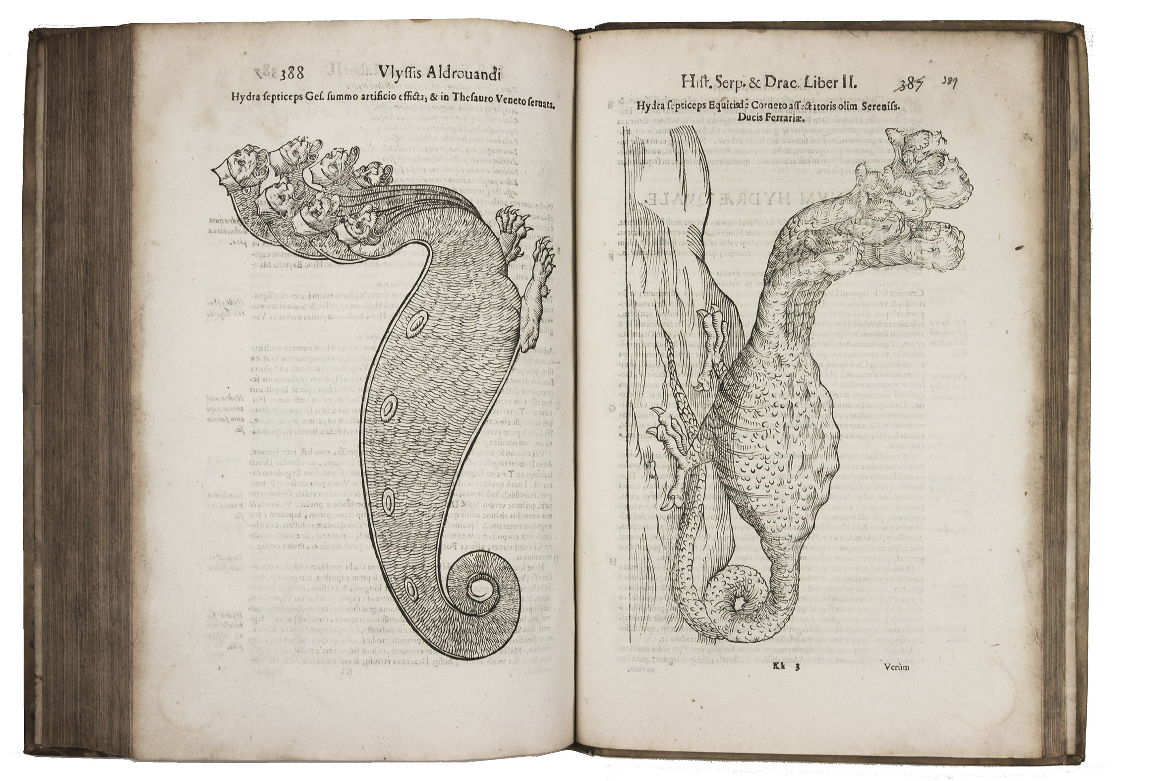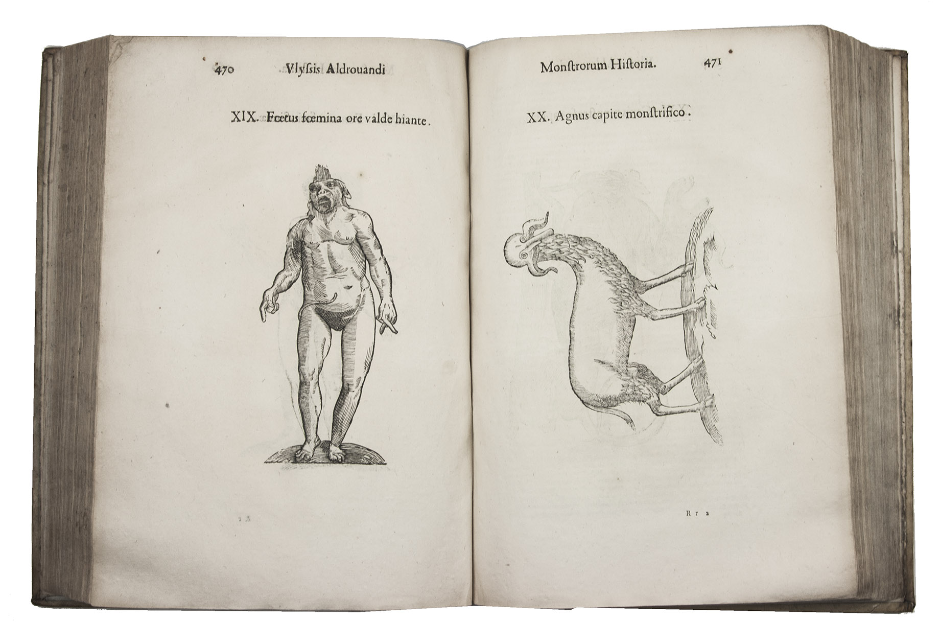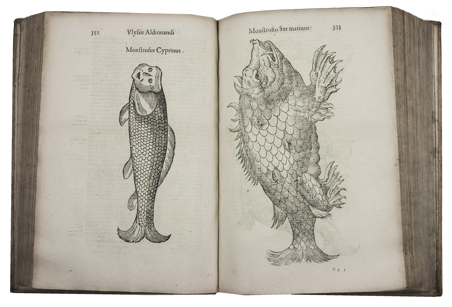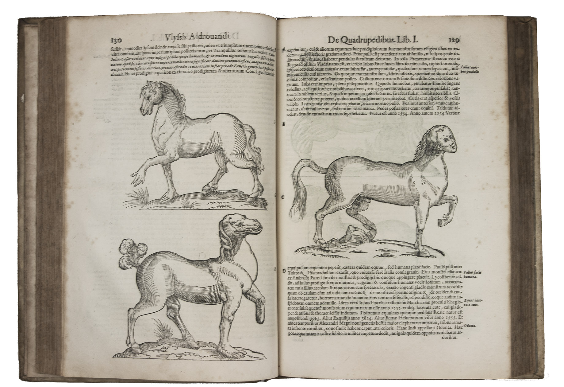 Bologna, 1599-1668. 13 volumes. Folio (35 x 24 cm). With an engraved title page to each volume, an engraved full-page portrait of Aldrovandi in 3 volumes and several thousand woodcut illustrations in the text, mostly after designs by J. Ligozzi and many full-page. Blind-tooled vellum (ca. 1645 & ca. 1670), with a large centrepiece on each board (the 11 volumes dated 1599-1642 from a single block; the 2 volumes dated 1648 & 1667 from a different block), the spines uniformly gold-tooled in the 18th-century.