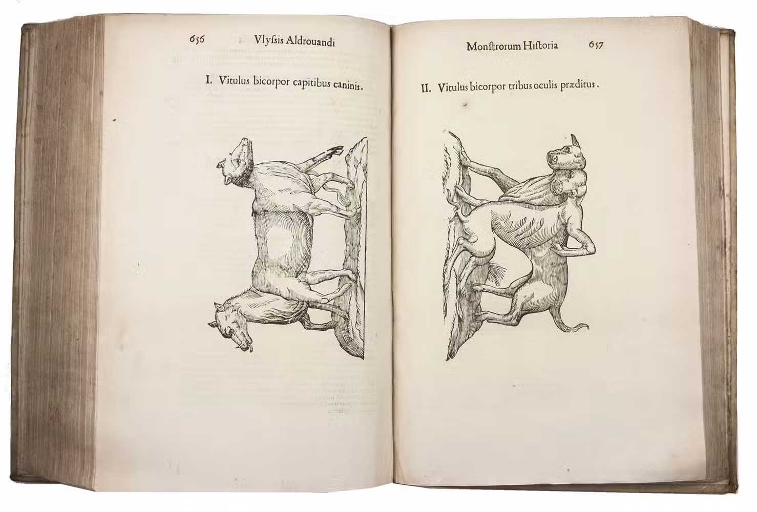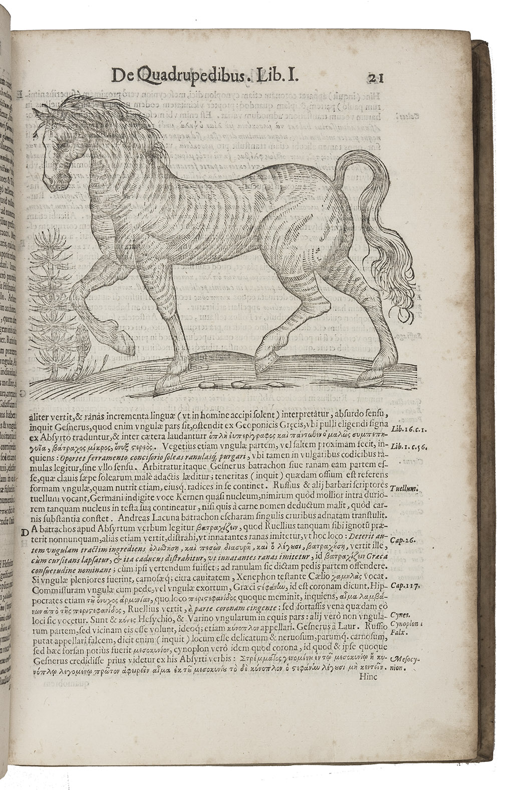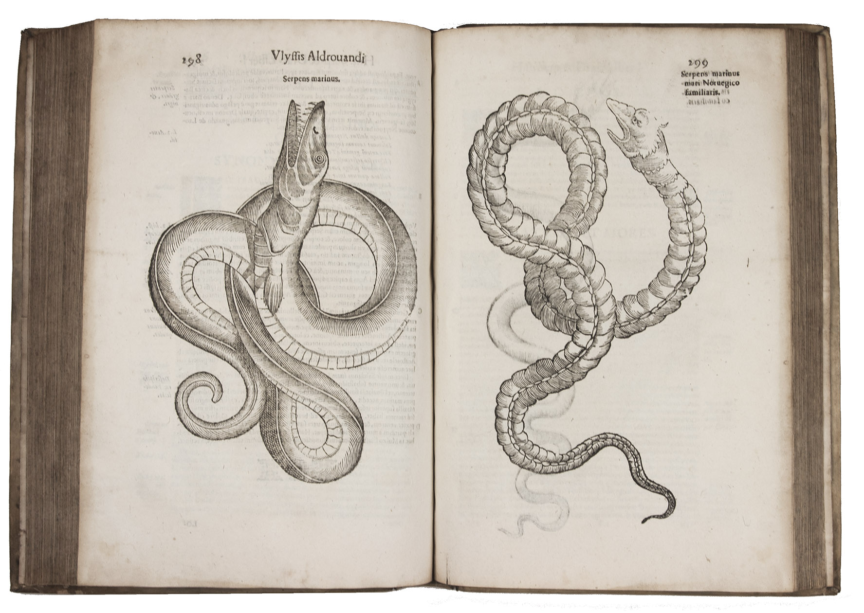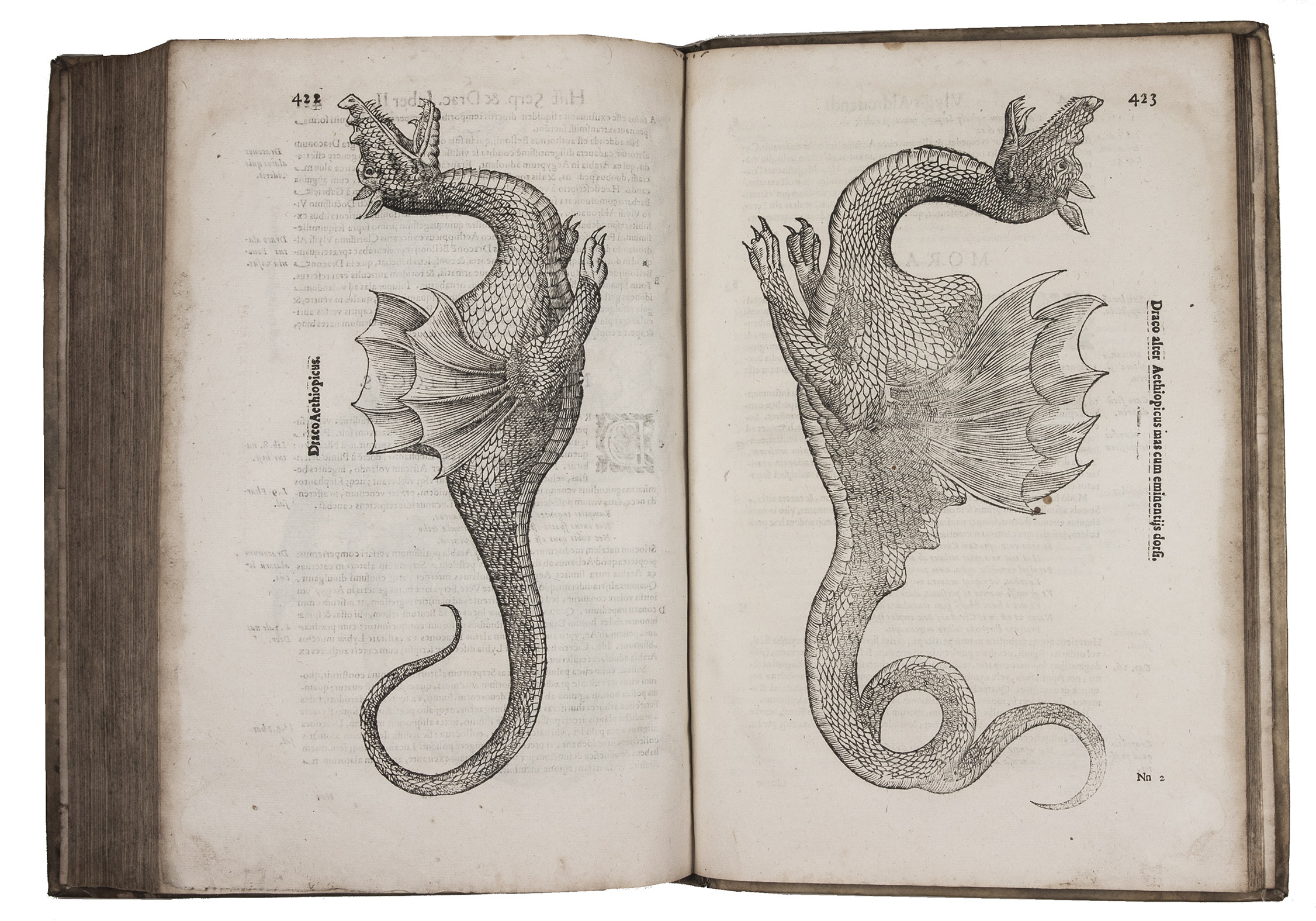 Bologna, 1599-1668. 13 volumes. Folio (35 x 24 cm). With an engraved title page to each volume, an engraved full-page portrait of Aldrovandi in 3 volumes and several thousand woodcut illustrations in the text, mostly after designs by J. Ligozzi and many full-page. Blind-tooled vellum (ca. 1645 & ca. 1670), with a large centrepiece on each board (the 11 volumes dated 1599-1642 from a single block; the 2 volumes dated 1648 & 1667 from a different block), the spines uniformly gold-tooled in the 18th-century.