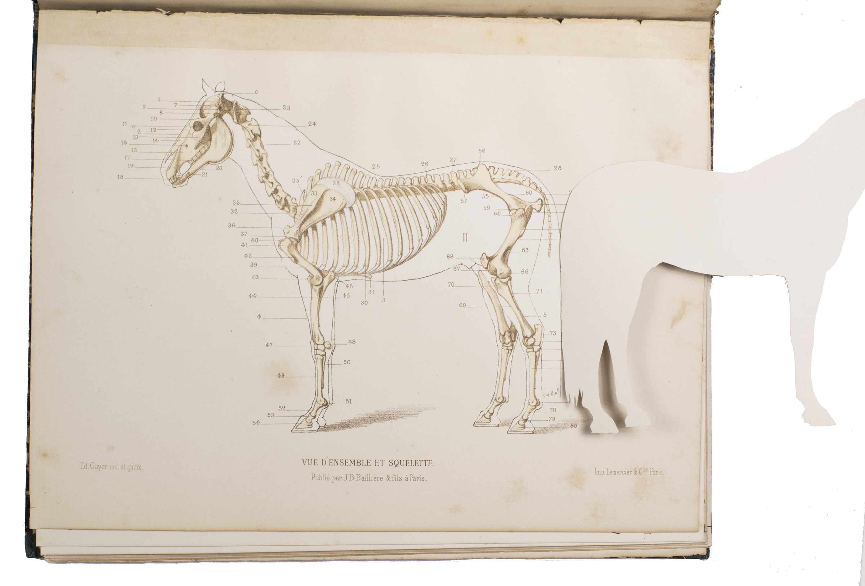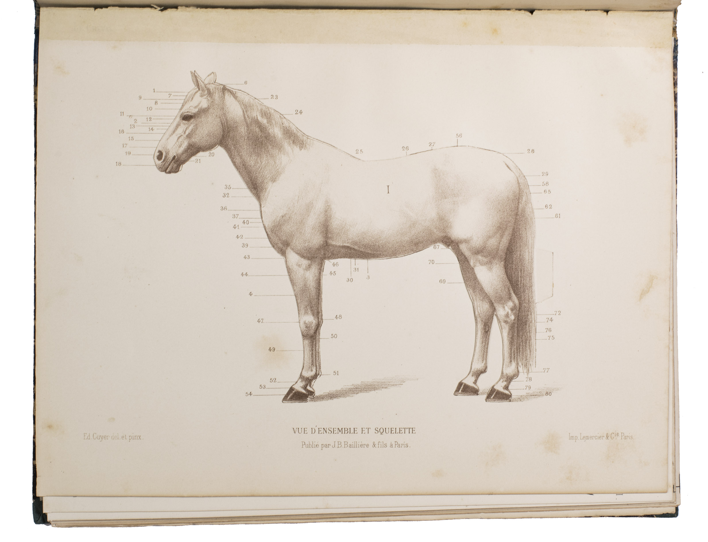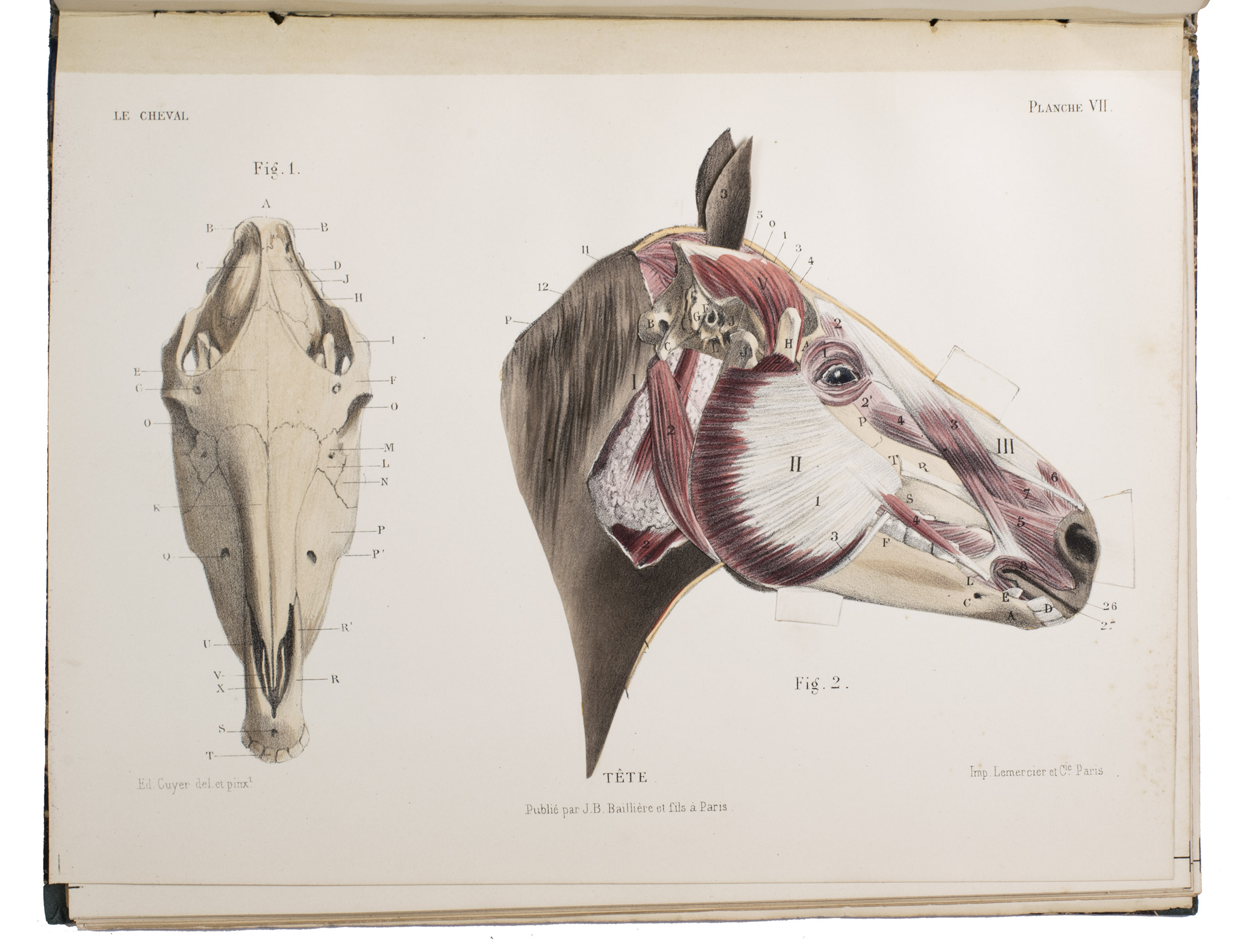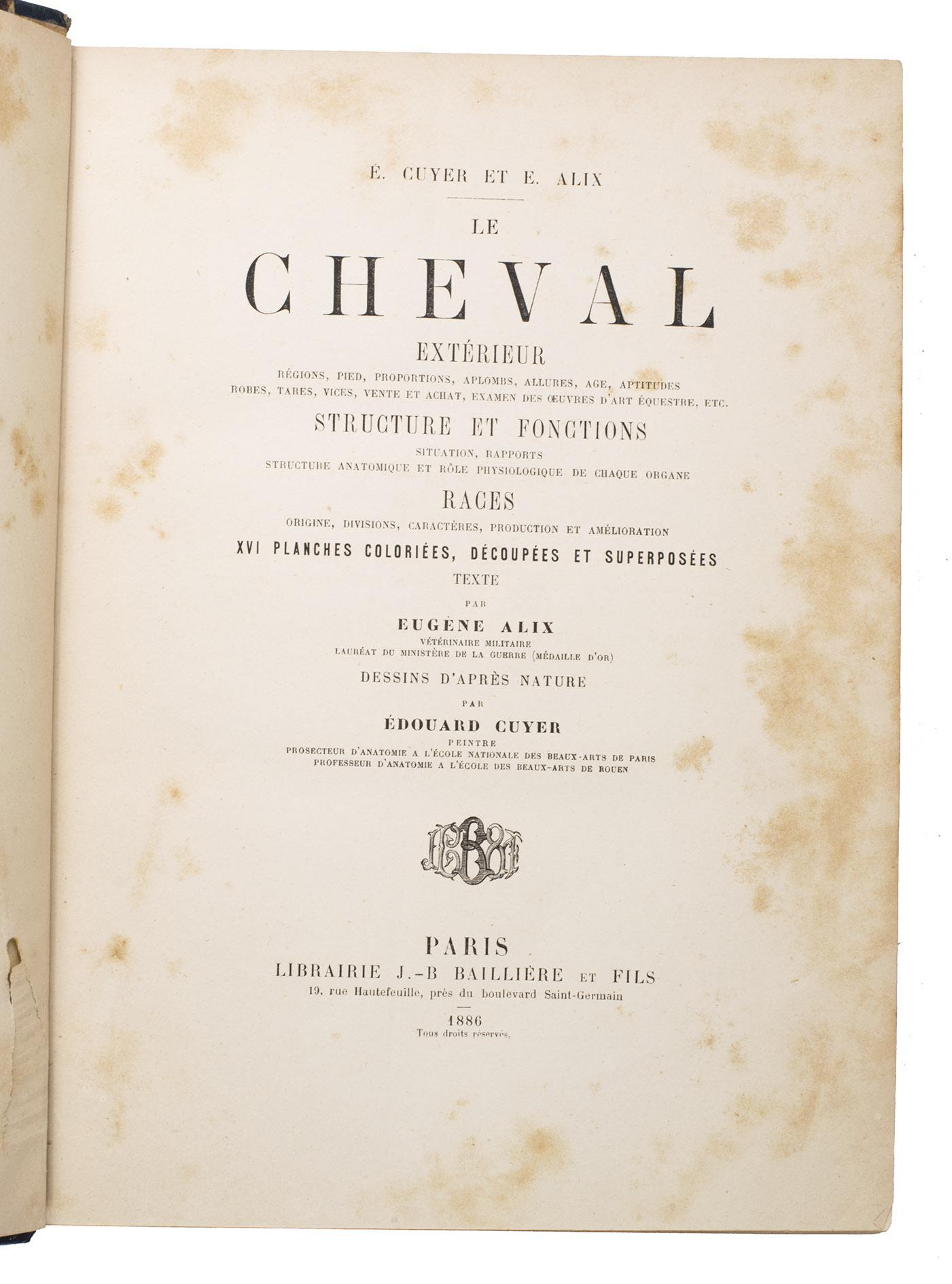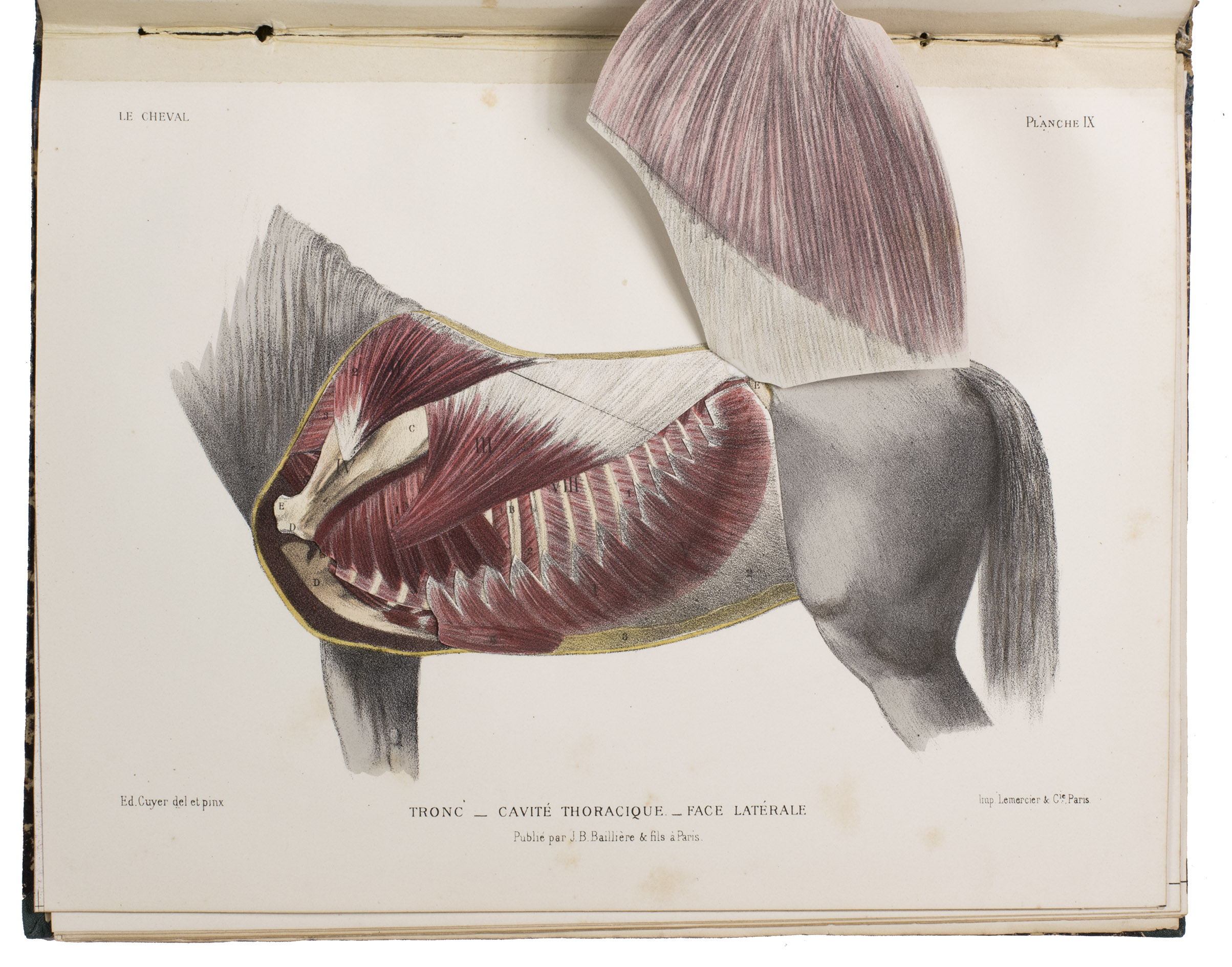 Elaborately illustrated and encyclopaedic work on horses by the veterinarian Eugène Alix (dates unknown). All aspects of the horse are described, for example their appearance, different races, their reproduction, their entire anatomy and organs, etc. It is illustrated with anatomical colour plates containing movable parts by Édouard Cuyer (1852-?), painter and anatomist at the National Art Academy at Paris and professor in anatomy at the Art Academy at Rouen.