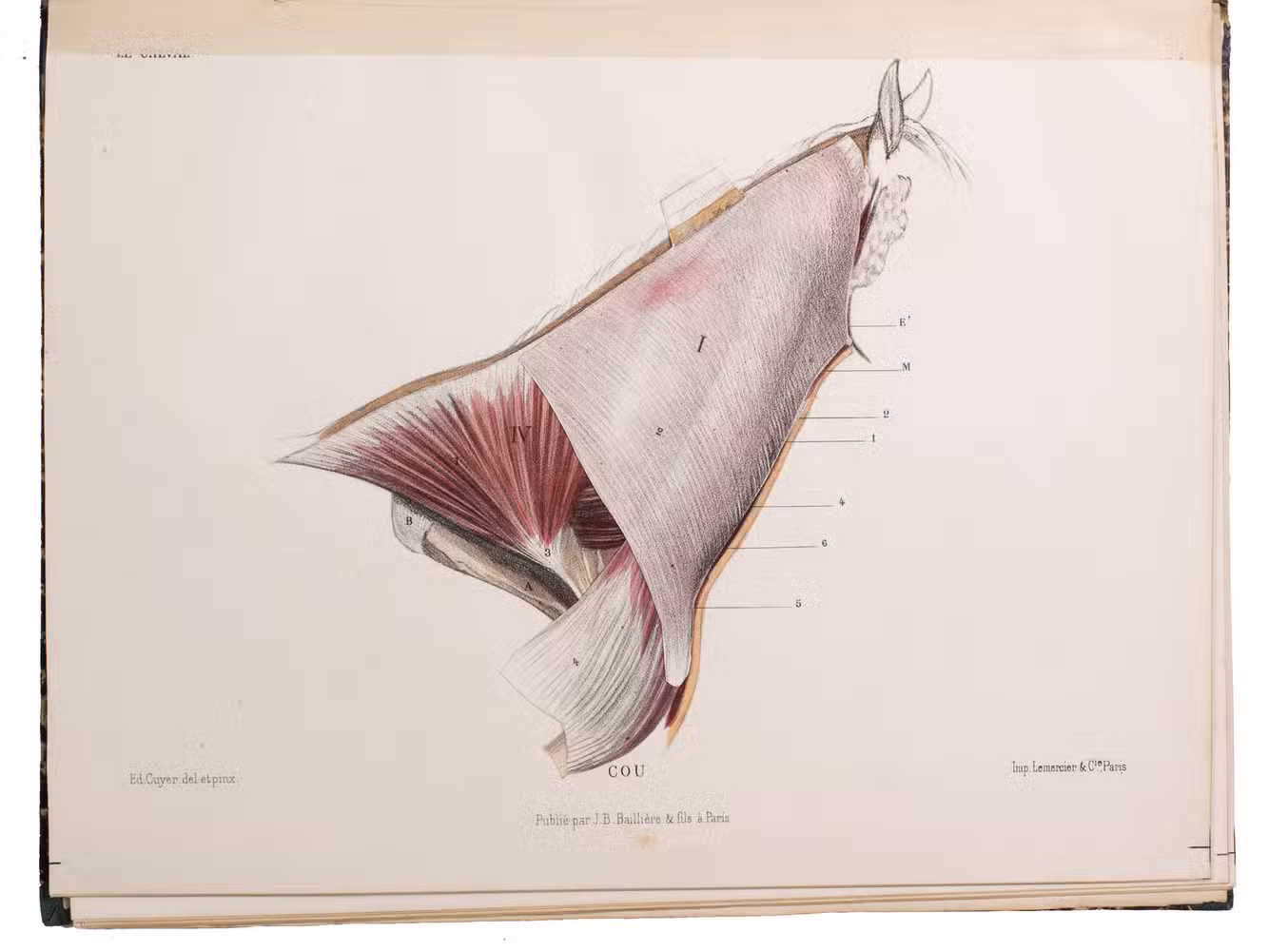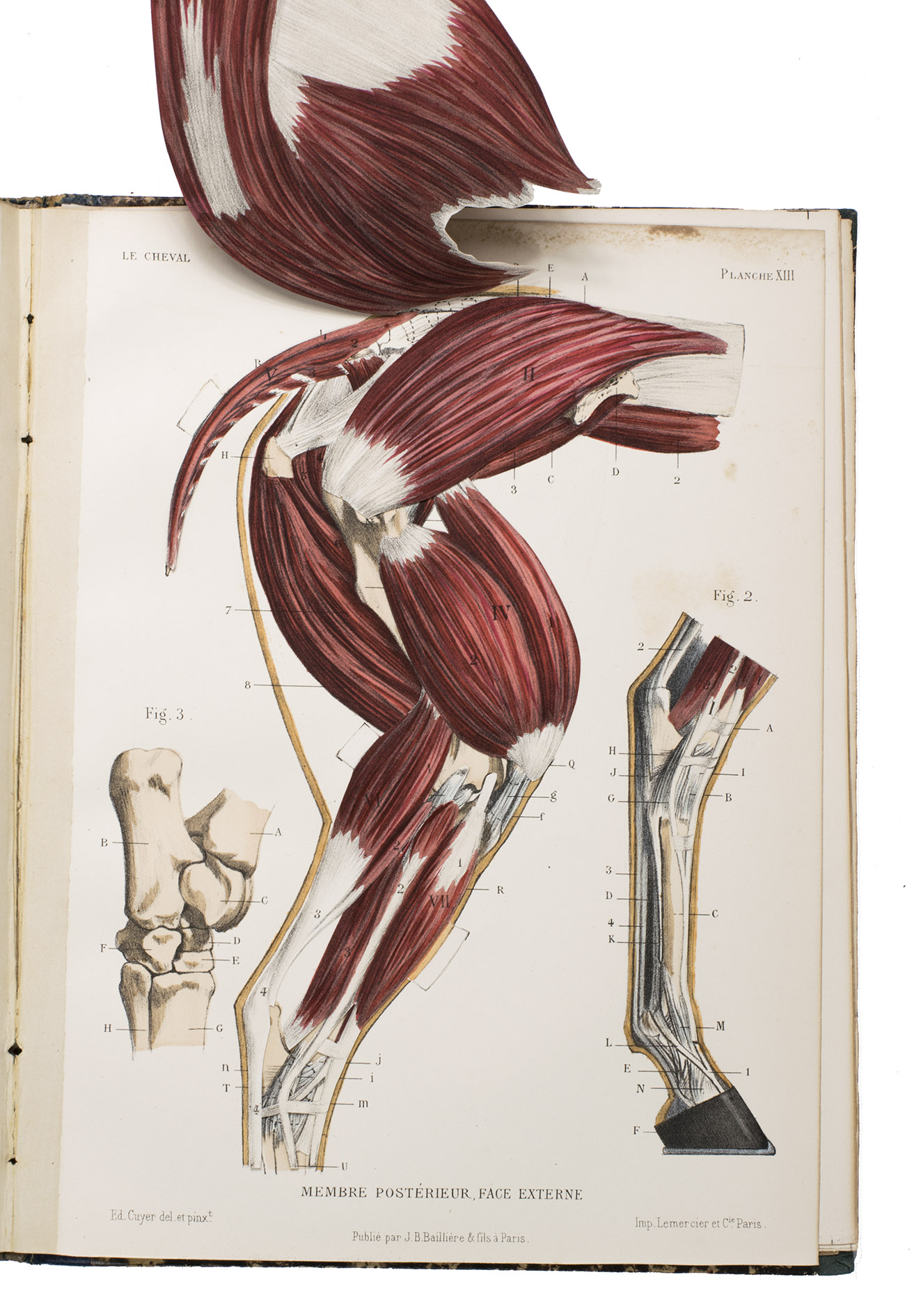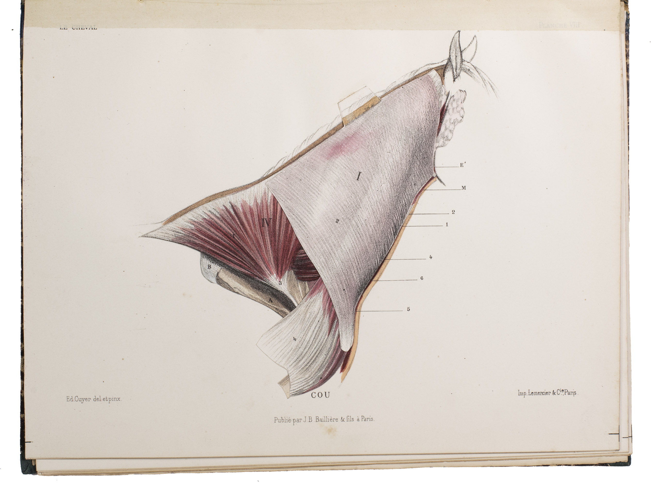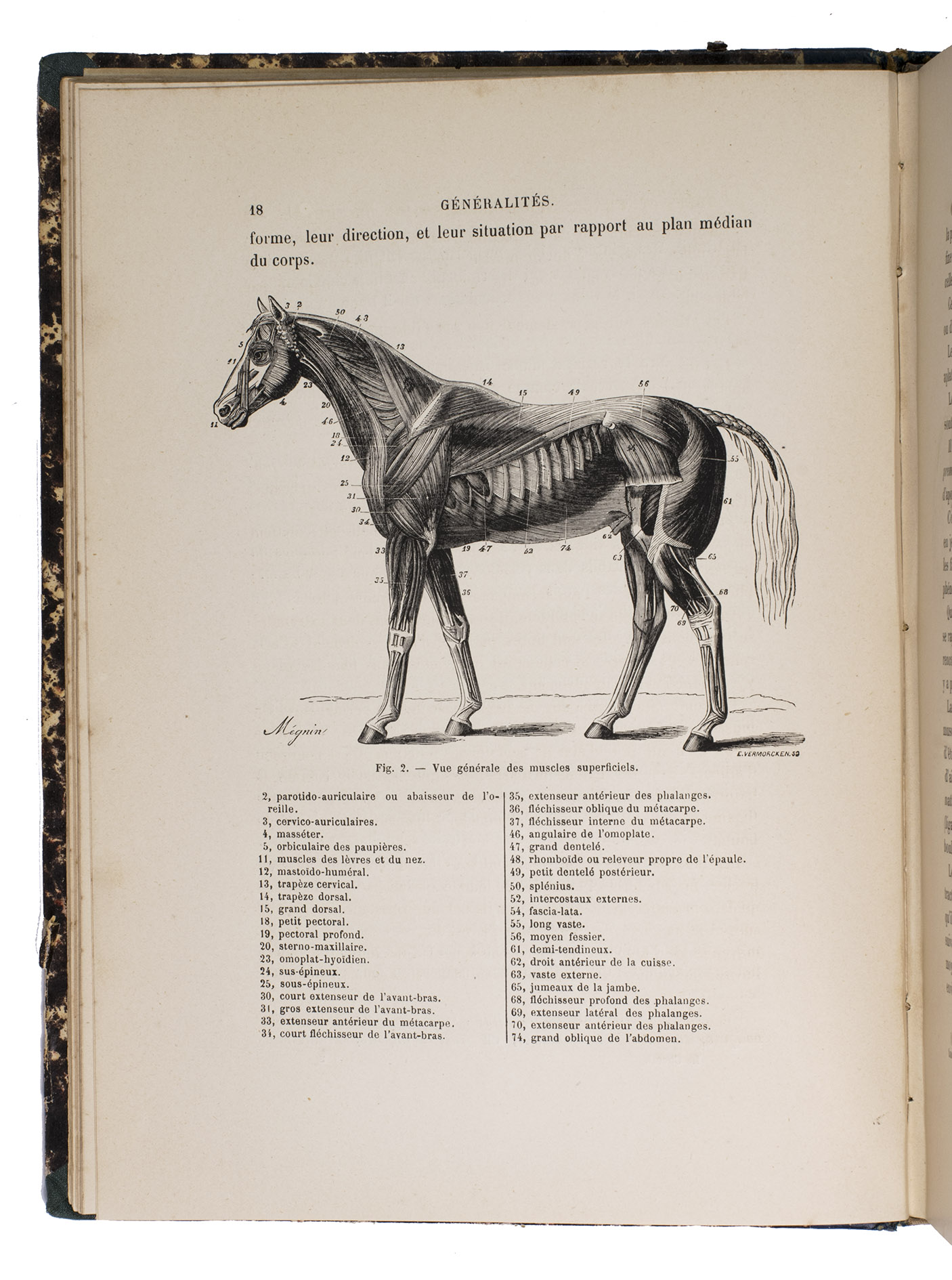 Elaborately illustrated and encyclopaedic work on horses by the veterinarian Eugène Alix (dates unknown). All aspects of the horse are described, for example their appearance, different races, their reproduction, their entire anatomy and organs, etc. It is illustrated with anatomical colour plates containing movable parts by Édouard Cuyer (1852-?), painter and anatomist at the National Art Academy at Paris and professor in anatomy at the Art Academy at Rouen.