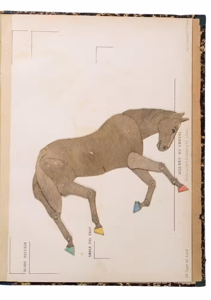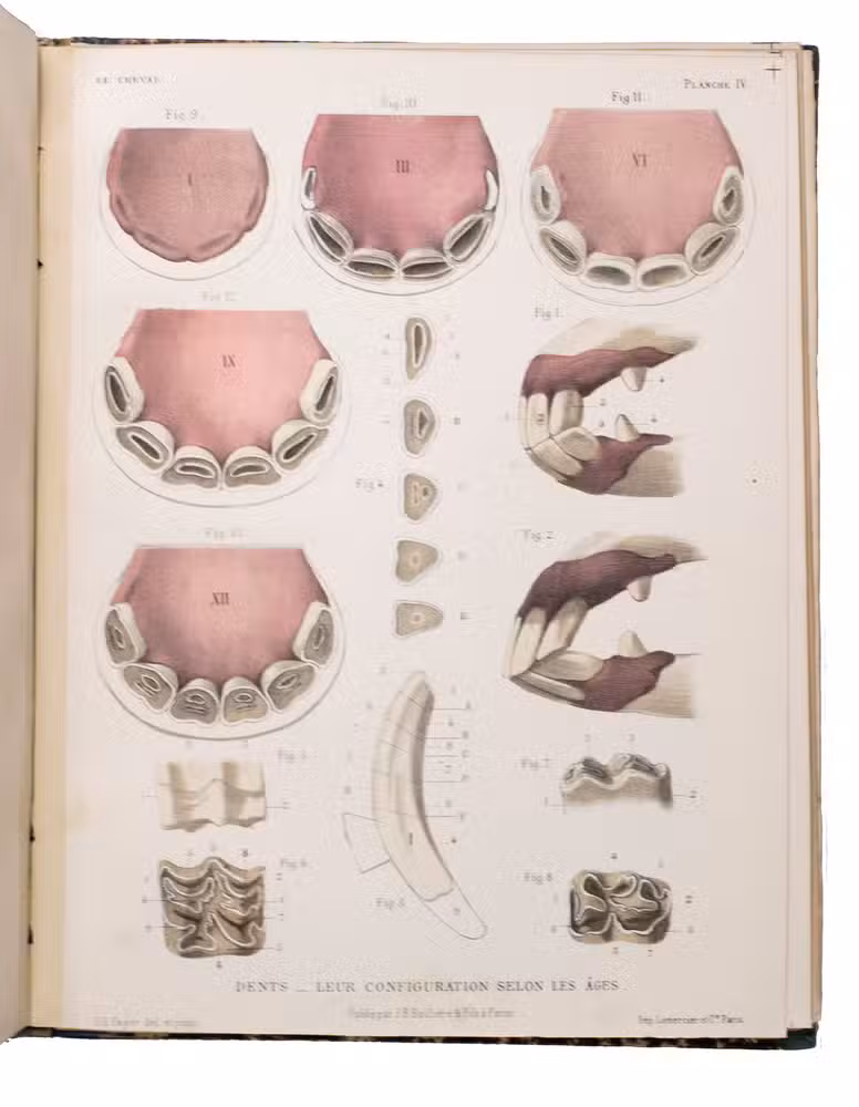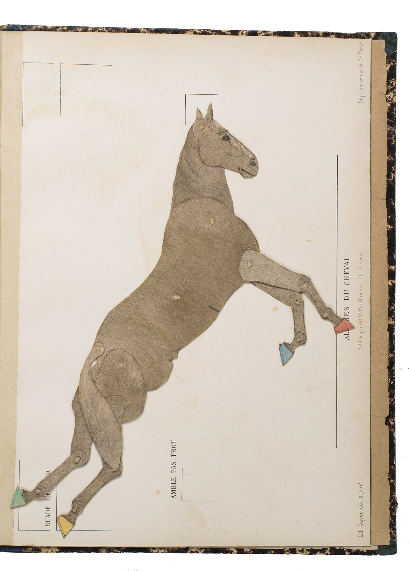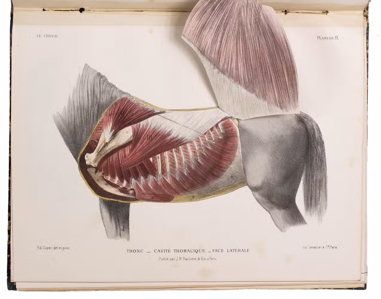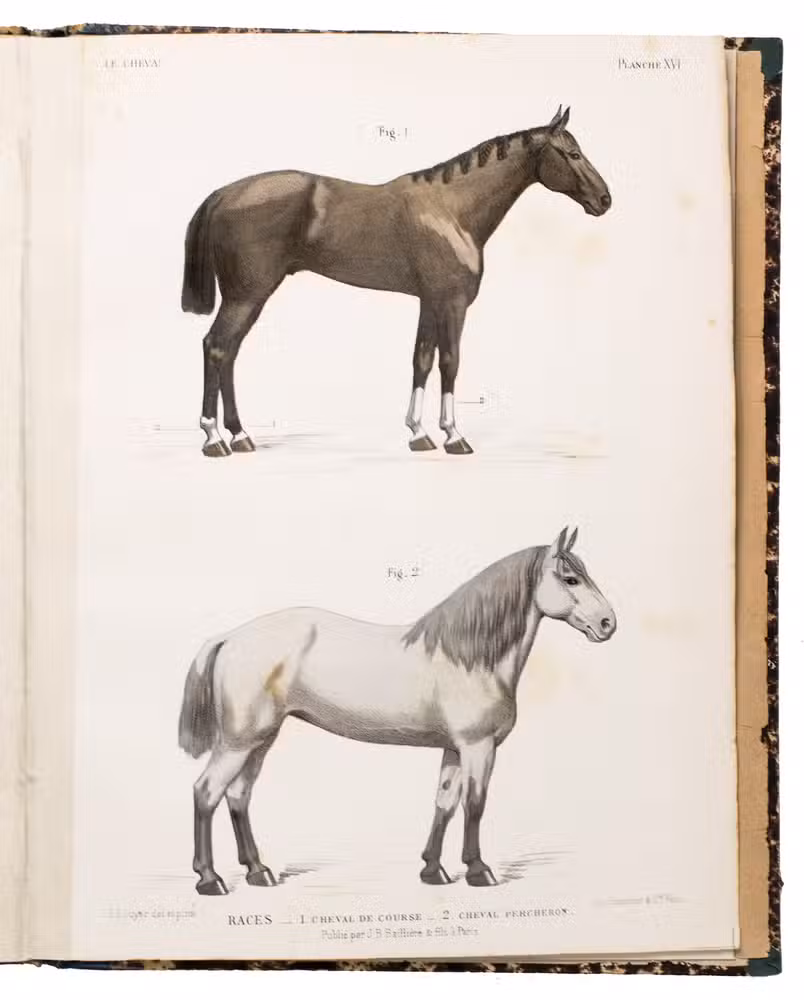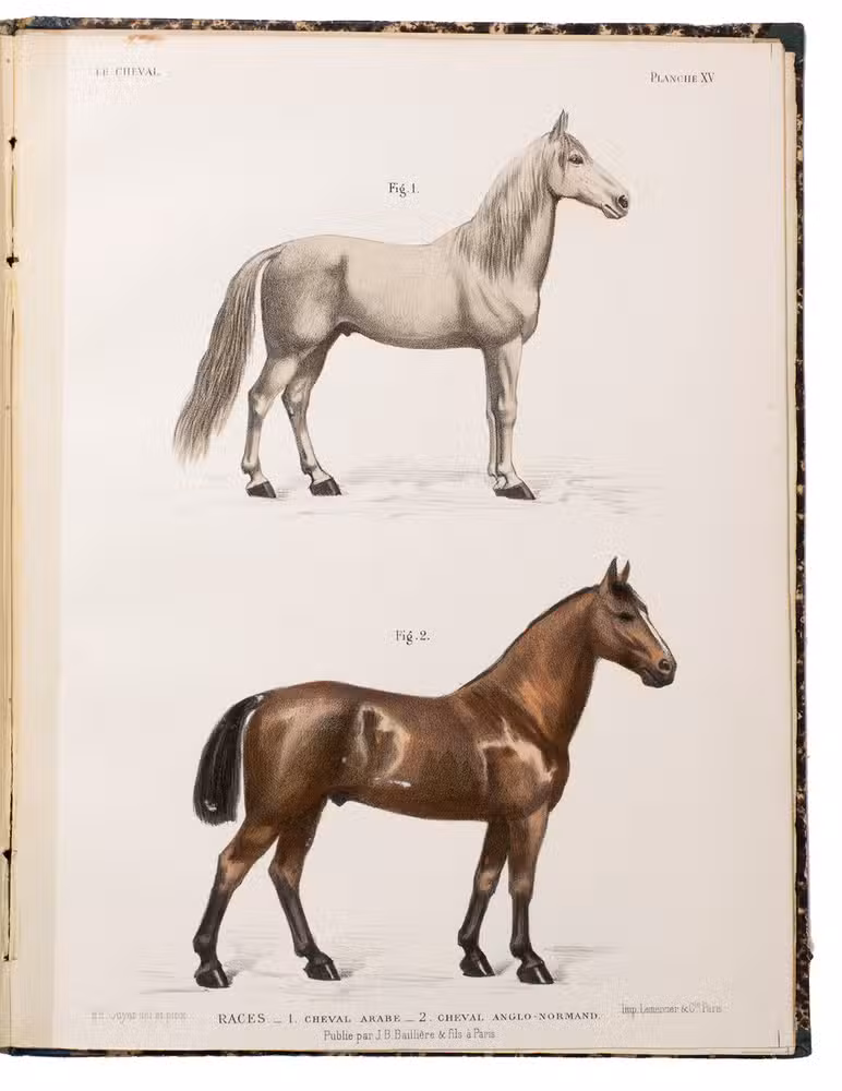 Elaborately illustrated and encyclopaedic work on horses by the veterinarian Eugène Alix (dates unknown). All aspects of the horse are described, for example their appearance, different races, their reproduction, their entire anatomy and organs, etc. It is illustrated with anatomical colour plates containing movable parts by Édouard Cuyer (1852-?), painter and anatomist at the National Art Academy at Paris and professor in anatomy at the Art Academy at Rouen.
