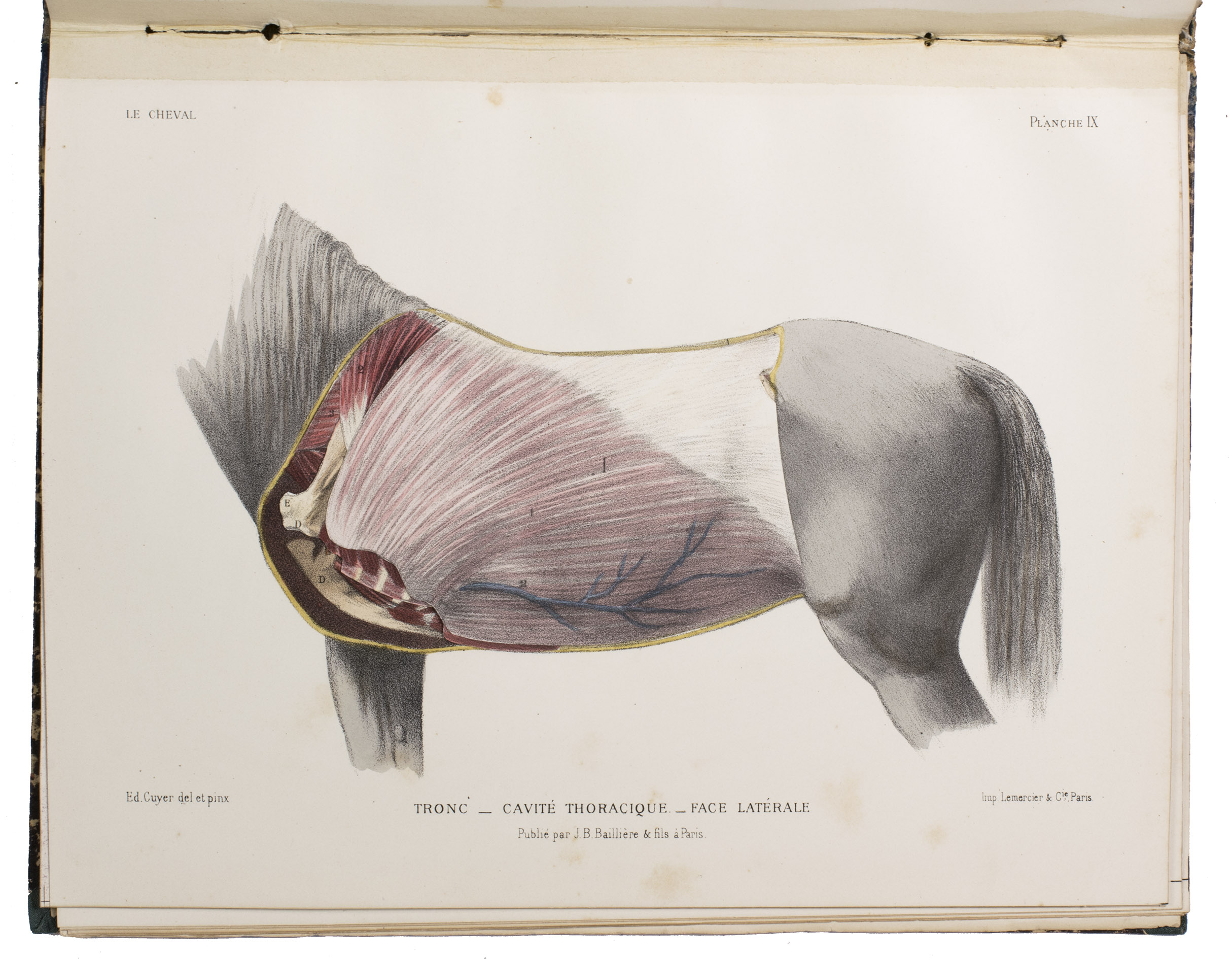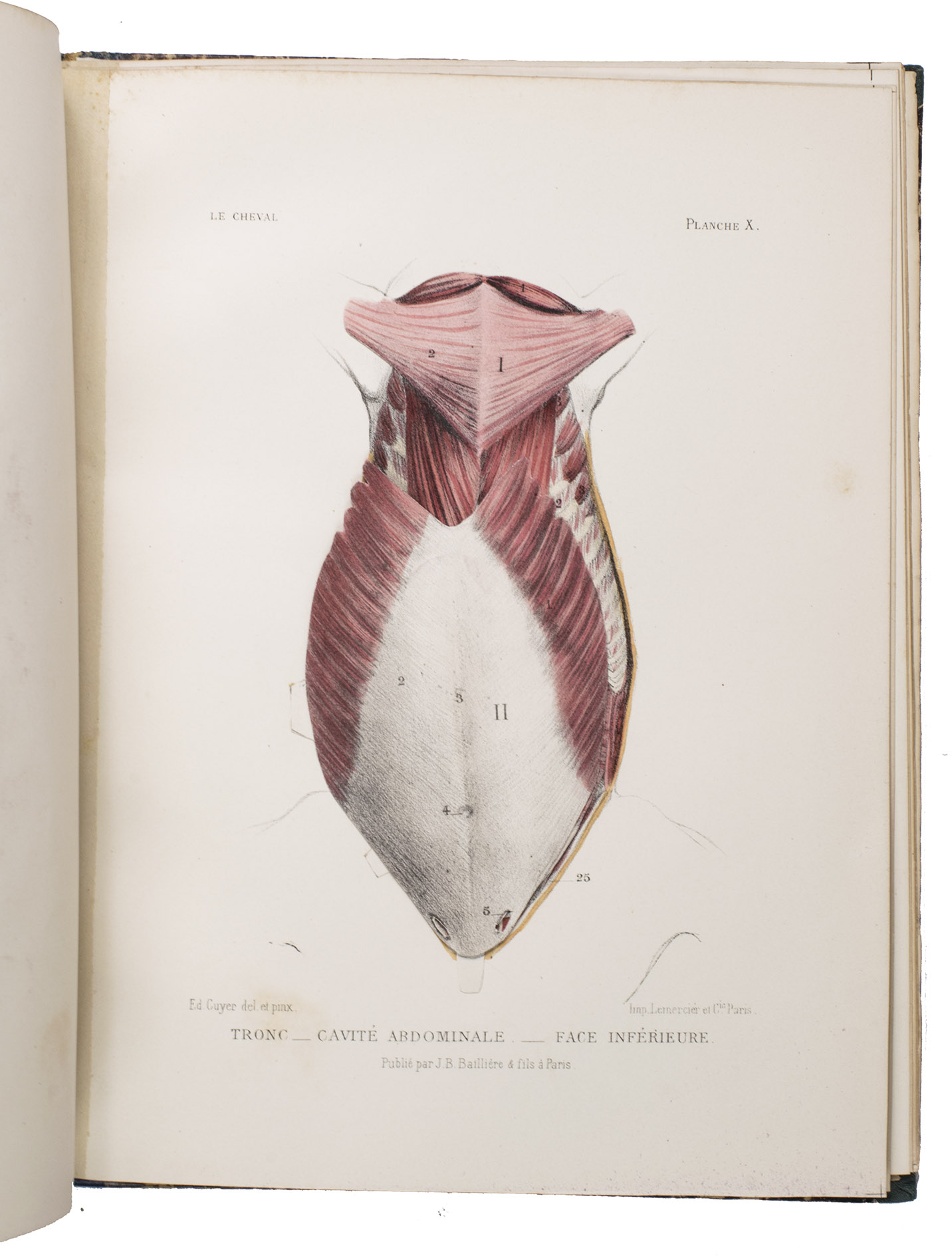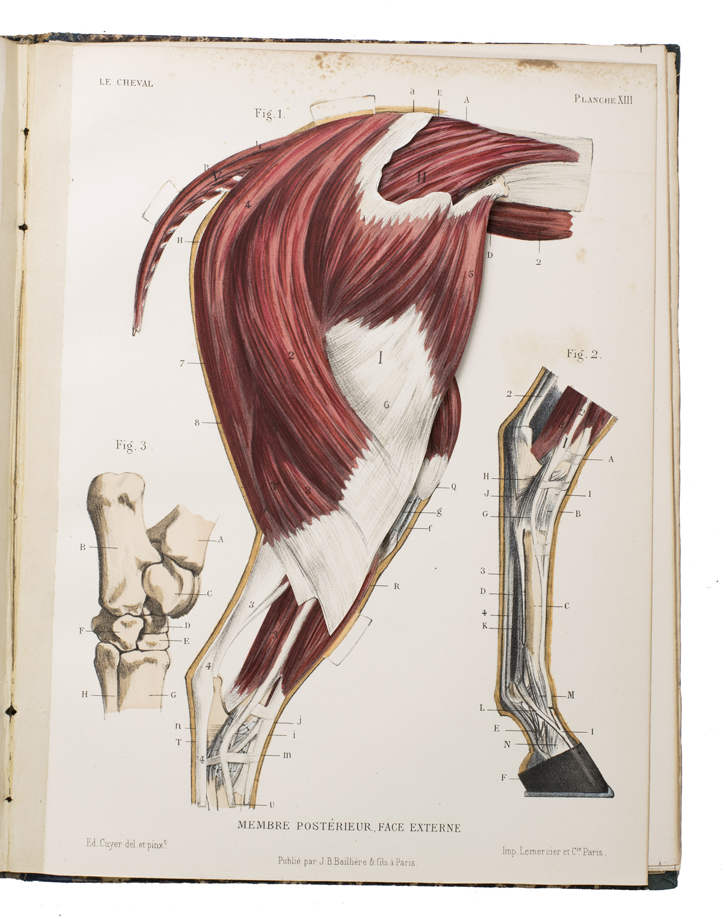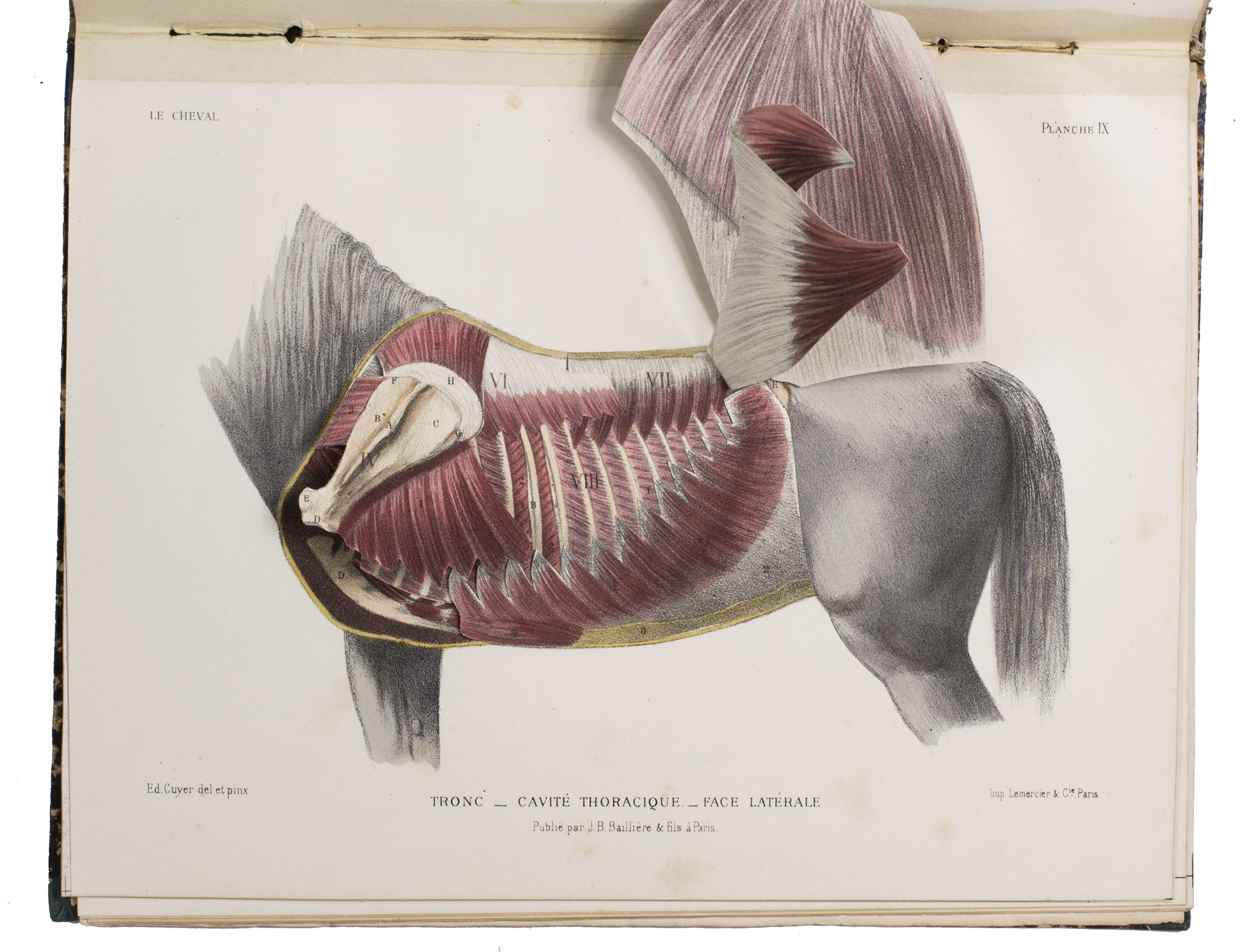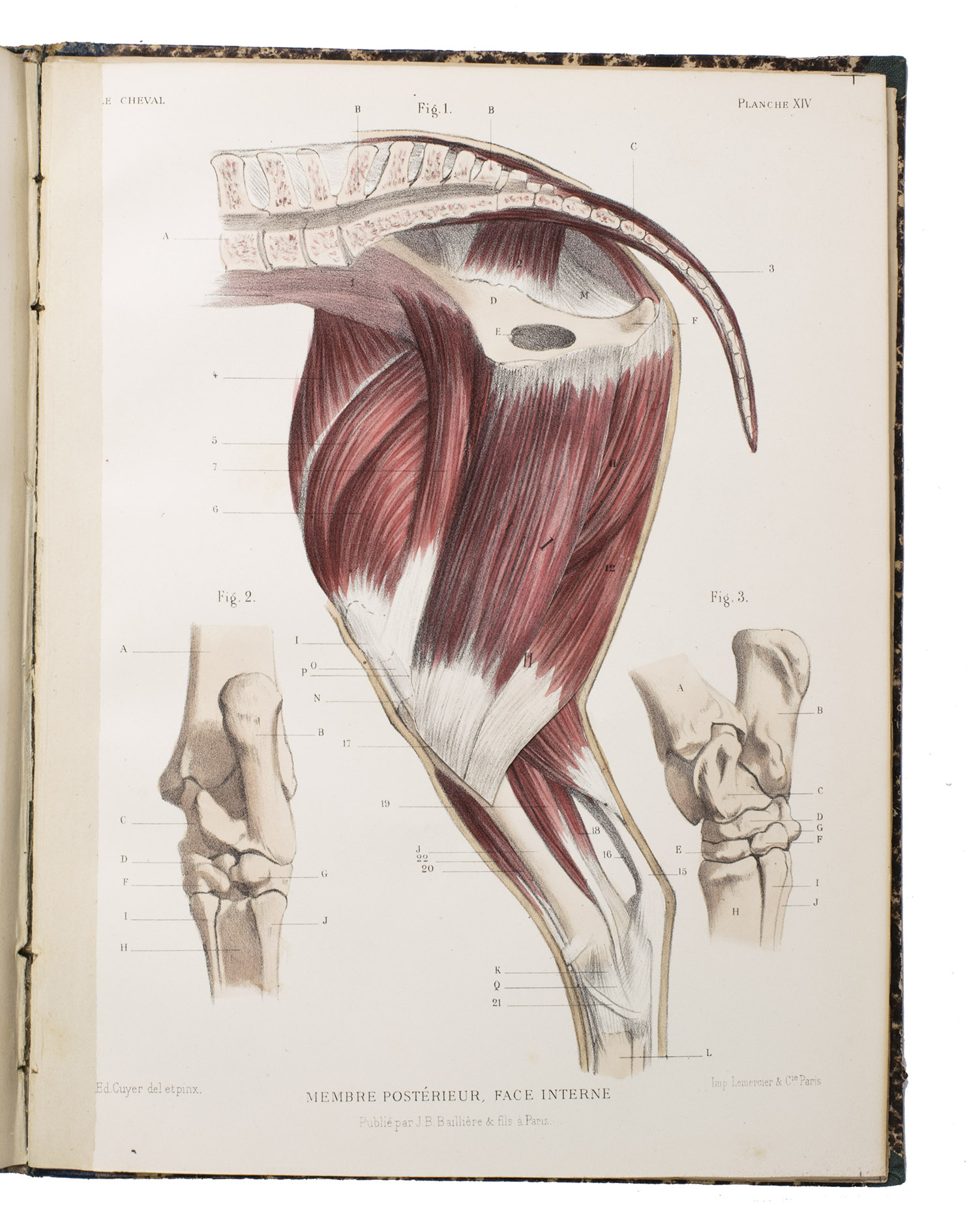 Paris, J-B. Baillière & Sons, 1886. 2 volumes. 4to. With 16 lithographed plates in the atlas volume showing the anatomy of horses, including 13 with movable parts, all in colour, the text volume contains 172 illustrations in the text by Édouard Cuyer. Contemporary half blue calf (or sheepskin?), marbled sides, with the title lettered in gold on the spine. XXIV, 703, [1 blank]; 44, [4] pp. and 16 lithographed plates.
