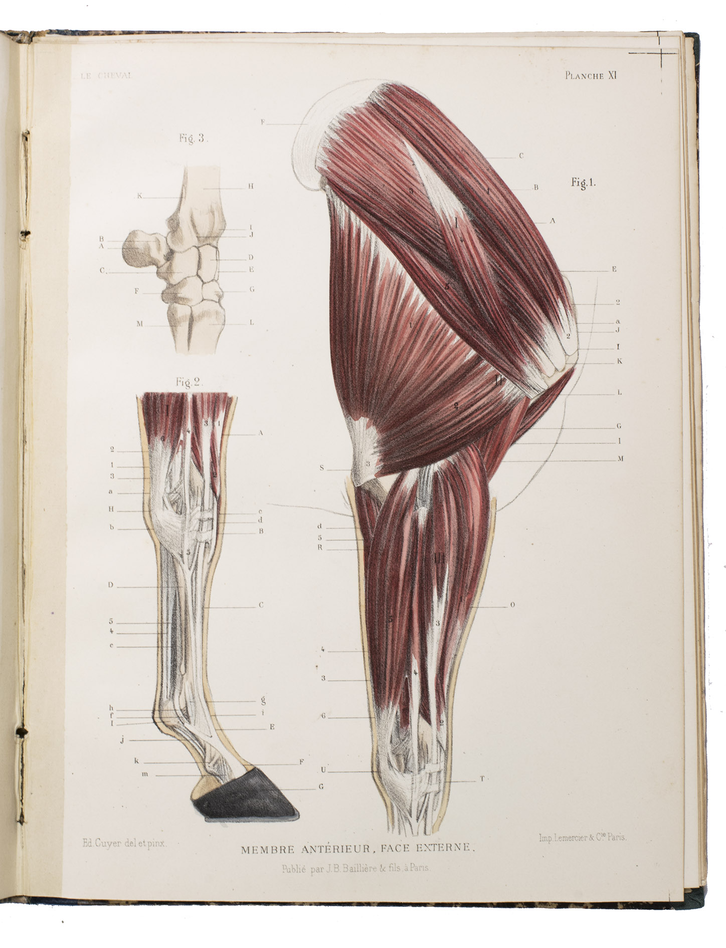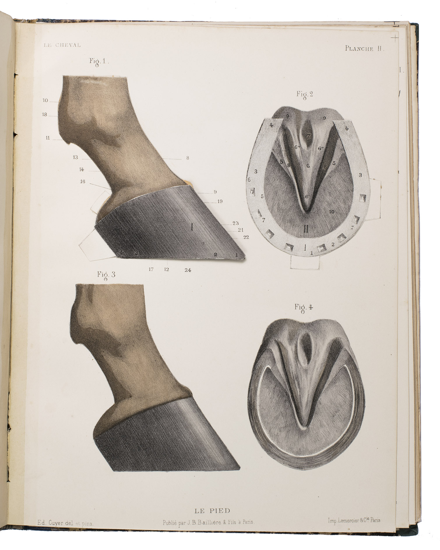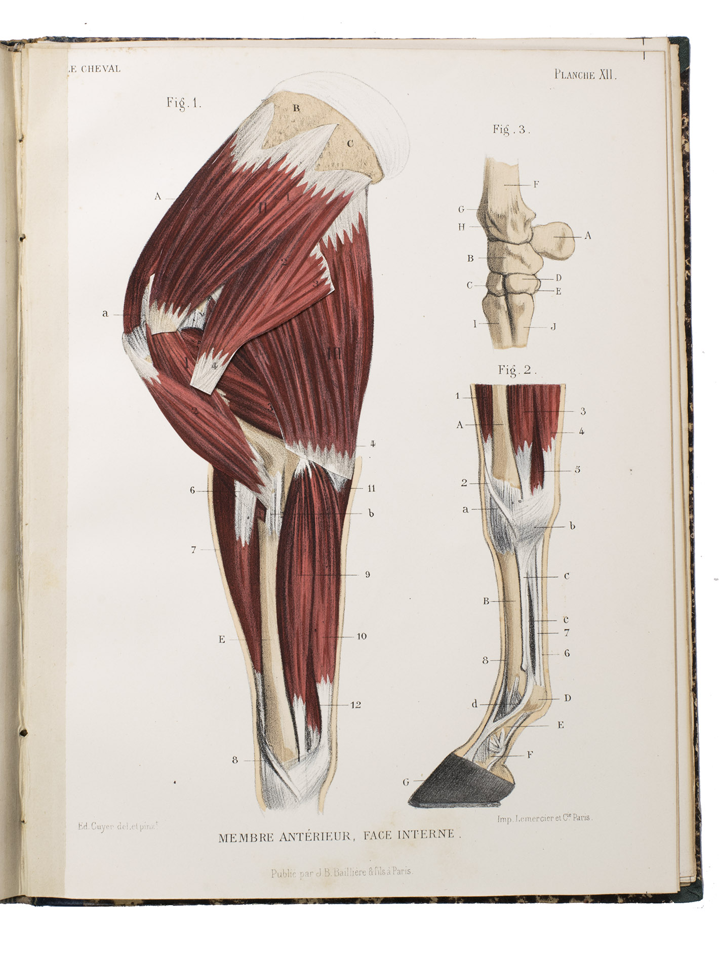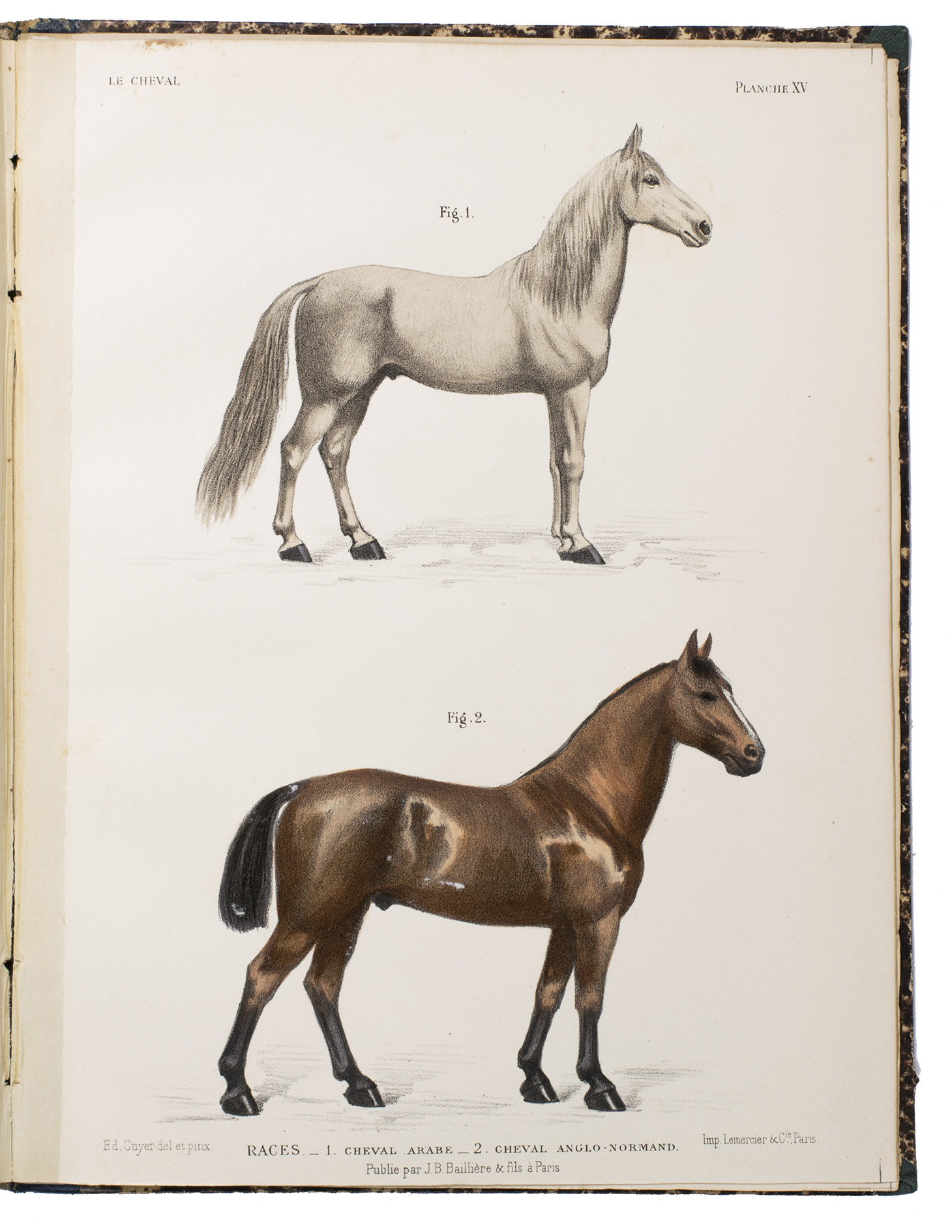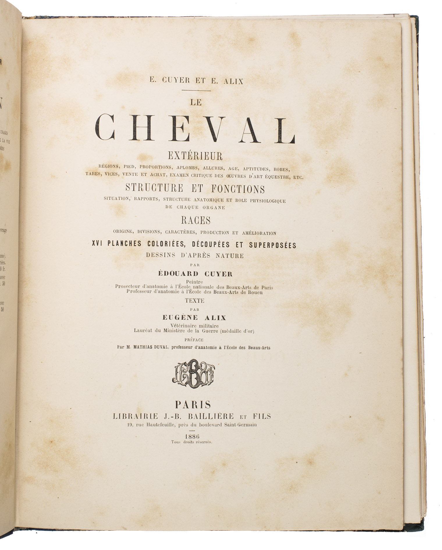 Paris, J-B. Baillière & Sons, 1886. 2 volumes. 4to. With 16 lithographed plates in the atlas volume showing the anatomy of horses, including 13 with movable parts, all in colour, the text volume contains 172 illustrations in the text by Édouard Cuyer. Contemporary half blue calf (or sheepskin?), marbled sides, with the title lettered in gold on the spine. XXIV, 703, [1 blank]; 44, [4] pp. and 16 lithographed plates.