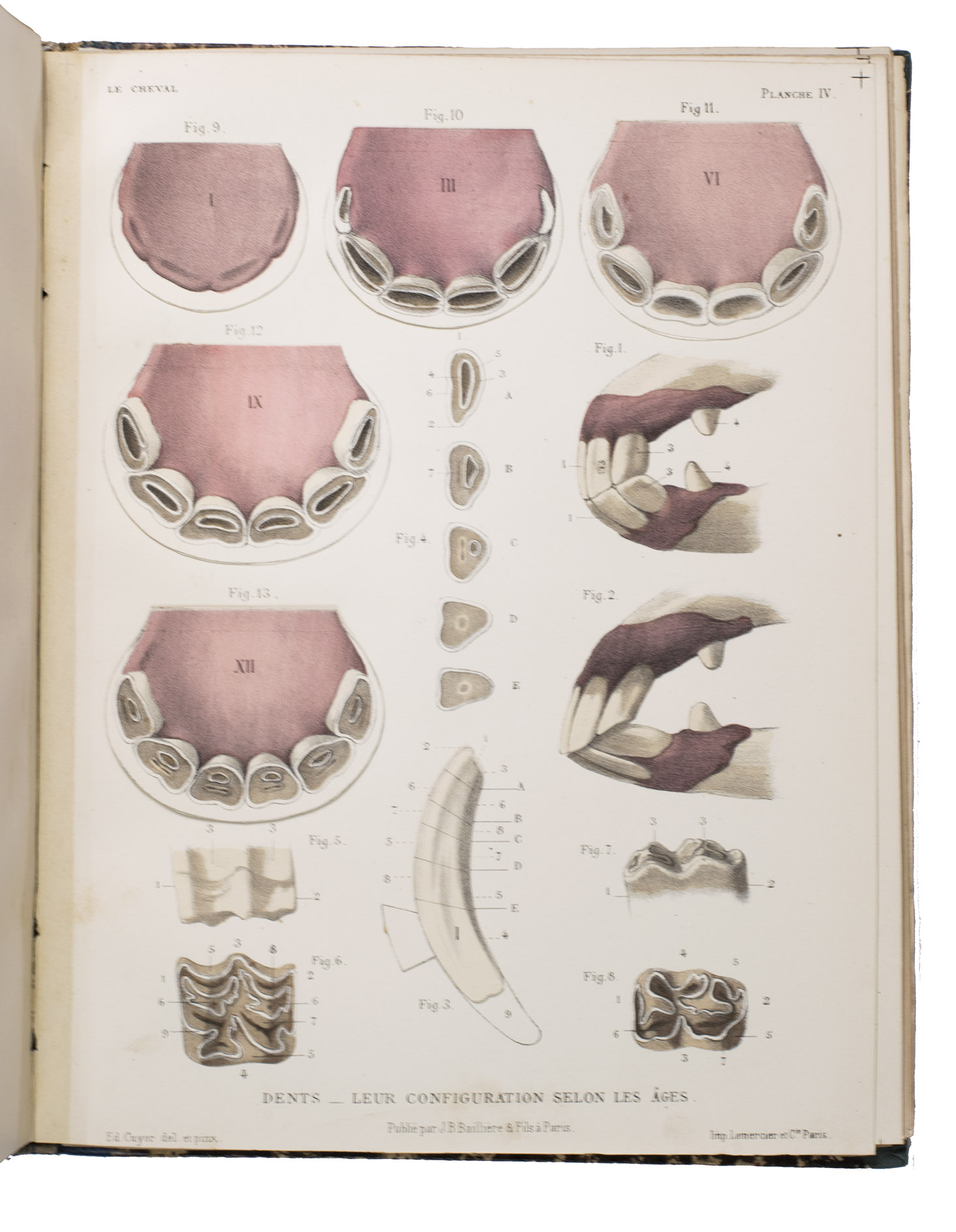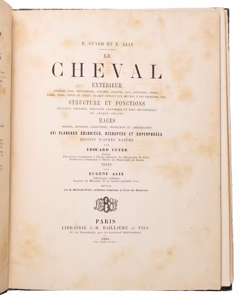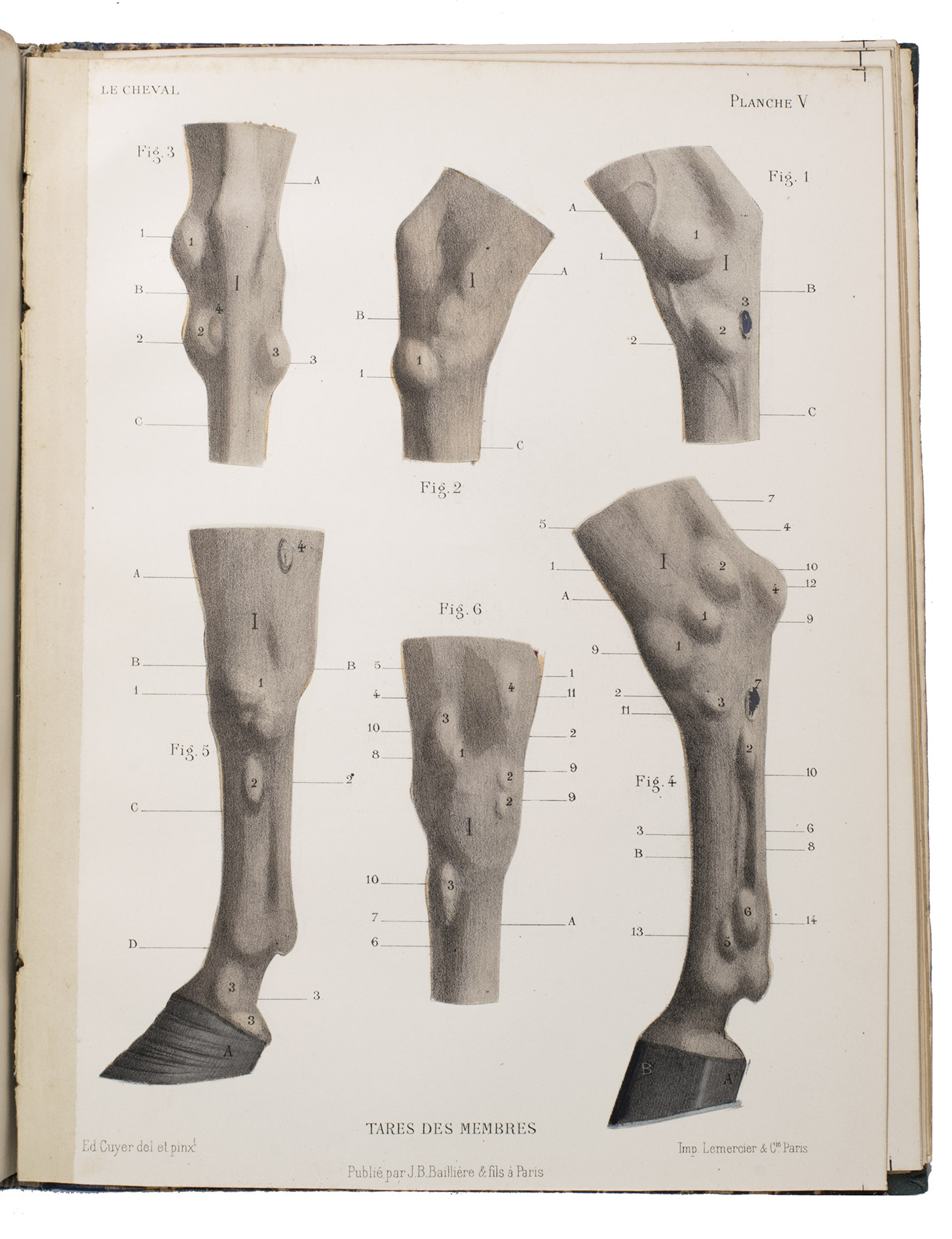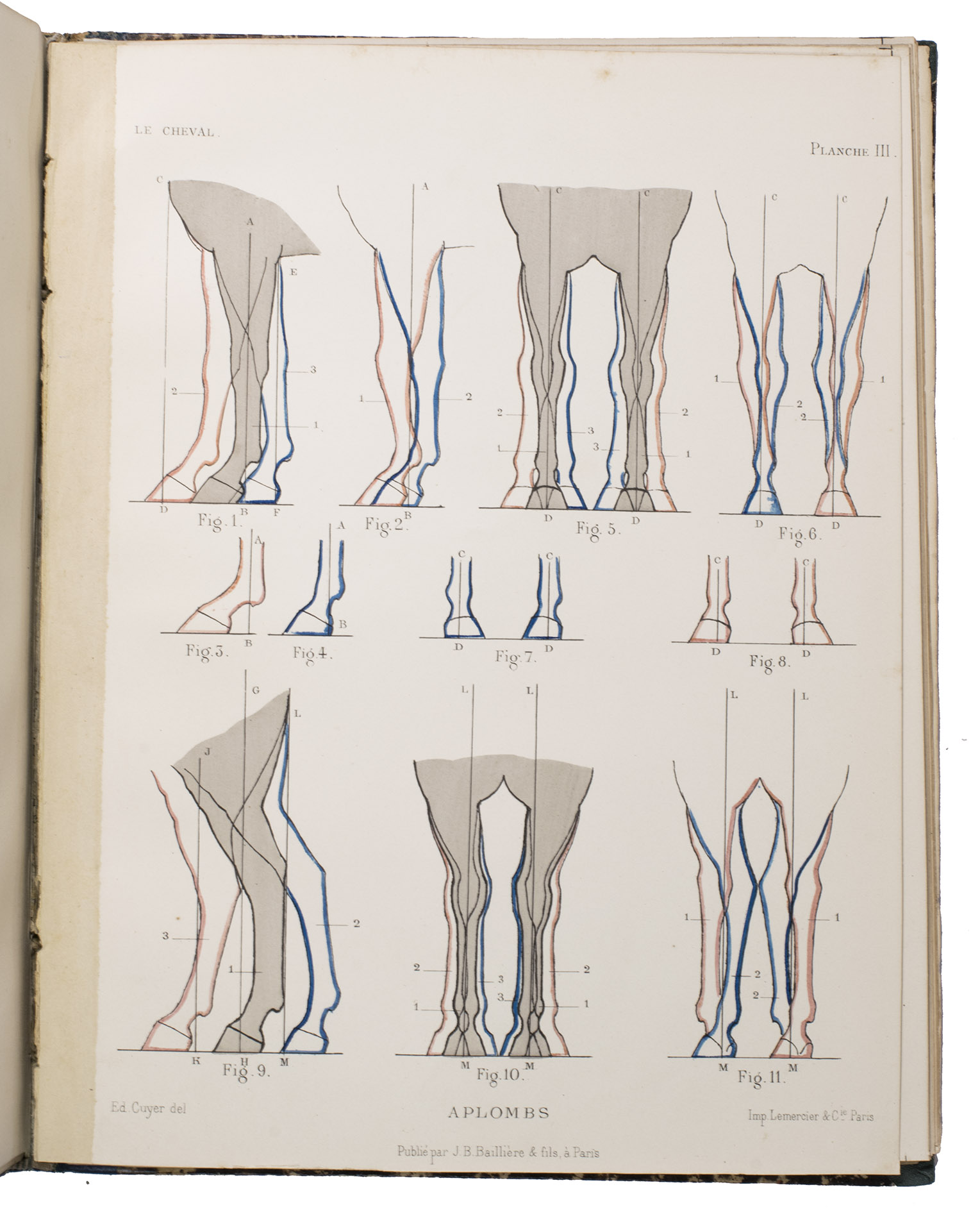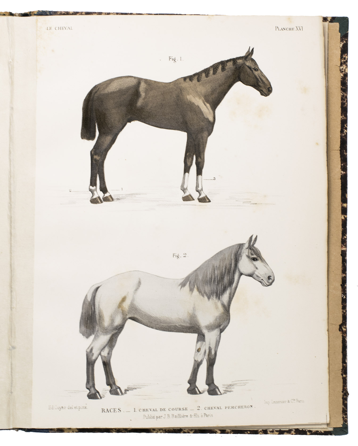 Paris, J-B. Baillière & Sons, 1886. 2 volumes. 4to. With 16 lithographed plates in the atlas volume showing the anatomy of horses, including 13 with movable parts, all in colour, the text volume contains 172 illustrations in the text by Édouard Cuyer. Contemporary half blue calf (or sheepskin?), marbled sides, with the title lettered in gold on the spine. XXIV, 703, [1 blank]; 44, [4] pp. and 16 lithographed plates.