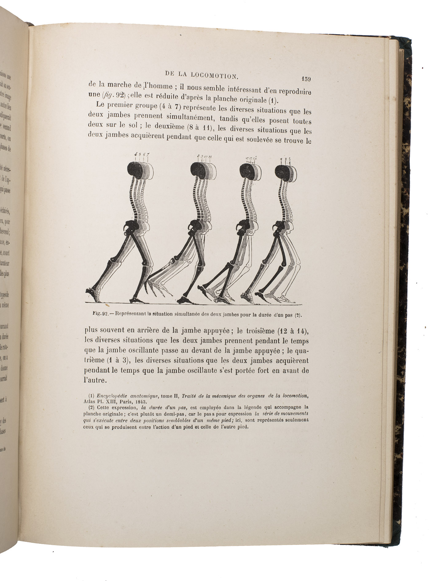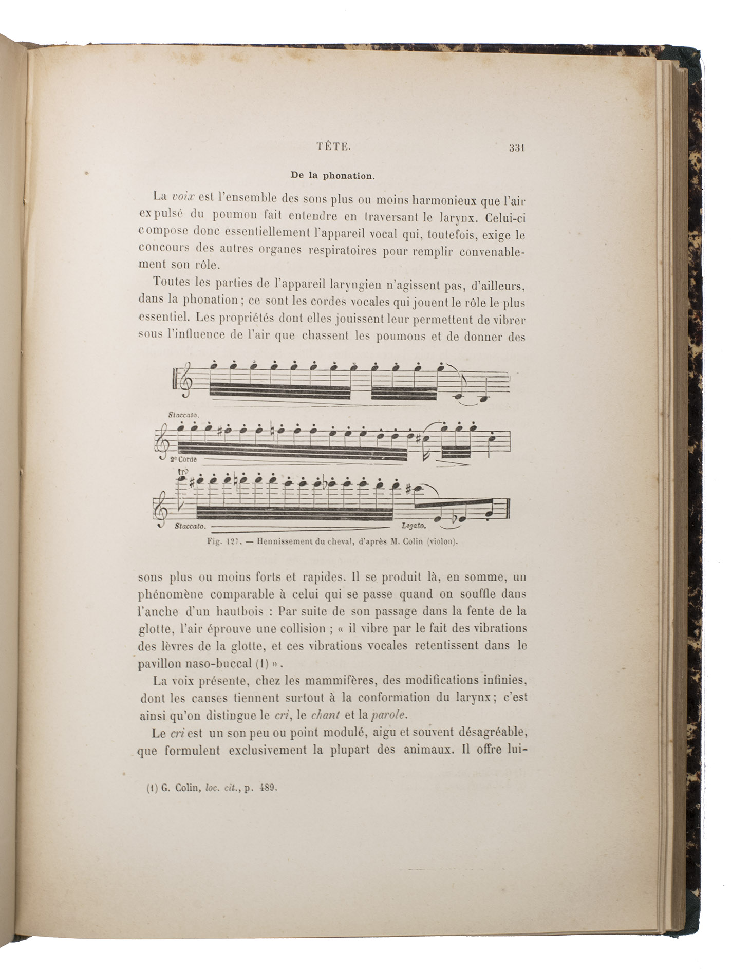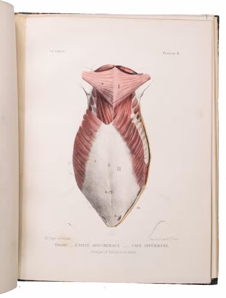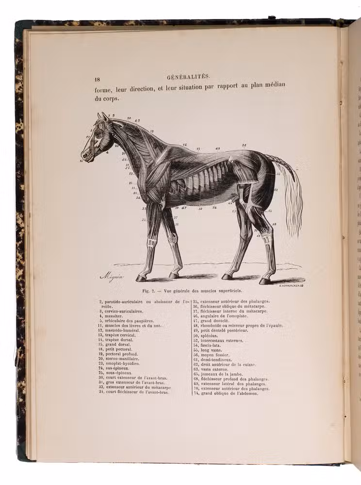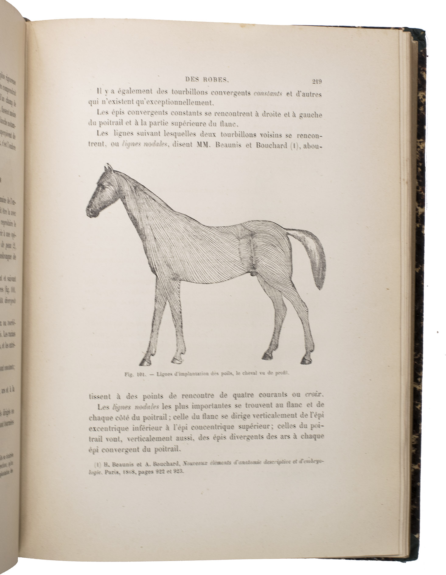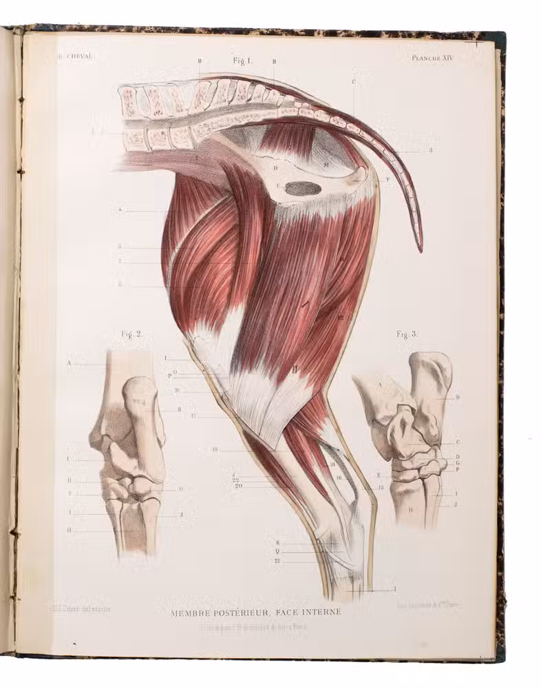 Paris, J-B. Baillière & Sons, 1886. 2 volumes. 4to. With 16 lithographed plates in the atlas volume showing the anatomy of horses, including 13 with movable parts, all in colour, the text volume contains 172 illustrations in the text by Édouard Cuyer. Contemporary half blue calf (or sheepskin?), marbled sides, with the title lettered in gold on the spine. XXIV, 703, [1 blank]; 44, [4] pp. and 16 lithographed plates.