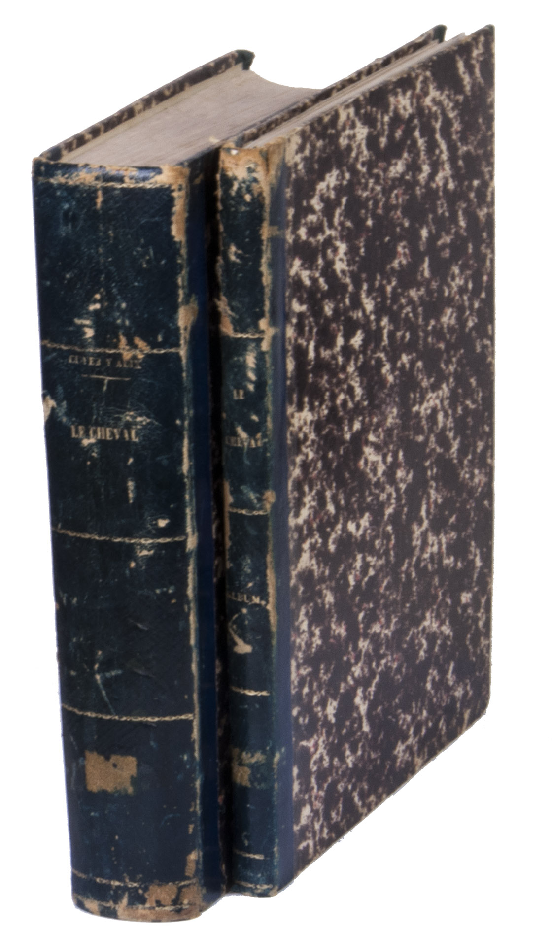 The blue leather around the spine is rubbed, some foxing and browning throughout, a previous owner's inscription has been removed from the blank free flyleaf in the text volume by tearing the corner of the page off and with a small tear in pp. I and II, the hinges of most of the plates in the atlas volume are reinforced with white tape, plate VI in the atlas volume is bound at the end of the work. Otherwise in good condition. A remarkable elaborately illustrated work on horses. Mennessier de la Lance I, p. 14; WorldCat 639925 (11 copies); not in Podeschi.
