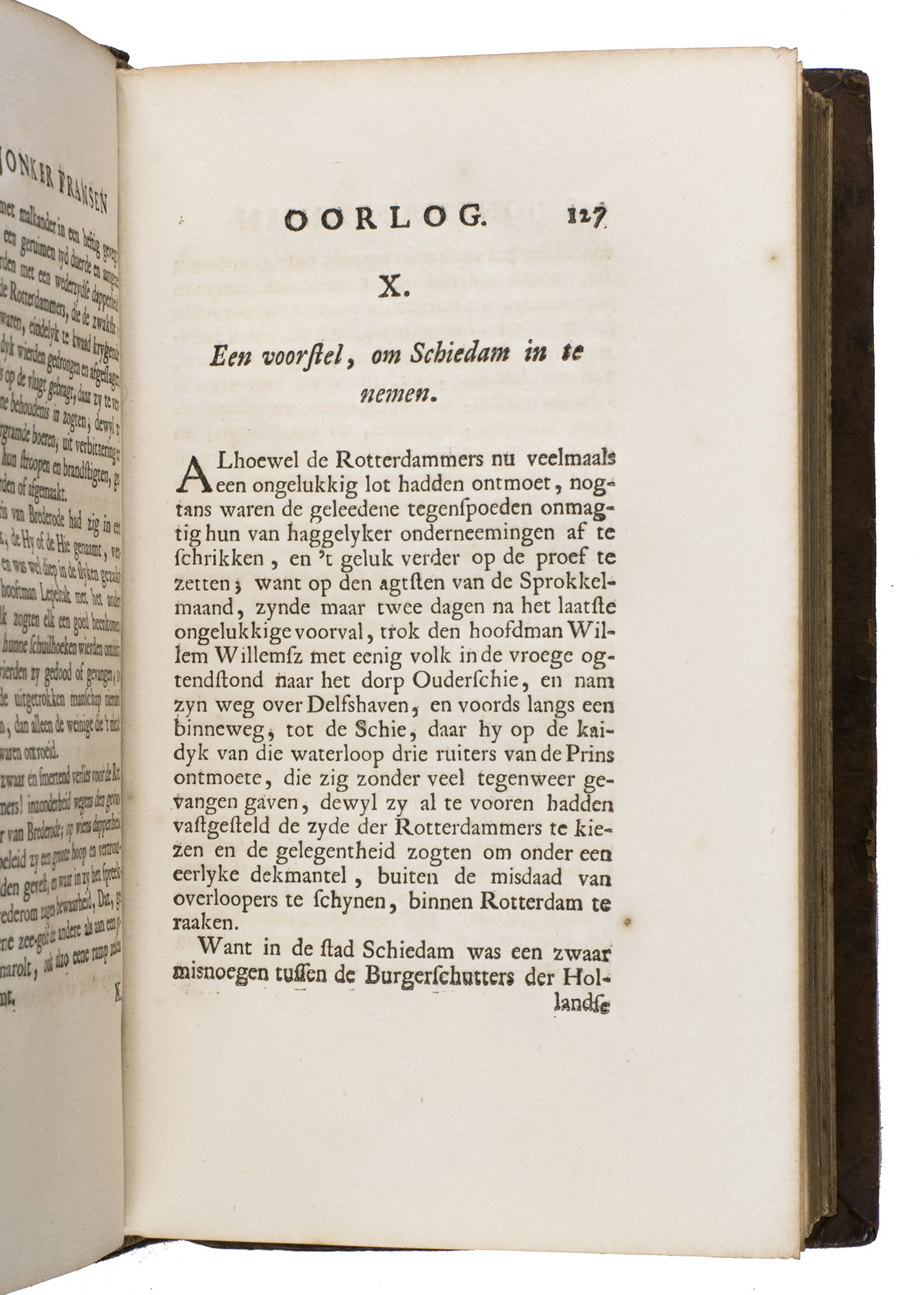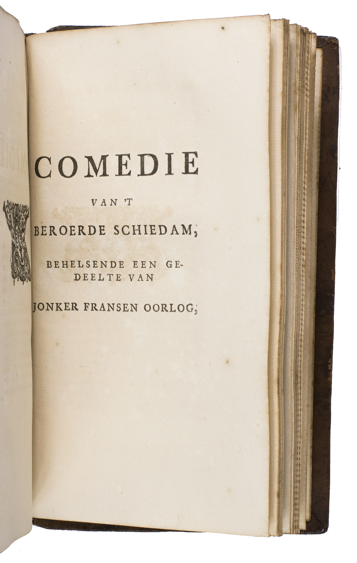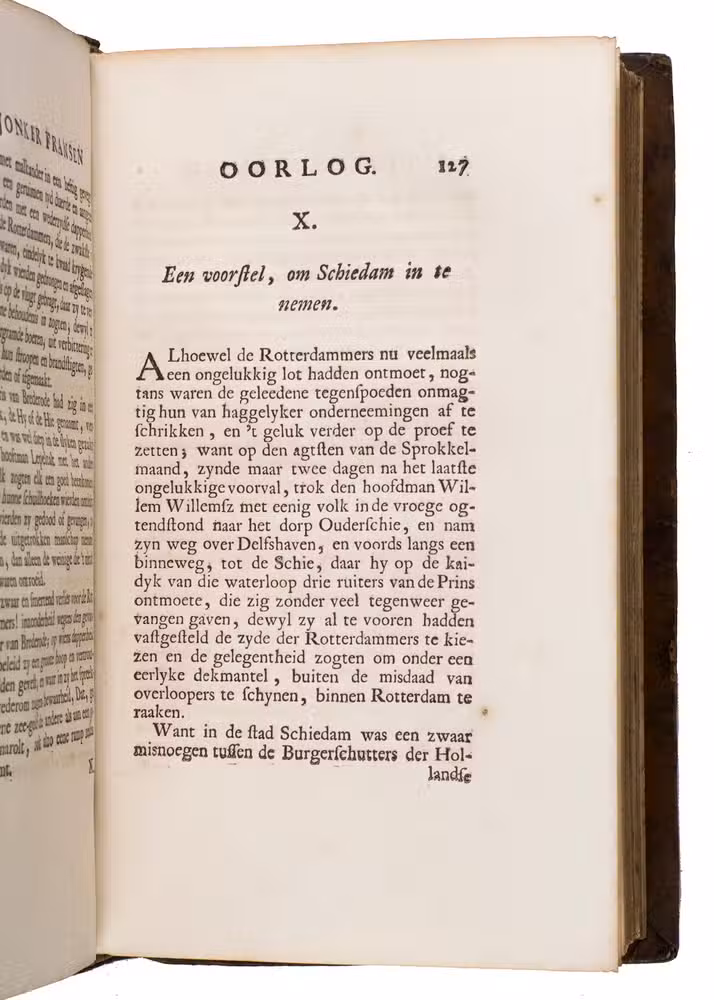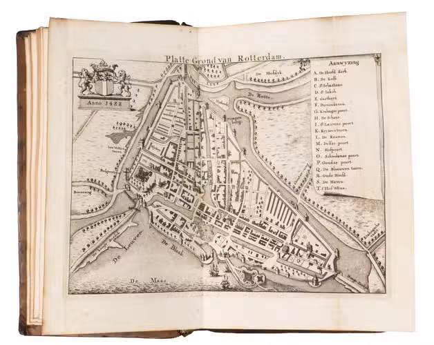 Large paper copy of the first edition of the history of the "Jonker Fransenoorlog", in a finely gold-tooled presentation binding by the so-called Crescent Moon Bindery (ca.1717-1729?). The war took place in and around Rotterdam between November 1488 and August 1490 and formed the final part of the "Hoeksche en Kabbeljauwse twisten" ("Hook and Cod Wars" (1350-1490)). During this time, Rotterdam was governed by the leader of the conservative "Hooks", the nobleman Frans van Brederode (Jonker Frans, 1465-1490), member of one of the most influential families in Holland. Under his command, they fought against the provincial administration of Stadholder Jan III van Egmont (1438-1516) dominated by the "Cods", who were closer to the Burgundian ruling elite. The work details the fight of the Hooks against the surrounding cities, such as Gouda, Hillegersberg, Schoonhoven, and Delft.