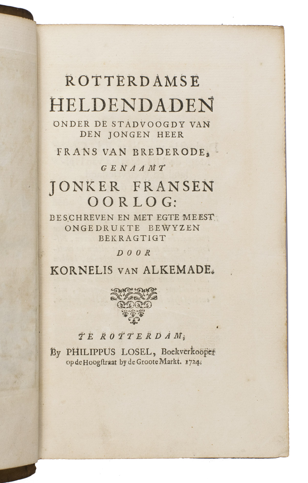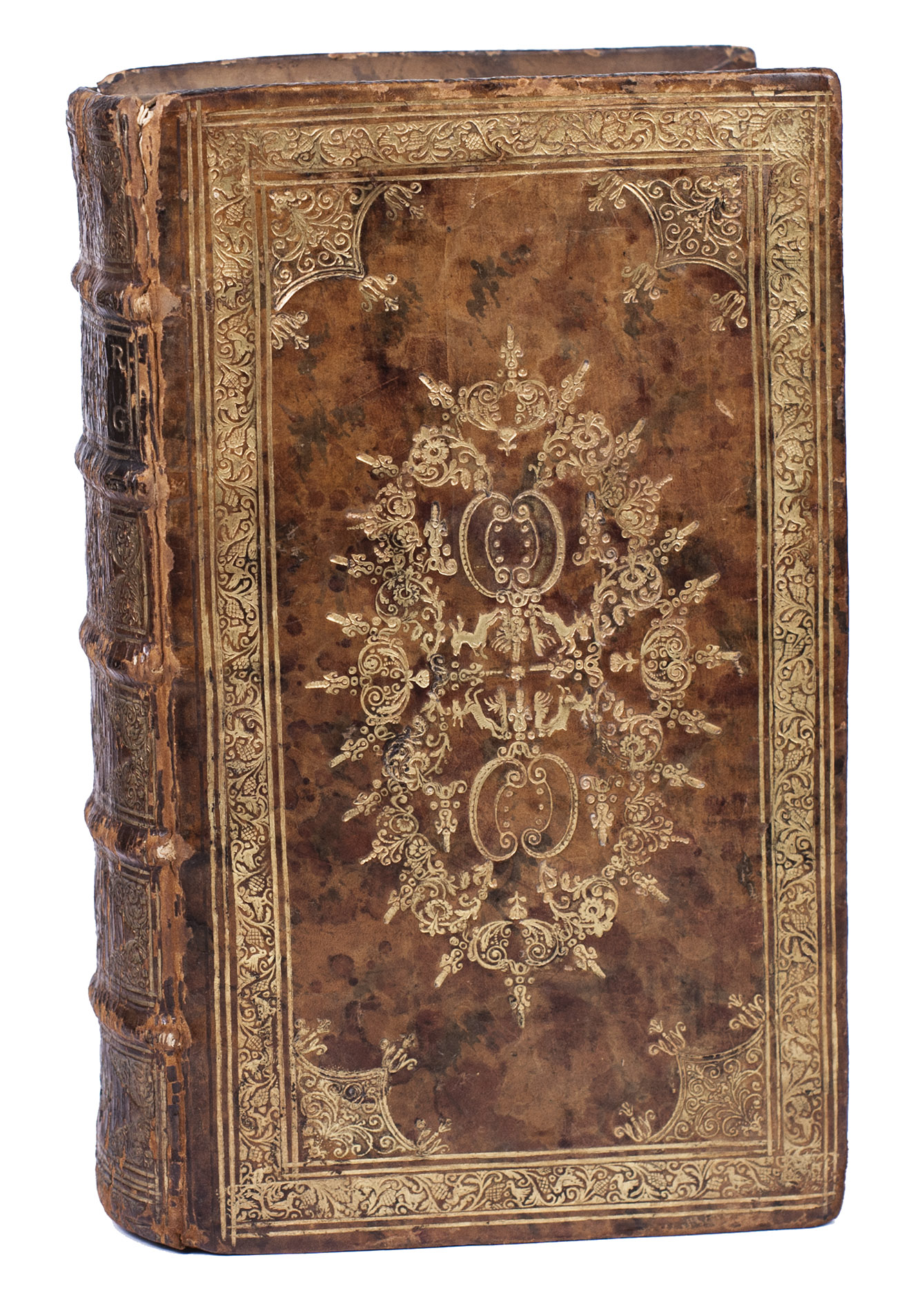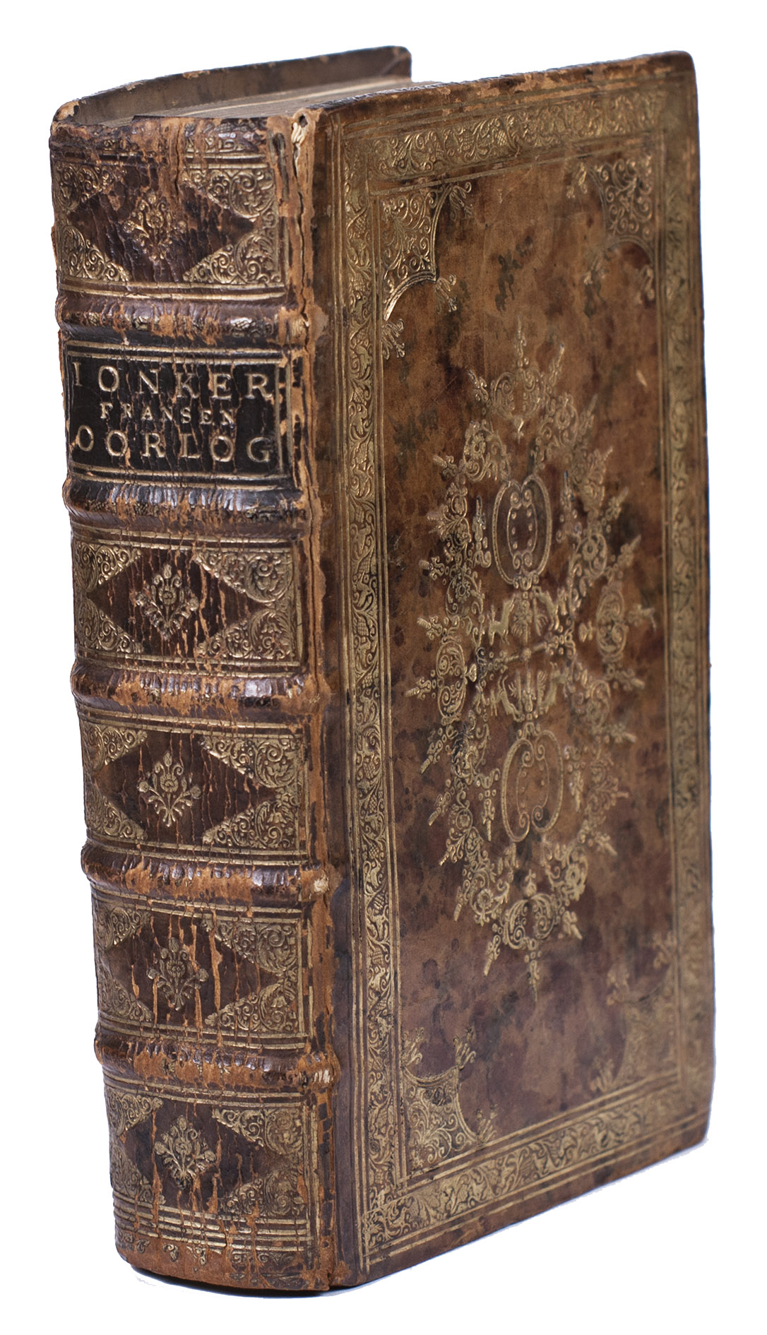 Rotterdam, Philippus Losel, 1724. Large 8vo (ca. 20 x 11.5 cm). With a frontispiece (depicting Jonker Frans standing in armour on a pedestal) engraved by François van Bleyswijck, a woodcut vignette on the title page, a folding engraved plan of Rotterdam in 1488 (ca. 16 x 22 cm), and a few woodcut tail pieces. Contemporary richly gold-tooled mottled calf, sewn on 4 supports with the corresponding raised bands on the spine, a brown morocco title label on the spine, lettered in gold, a centrepiece and cornerpieces on both boards composed of several stamps including four running stags (Storm van Leeuwen, IIA, p. 450, stamps I, 1, 5-6), surrounded by an ornamental border with birds along the edges between double rules, gilt and gauffered edges. [36], 387 pp.