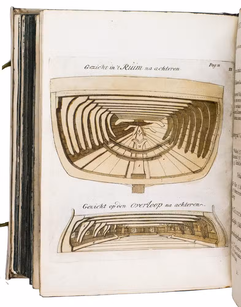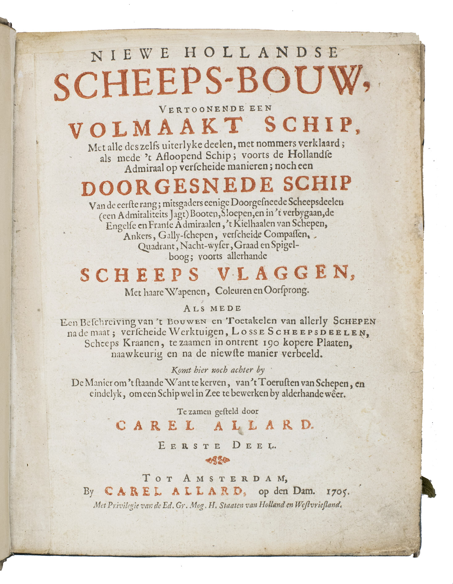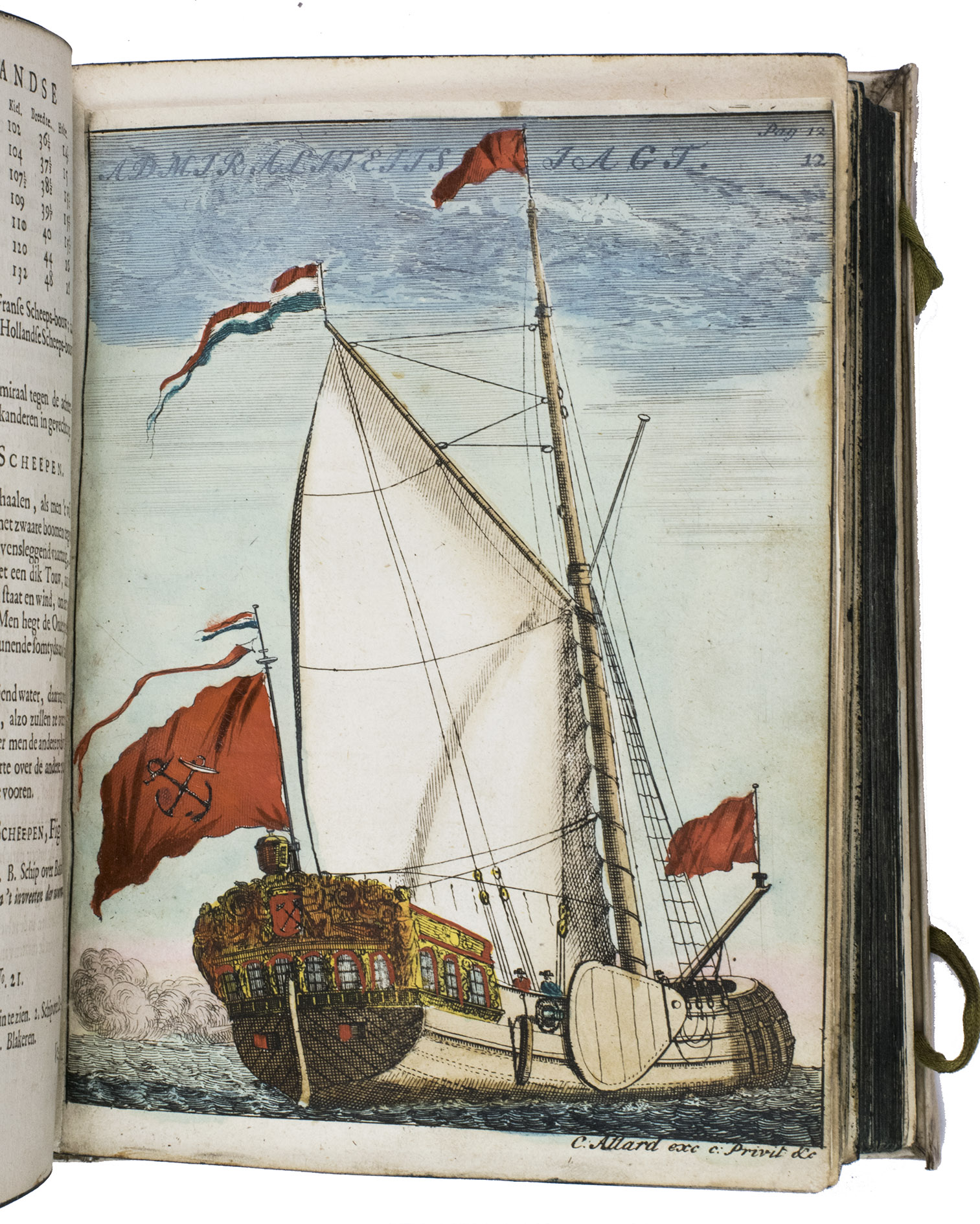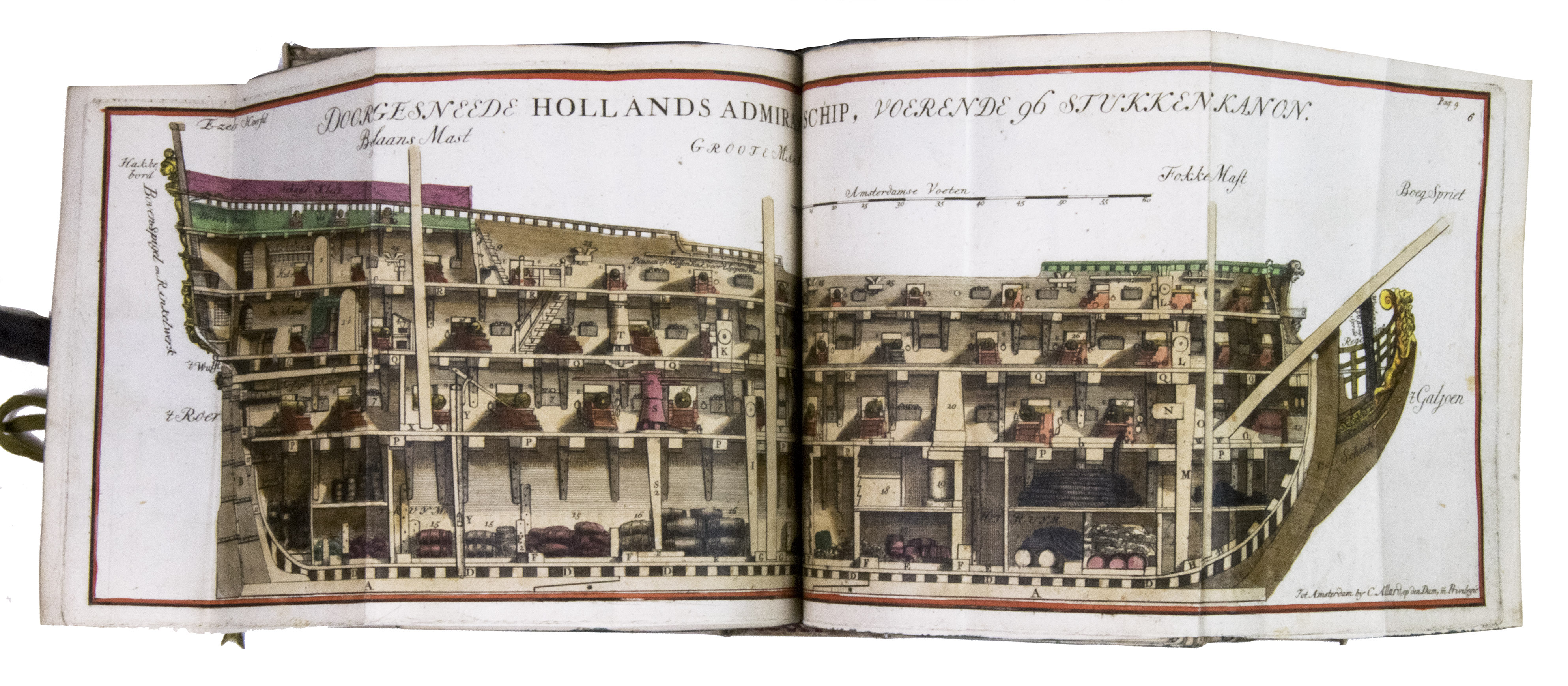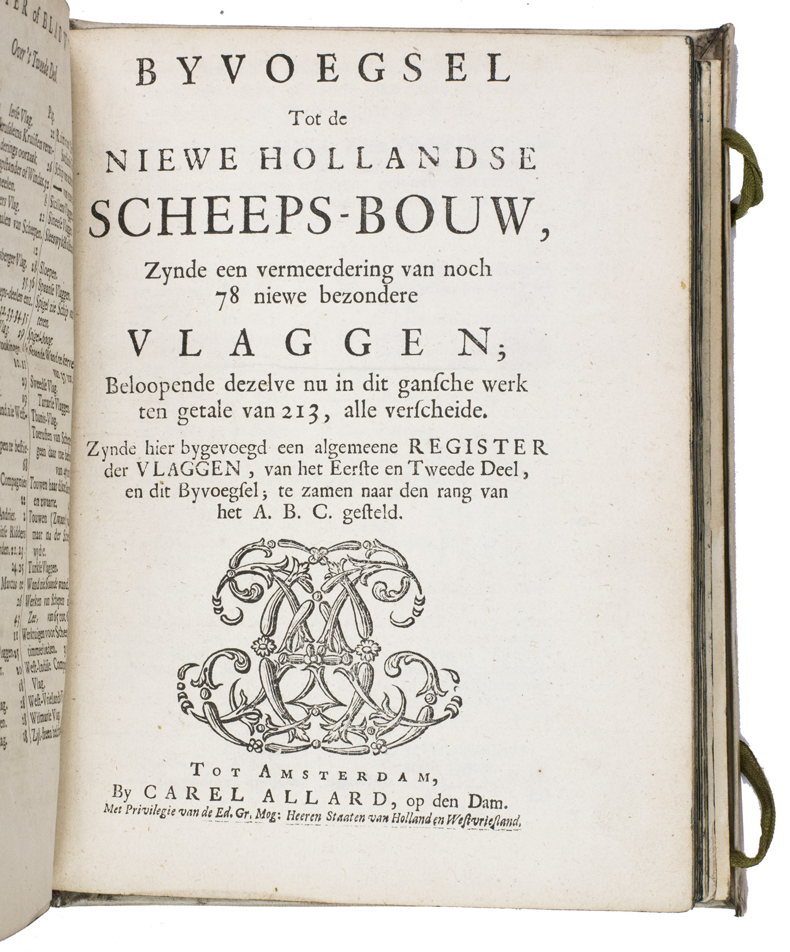 Niewe Hollandse scheeps-bouw is an essential primary source for the terminology and practice of shipbuilding in the Dutch Golden Age. It details everything one would need to know about ships, shipbuilding, rigging and maritime flags. The first plate gives a very detailed image of a three-masted ship (including the parts under water) and its rigging, with more than 150 elements keyed with letters or numbers to the list on pages 4 to 8. The second volume contains multiple double-page plates with cross sections of various parts of a ship, as well as plates depicting the tools of the trade, which helps one understand the ship-building process. It also contains a short section on compasses and navigation. The majority of the plates, however, show maritime flags. In fact, both the second and third volume were added because the first was missing a number of flags. The section of flags, spread out across all three volumes, is very extensive. It includes the flags of numerous cities and countries across the world, as well as signal flags.