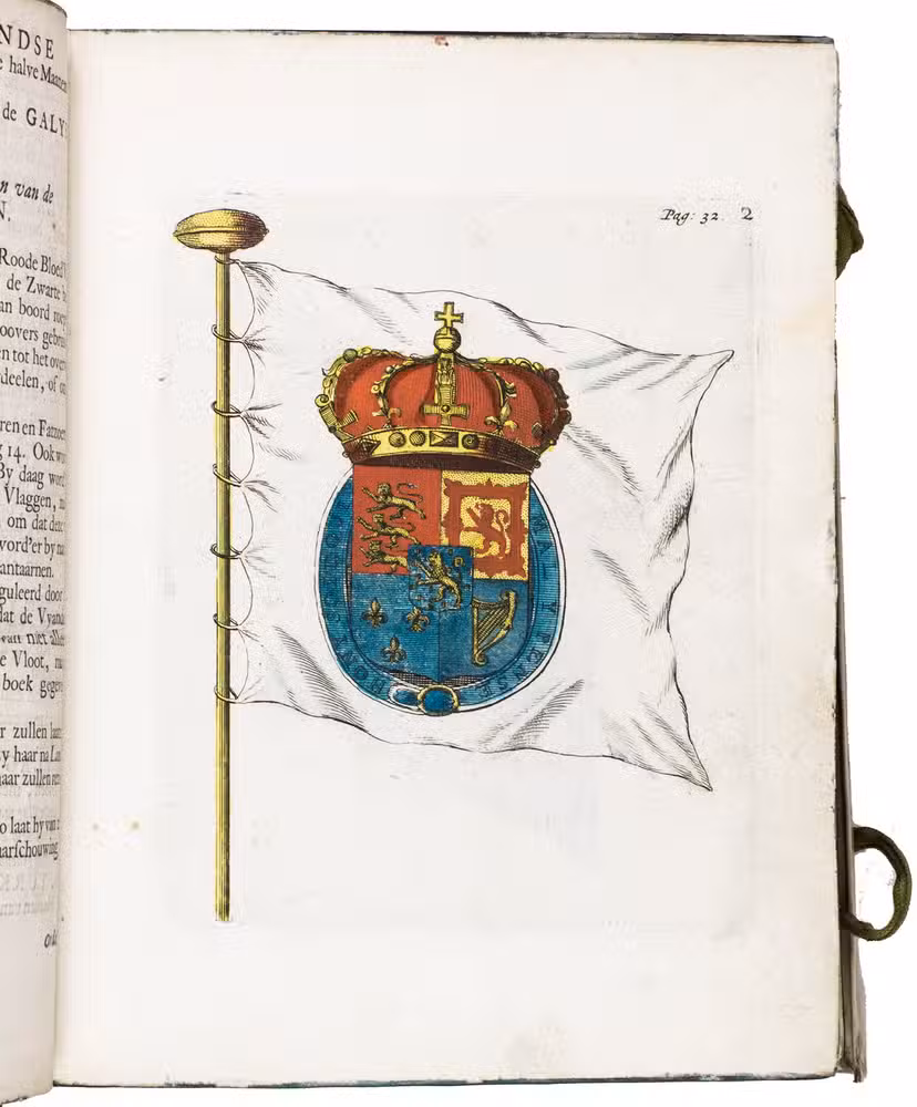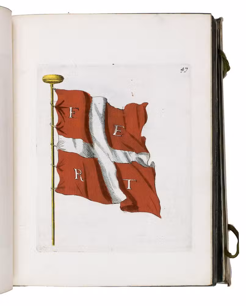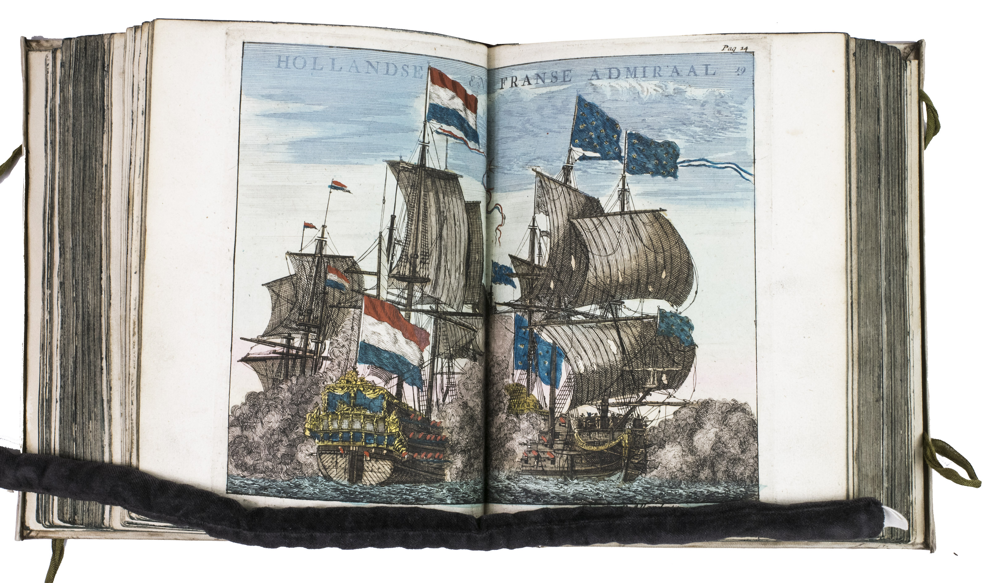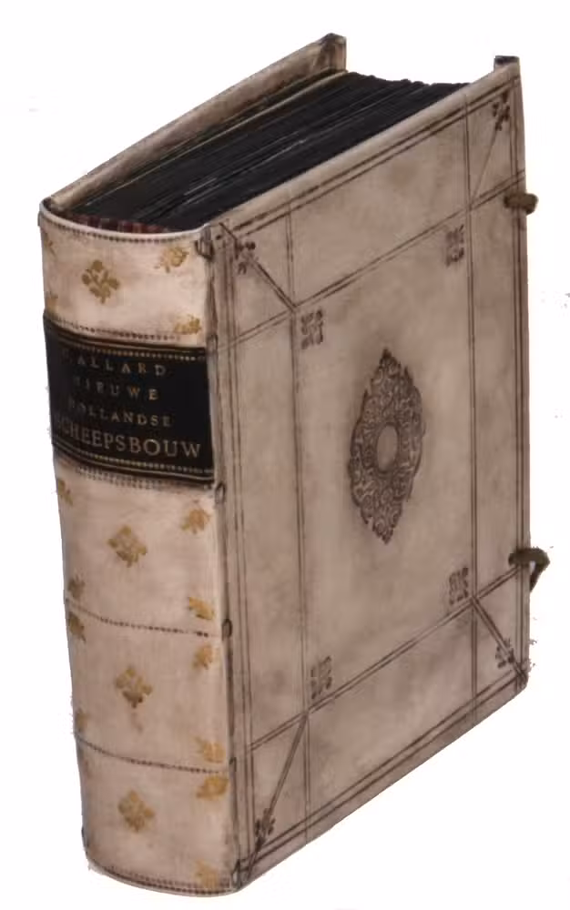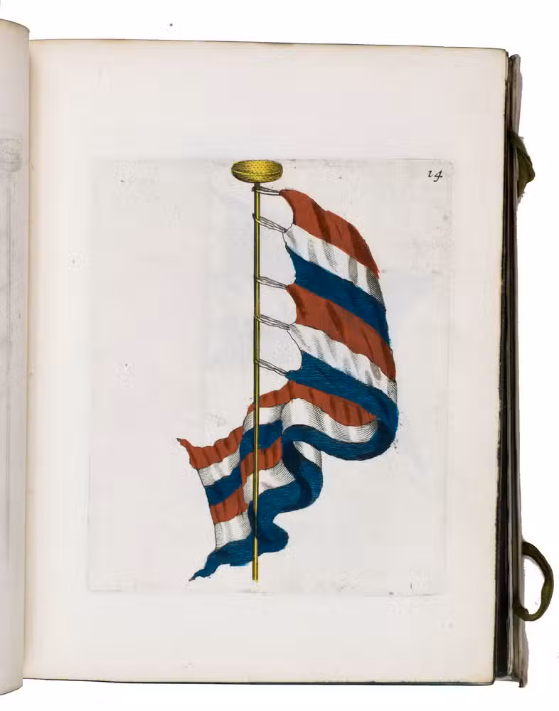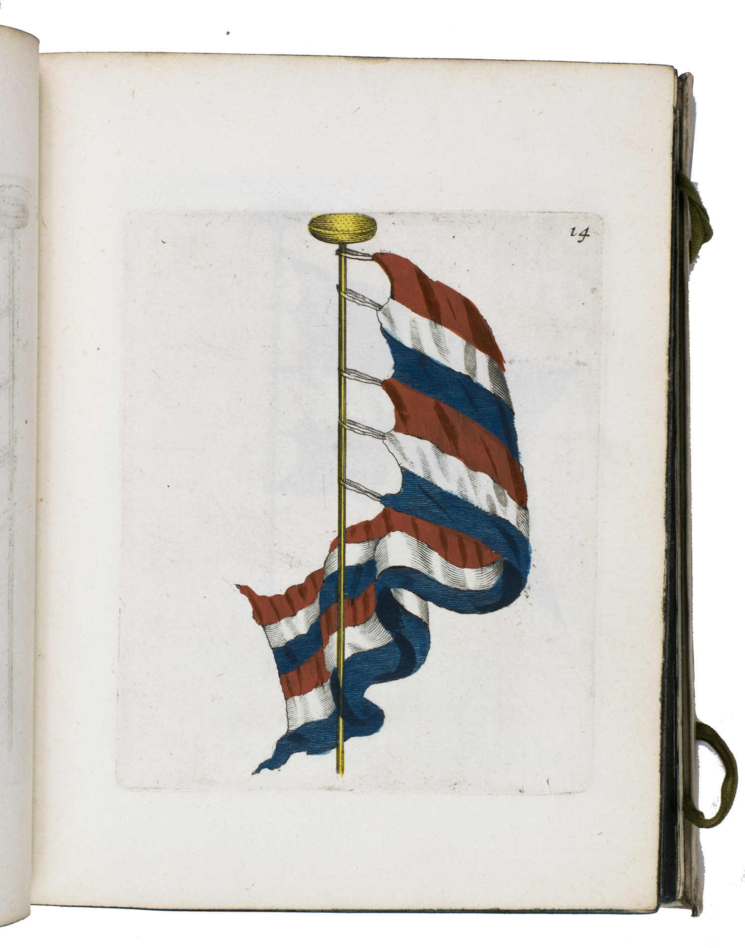 Niewe Hollandse scheeps-bouw is an essential primary source for the terminology and practice of shipbuilding in the Dutch Golden Age. It details everything one would need to know about ships, shipbuilding, rigging and maritime flags. The first plate gives a very detailed image of a three-masted ship (including the parts under water) and its rigging, with more than 150 elements keyed with letters or numbers to the list on pages 4 to 8. The second volume contains multiple double-page plates with cross sections of various parts of a ship, as well as plates depicting the tools of the trade, which helps one understand the ship-building process. It also contains a short section on compasses and navigation. The majority of the plates, however, show maritime flags. In fact, both the second and third volume were added because the first was missing a number of flags. The section of flags, spread out across all three volumes, is very extensive. It includes the flags of numerous cities and countries across the world, as well as signal flags.