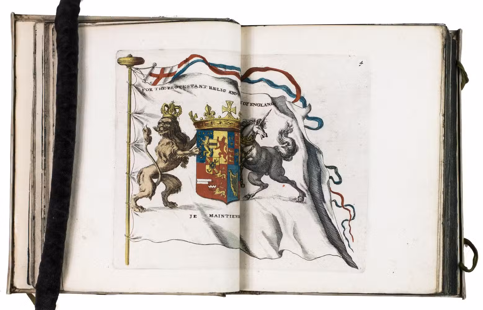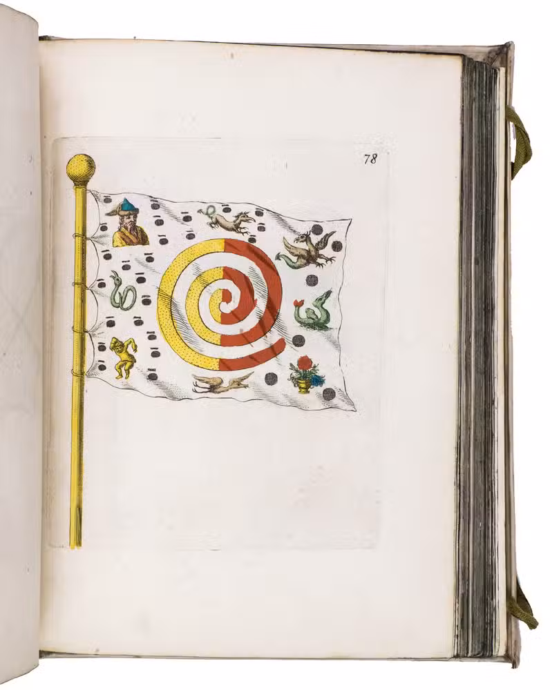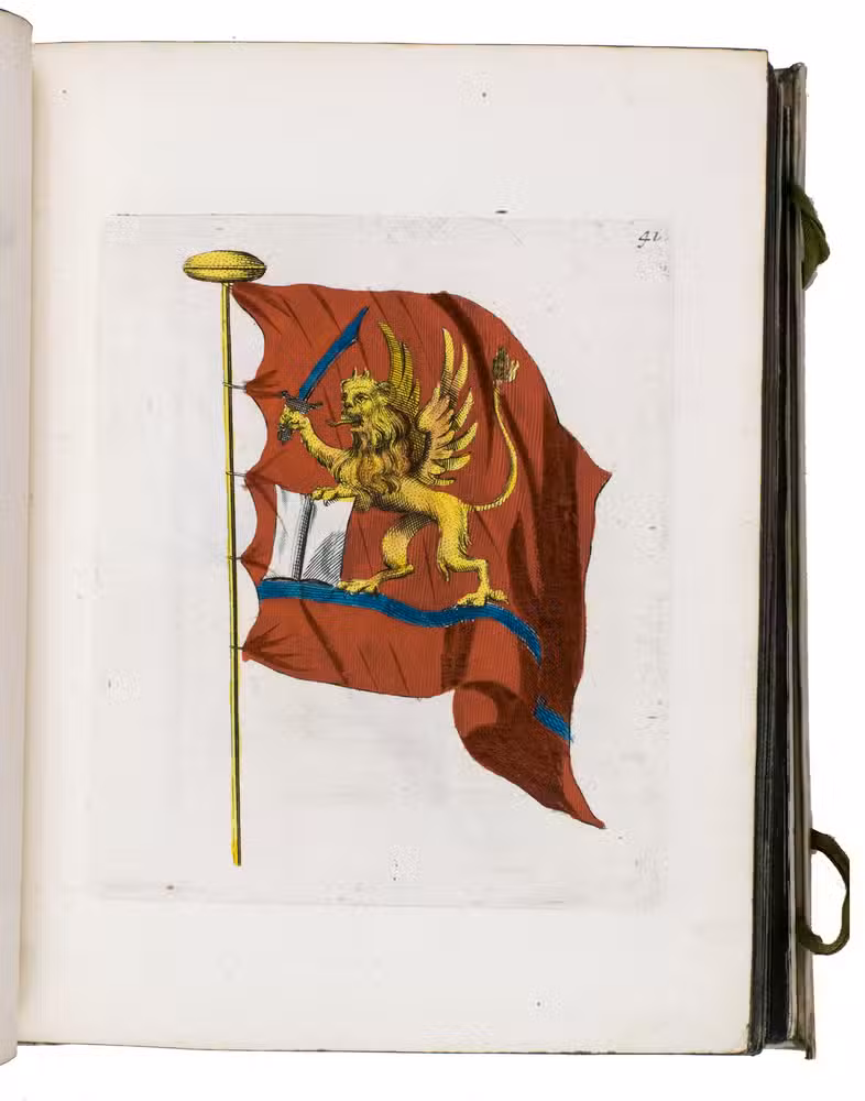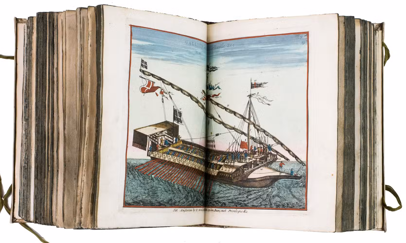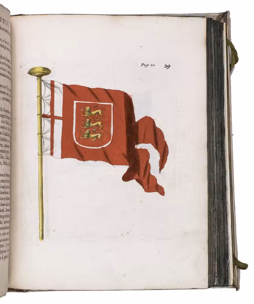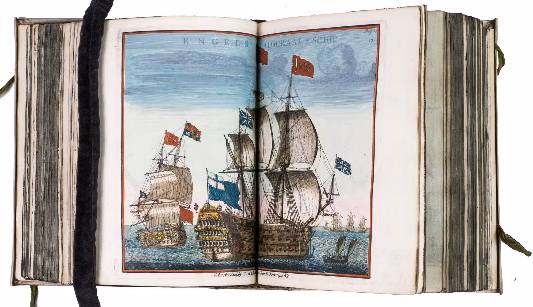 Niewe Hollandse scheeps-bouw is an essential primary source for the terminology and practice of shipbuilding in the Dutch Golden Age. It details everything one would need to know about ships, shipbuilding, rigging and maritime flags. The first plate gives a very detailed image of a three-masted ship (including the parts under water) and its rigging, with more than 150 elements keyed with letters or numbers to the list on pages 4 to 8. The second volume contains multiple double-page plates with cross sections of various parts of a ship, as well as plates depicting the tools of the trade, which helps one understand the ship-building process. It also contains a short section on compasses and navigation. The majority of the plates, however, show maritime flags. In fact, both the second and third volume were added because the first was missing a number of flags. The section of flags, spread out across all three volumes, is very extensive. It includes the flags of numerous cities and countries across the world, as well as signal flags.