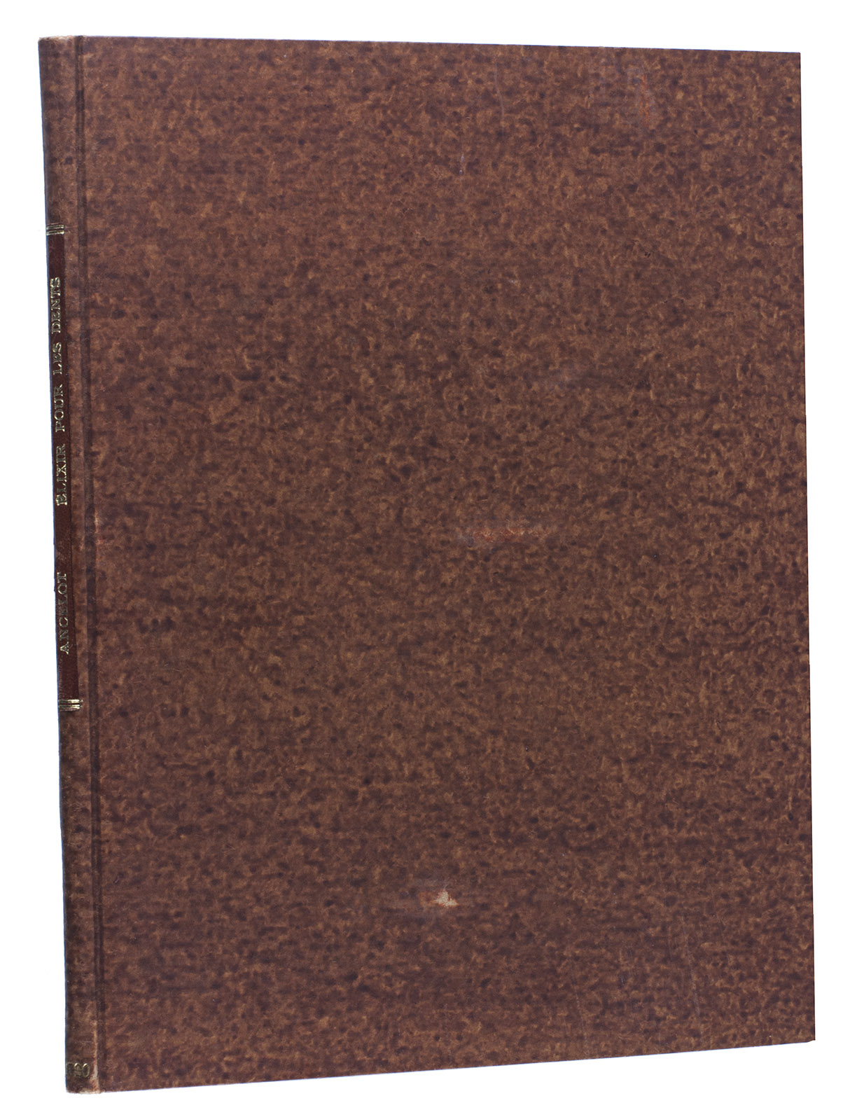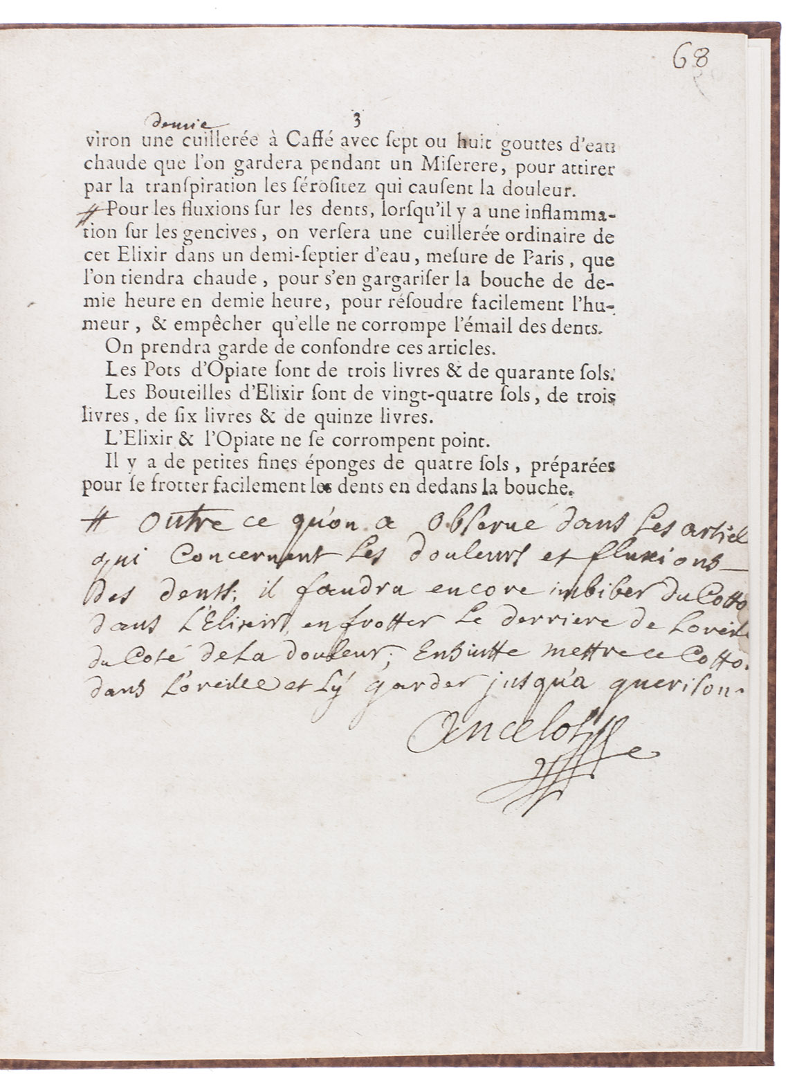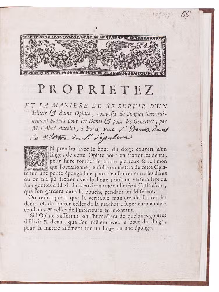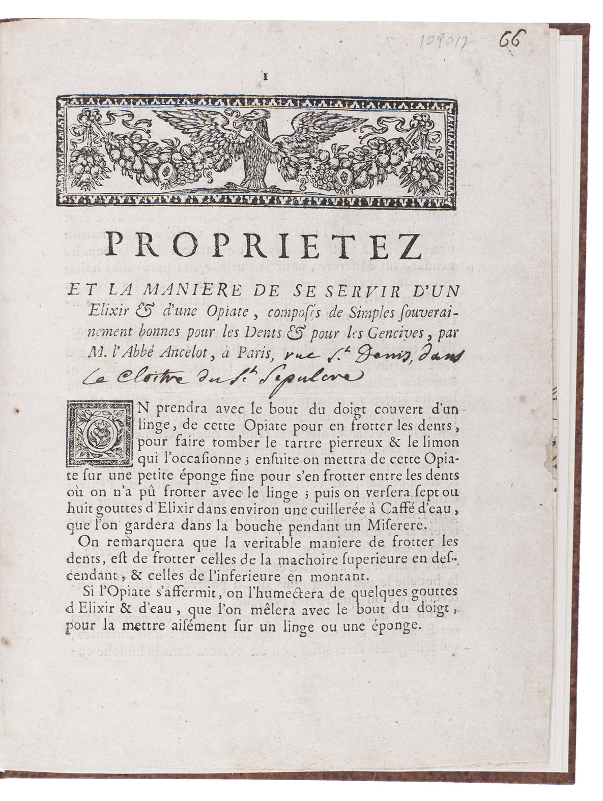Extremely rare treatise with recipes for an elixir and opiate to clean one's teeth and gums in order to prevent tartar, to use with coffee water as a mouthwash for a clean and fresh breath, to use in various ways to relieve tooth-ache, etc. With author's manuscript address added to the drop-title by the author, who was abbot of the monastery Saint Sepulcre at Paris, and an extra recipe added in manuscript at the end by the author and signed by him. Not recorded in the dentistry literature.