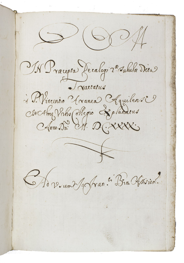 Two commentaries (disputations) on two essential doctrinal points of the Christian faith by the Jesuit Vincenzo Aranea (1588-1652) from L'Aquila. According to the title page of volume 1, the work was held in the Jesuit College of the city of L'Aquila: "Tractatus ... In Almae Urbis Collegio explanatus ... 1640". Later, Aranea lectured on philosophy and moral theology at the famous Collegium Romanum, founded in Rome in 1551 by Ignace of Loyola, and was rector of the Jesuits in Florence and Perugia.