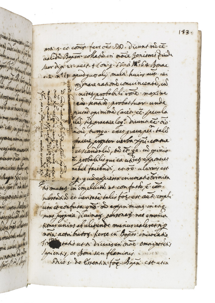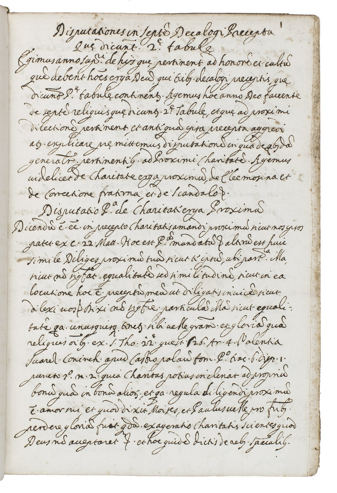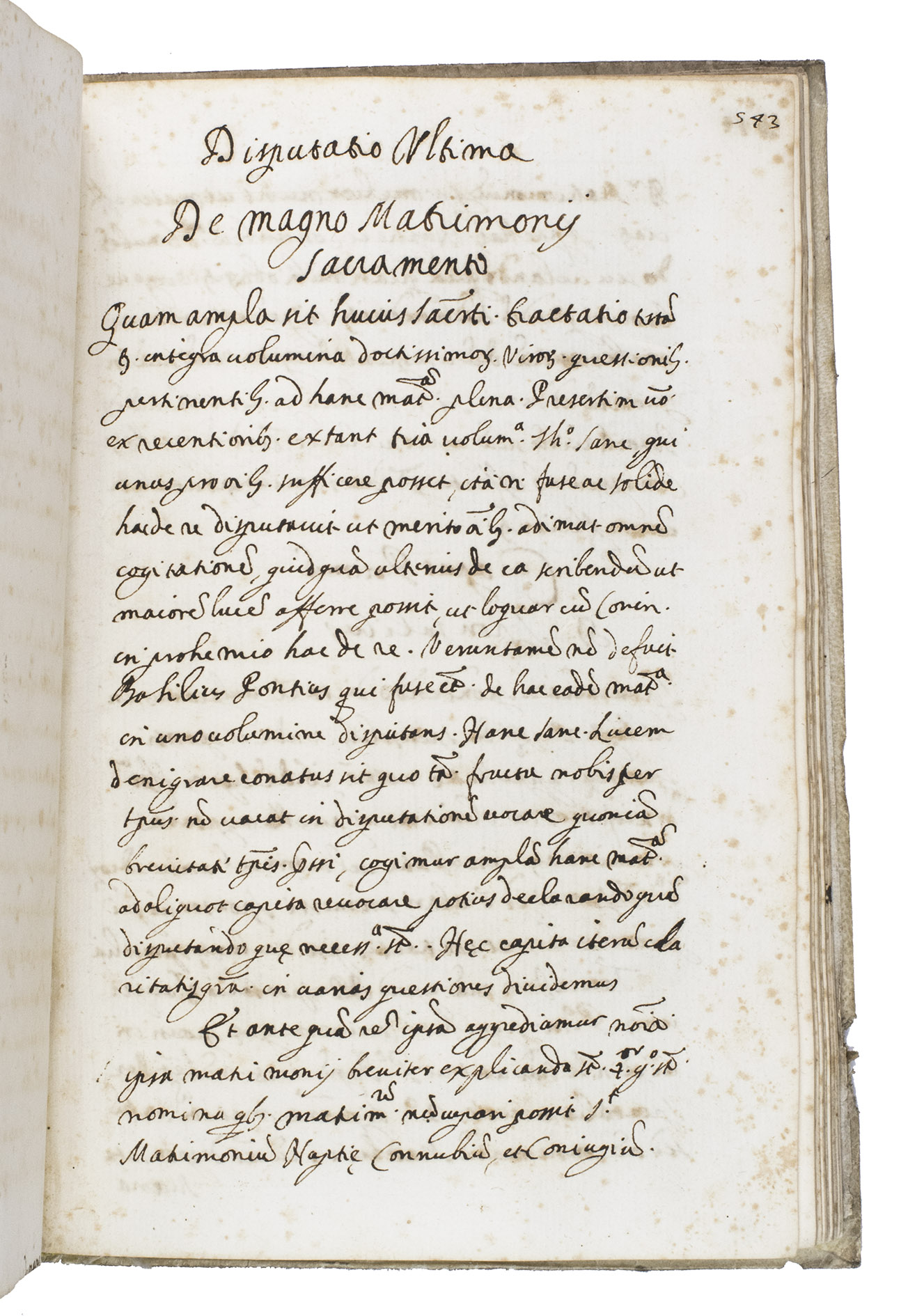 The front hinge of volume 1 is broken and partially loose, the spine is damaged, the front board spotted, the bookblock of volume 2 is loose in its binding. The text is in very good condition. Backer-Sommervogel, I, p. 504: A = Mss. 1642-44, 3 vols. 4to.: In praecepta decalogi. - De Sacramentis novae legis. - De Censuris. (Catal. Bocca, de Rome, 1889); Rosenthal, Bibl. Catholico-theologica, no. 2236 (seul exemplaire connu dun manuscript pas encore publié); P. Pourrrat, Theology of the Sacraments. A study in positive theology (1910).