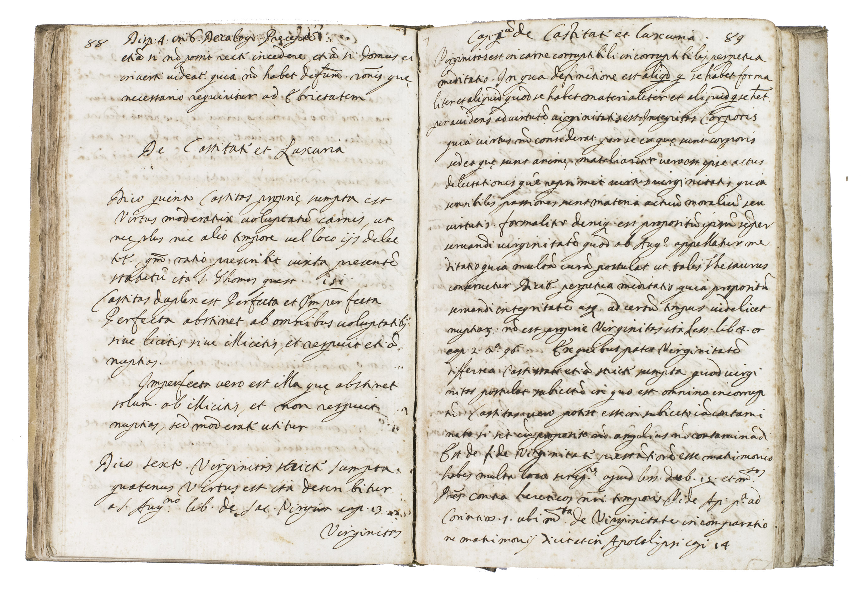 Volume 2 is on the Seven Sacraments used by the Church received from Jesus Christ (the Sacraments "Novae Legis", of the New Testament). They consist of the rites which possess the power of producing grace. The dogmas regarding the Sacraments have been developed during the 12th and 13th centuries: the Scholastic theology of the Sacraments by Abelard, Hugo of St. Victor and Petrus Lombard. They are, in order: Baptism, Confirmation, Holy Eucharist, [De Sacrificio], Penance, Extreme Unction, Holy Orders, Matrimony. The first Disputatio concerns the "De Sacramentis in genere" on pp. 1-106. The disputations are very important for the history of the views of the Jesuits on these fundamental articles of the Christian religion in the 17th century. They were never published. A third volume "De censuris" is mentioned on the last fly leaf of volume 1, but is not present.