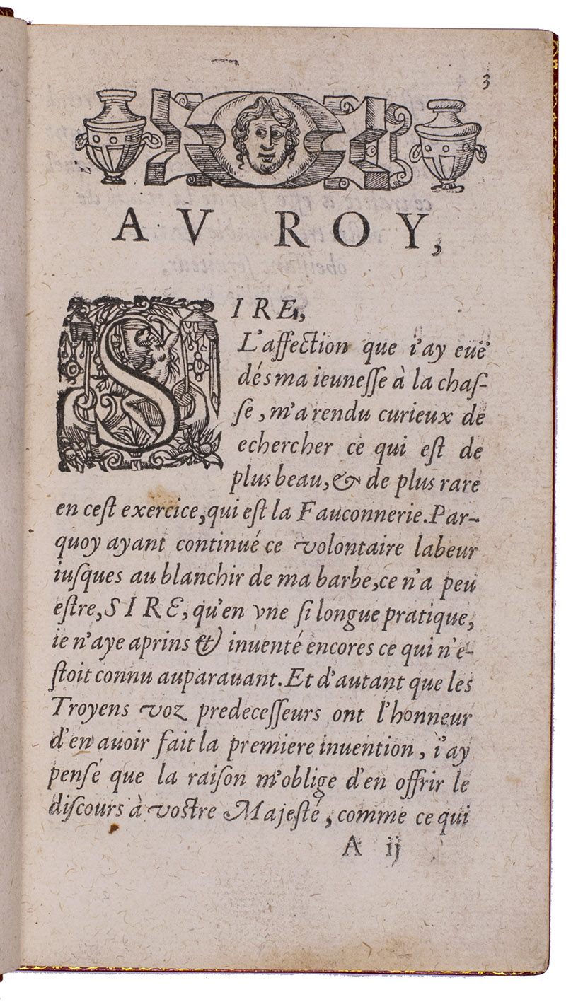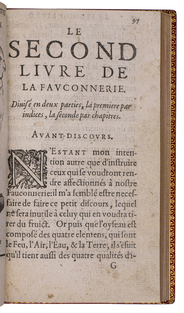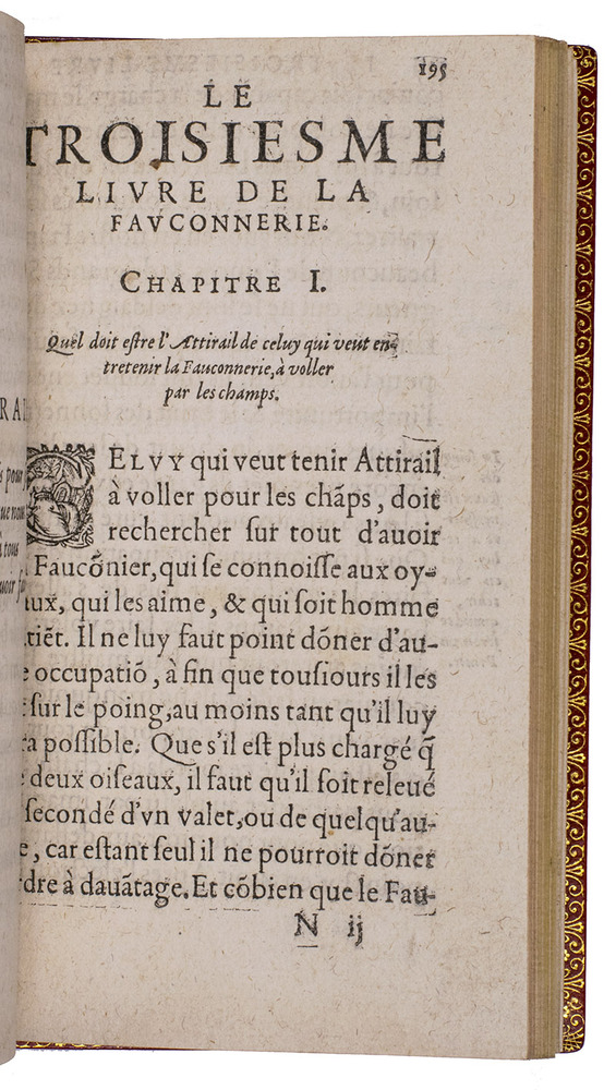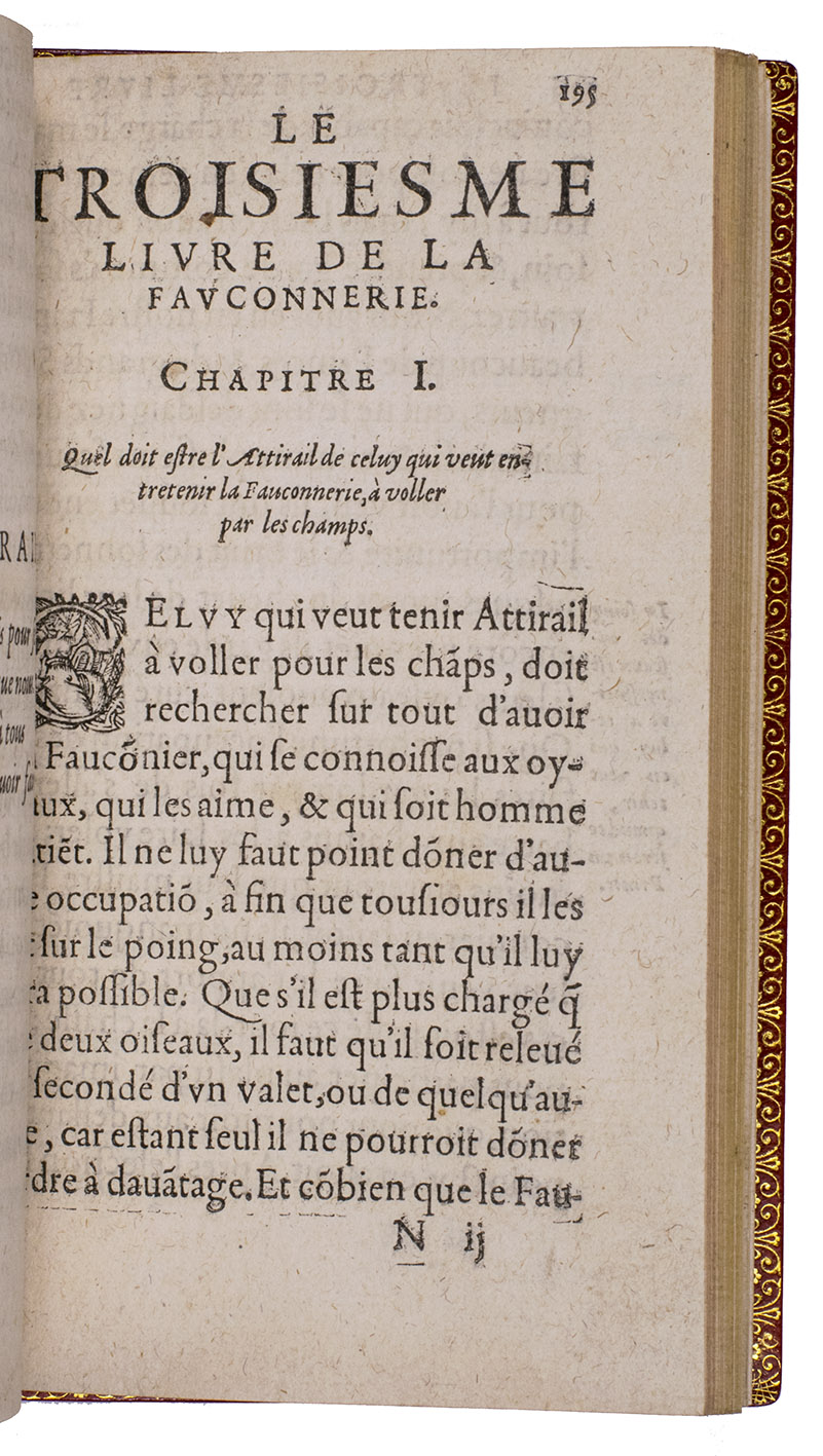 With an 18th-century endleaf, a ca. 1800(?) monogram stamp on the title-page and a modern armorial bookplate. Washed and lacking F8 (supplied in facsimile), but that leaf contains only repeats of 2 engravings plus their captions and a 4-line verse, with no other text. Three other plates are slightly shaved, affecting the tip of one bird's tail (present in the repeat plate), the beak of another and a small bit of foliage in a third plate, a corner torn off 1 leaf (affecting one shoulder note), a small hole in another, a worm hole in the foot margin of the last few leaves and a faint water stain in the fore-edge margin of a few leaves. Still generally in good condition, the binding fine. Very rare classic of falconry and hawking. Harting, Bibl. accipitraria 153 note; Nissen, IVB 35; Ronsil 3120; Schwerdt, p. 41; Souhart, col. 16; Thiébaud, col. 28 & supp. col. 1050; USTC 20901 (3 copies); Wellcome I, 388; cf. Lindner, Bibl. Jagdliteratur 11.0077.01; for the binder Godillot: Fléty, p. 82.
