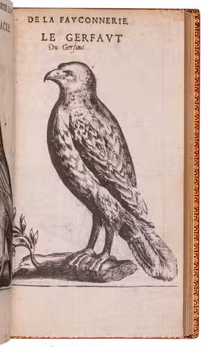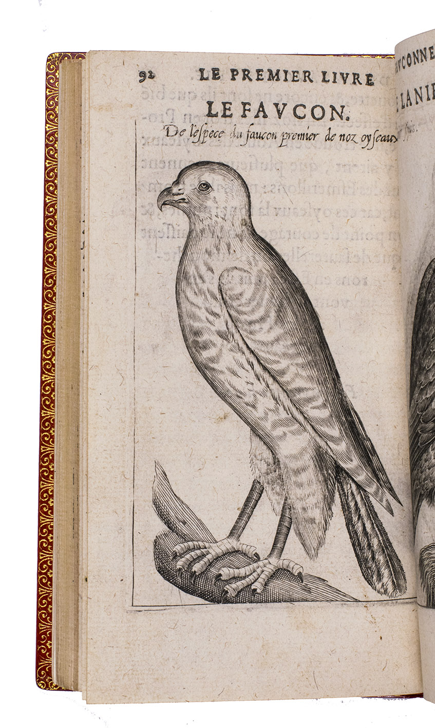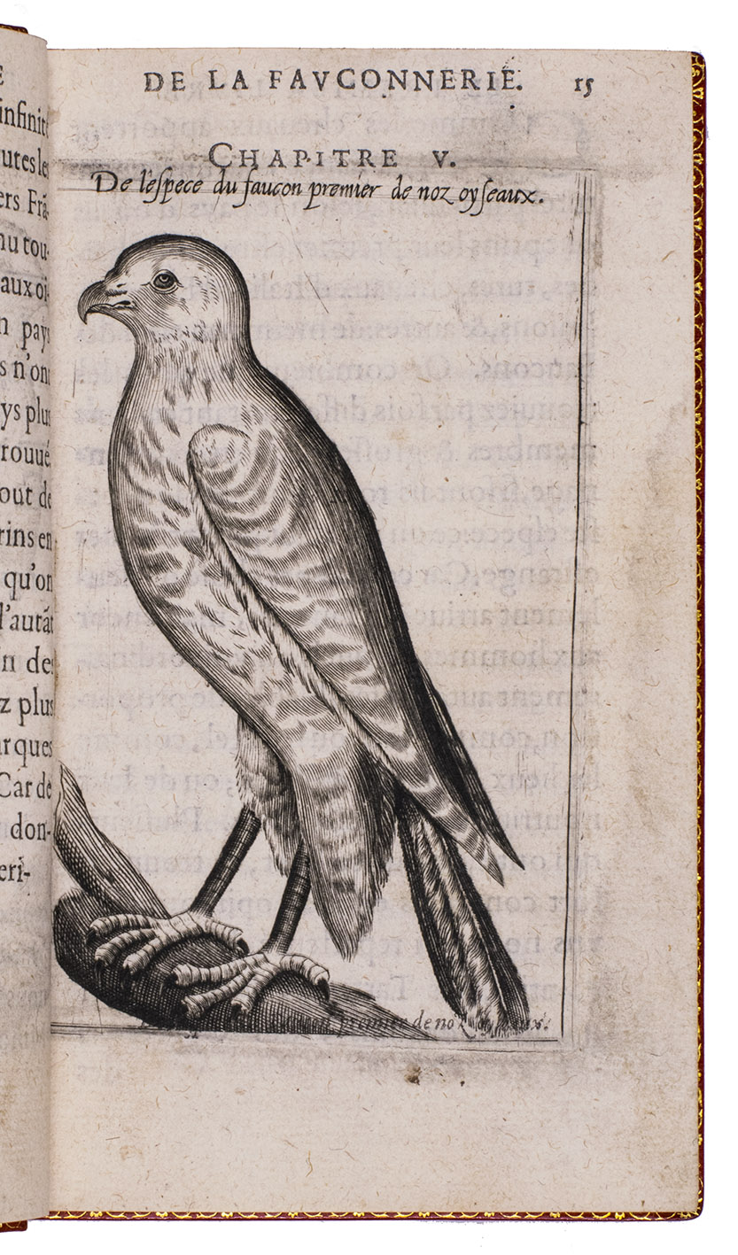 Paris, Jean Houzé, 1599. 8vo. With Houzé's woodcut device, 6 full-page engravings of birds of prey (12.5 x 8.5 cm) plus 3 (of 5) repeats and all on integral leaves. Red goatskin morocco, signed in the foot of the front turn-in by M[arcel] GODILLOT (active as bookbinder 1938-1975), with wide gold-tooled turn-ins and gold fillets on board edge. 272, [8] pp.