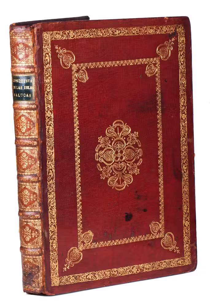 With the engraved armorial bookplate of Jeremiah Hill (ca. 1820). Later in the celebrated library of Sir Thomas Phillips (1792-1872), then the library of Philip Robinson. The imprint of the engraved title-page appeared below the thin-rule border at the foot and is usually shaved or (as in the present copy) wholly lost, along with part of the foot border itself but the title-page is otherwise complete and intact. A few leaves have marginal chips repaired at an early date or small worm holes in the head margin unobtrusively repaired, and one has a small hole repaired slightly affecting 4 words of text. A few leaves are slightly browned or show some spots or smudges, but the book is otherwise in good condition. The hinges are worn, with a few small cracks, and the head and foot of the spine slightly damaged, but the binding is otherwise good, with nearly all of the tooling very good. A beautifully bound copy of an essential source for any study of the Moluccas and the Philippines in the early Portuguese (from 1580 also Spanish) colonial period. Cox I, p. 284; Griffin & Phillips, Philippine Islands 23; Medina, Hisp.-Amer. 551; Palau 16089; Sabin 1946.