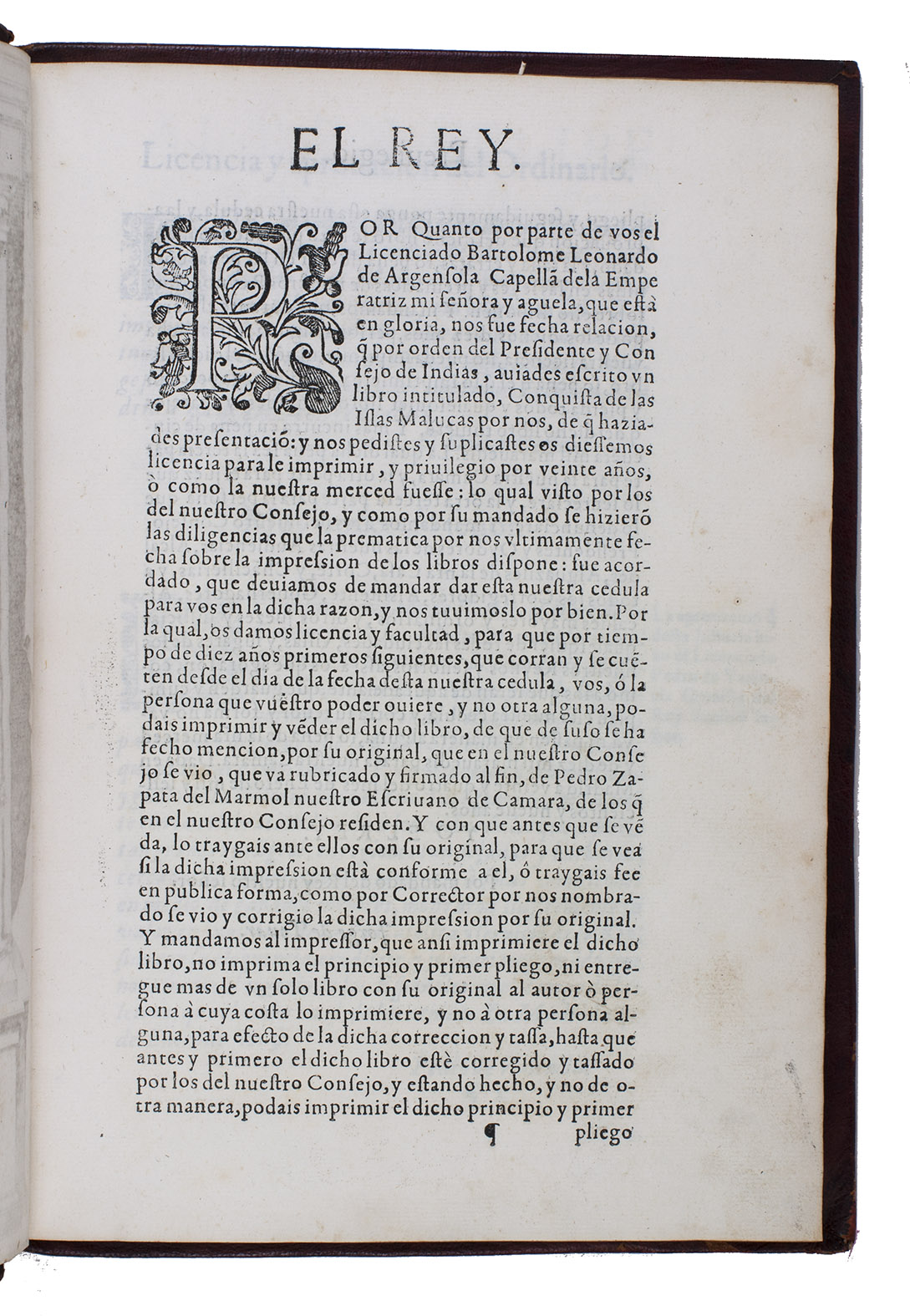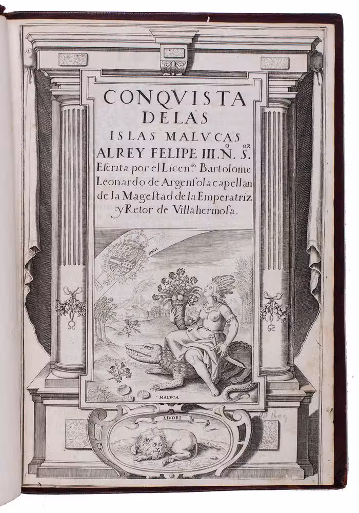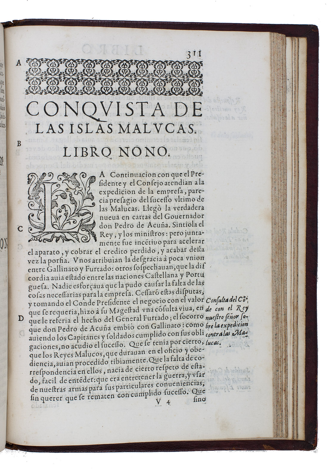 First edition of the author's principal work, in the original Spanish, dedicated to King Philip III of Spain, whose father had untied the Portuguese and Spanish crowns in 1580. It centres on the Philippines and the Moluccas, but also discusses China, Java, Sumatra and Ceylon, and even "los estrechos Persico y Arabico" (p. 12). The Portuguese naval commander Afonso de Albuquerque had conquered Malacca by 1511, a few decades after Arabic merchants introduced Islam there. This provided a base to quickly establish Portuguese influence over the islands of the region. "Few narratives are written with so much judgment and elegance ... One of the most important works for the history of the Philippine islands ... The book also contains matter relating to Sir Francis Drake and American voyages, and to the history of Spanish and Portuguese exploration in the Indies" (Cox). "For the compilation of this work, the author had the command of all authentic manuscript relations, which were either in official custody, or in private hands, besides the testimony of such persons then living as had been eyewitnesses to any part of what he delivers" (Griffin).
