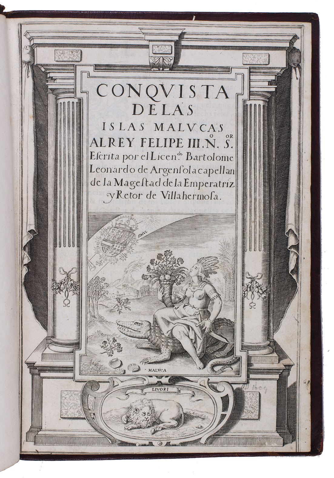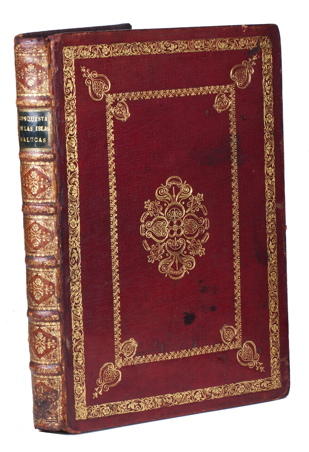 [Madrid, Alonso Martin, 1609]. Small folio (22 x 30 cm). With an engraved architectural title-page showing an allegorical scene (the Moluccas represented by a native woman with feather headdress, cornucopia and sword, riding a crocodile, with the Spanish royal coat of arms in the sky) and a sleeping lion (representing the author?) in a separate cartouche below. Early 18th-century richly gold-tooled red morocco, each board with a large centrepiece a petit fers made partly with pointillé stamps. (Integral?) engraved title-page + [10], “407” [= 411], [1 blank] pp.
