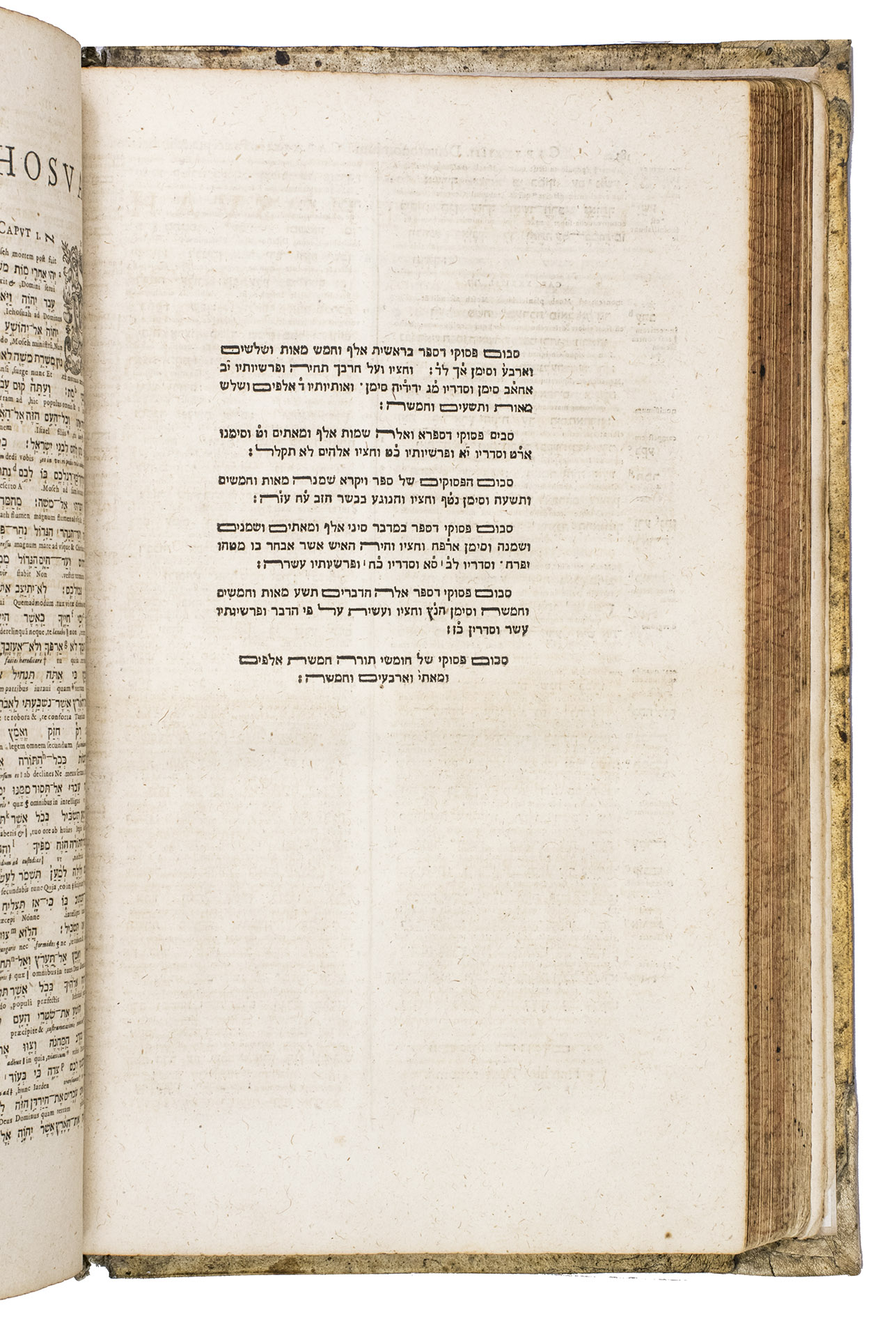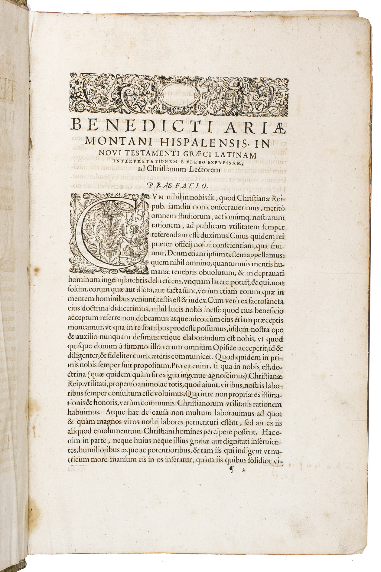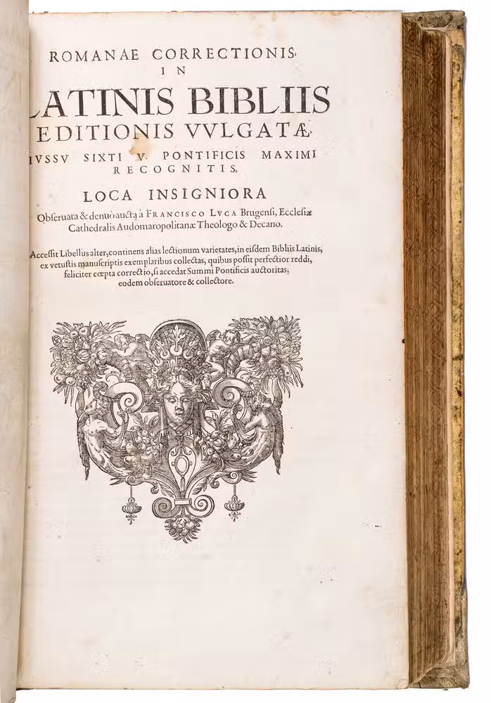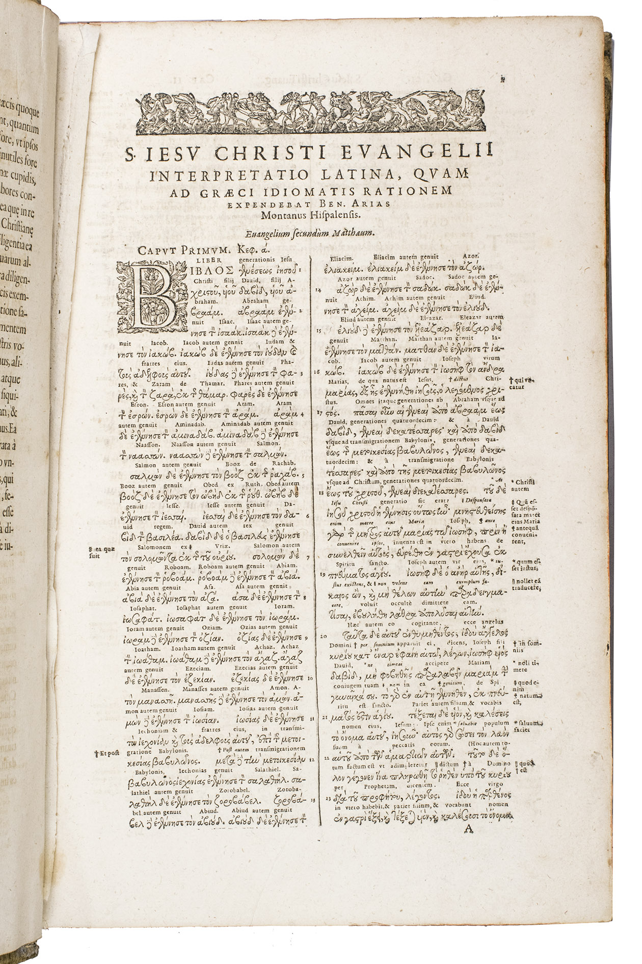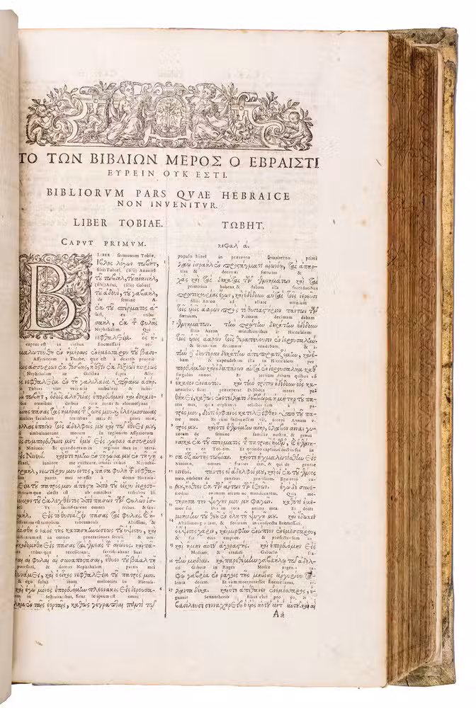 Scarce later edition of the famous Antwerp Polyglot, in a beautiful contemporary binding. The present work contains the New Testament with the Apocrypha in Greek, and the Old Testament in Hebrew, both with an interlinear Latin translation. The Greek work starts at the beginning of the volume and the Hebrew at the end. The Greek work is also supplemented with a correction of the Vulgate. The present edition is quite scarce, as we have only been able to find one other copy in sales records of the past hundred years which contains both the Greek and Hebrew parts.
