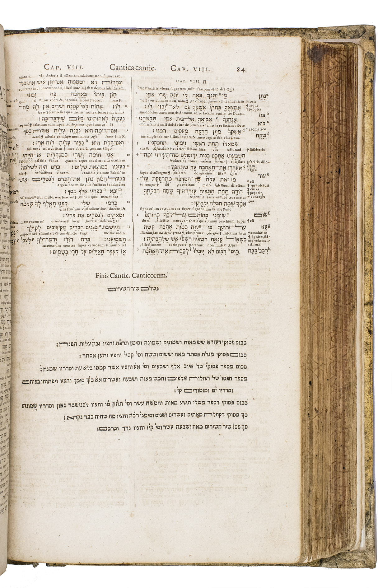 Benito Arias Montanus (1527-1598) was a polymath and one of the most learned Oriental scholars of his time. In the 1560's, he was summoned to Antwerp by King Philip II of Spain to assist Christopher Plantin with his ambitious plan to print a polyglot Bible in five languages (Hebrew, Greek, Chaldean, Syriac, and Latin). The work, titled Biblia sacra Hebraice, Chaldaice, Graece, & Latine, was printed in 8 volumes between 1568 and 1572, and required multiple linguists for proofreading. Although the texts were primarily based on the Complutensian Polyglot (1517), the linguists also carefully consulted many manuscripts, printed works, and notes by various scholars to create the best possible translations. Arias Montanus was responsible for the Latin, Greek, and Chaldean parts, but also revised every section of the work before it passed to the printers. Since the finished work was very expensive, it did not sell well, so Plantin never published a second edition of the whole work. He did, however, print another edition of just volume 7 in 1584, which contained the Old Testament in Hebrew and the New Testament in Greek. The present work is a reissue of this edition.