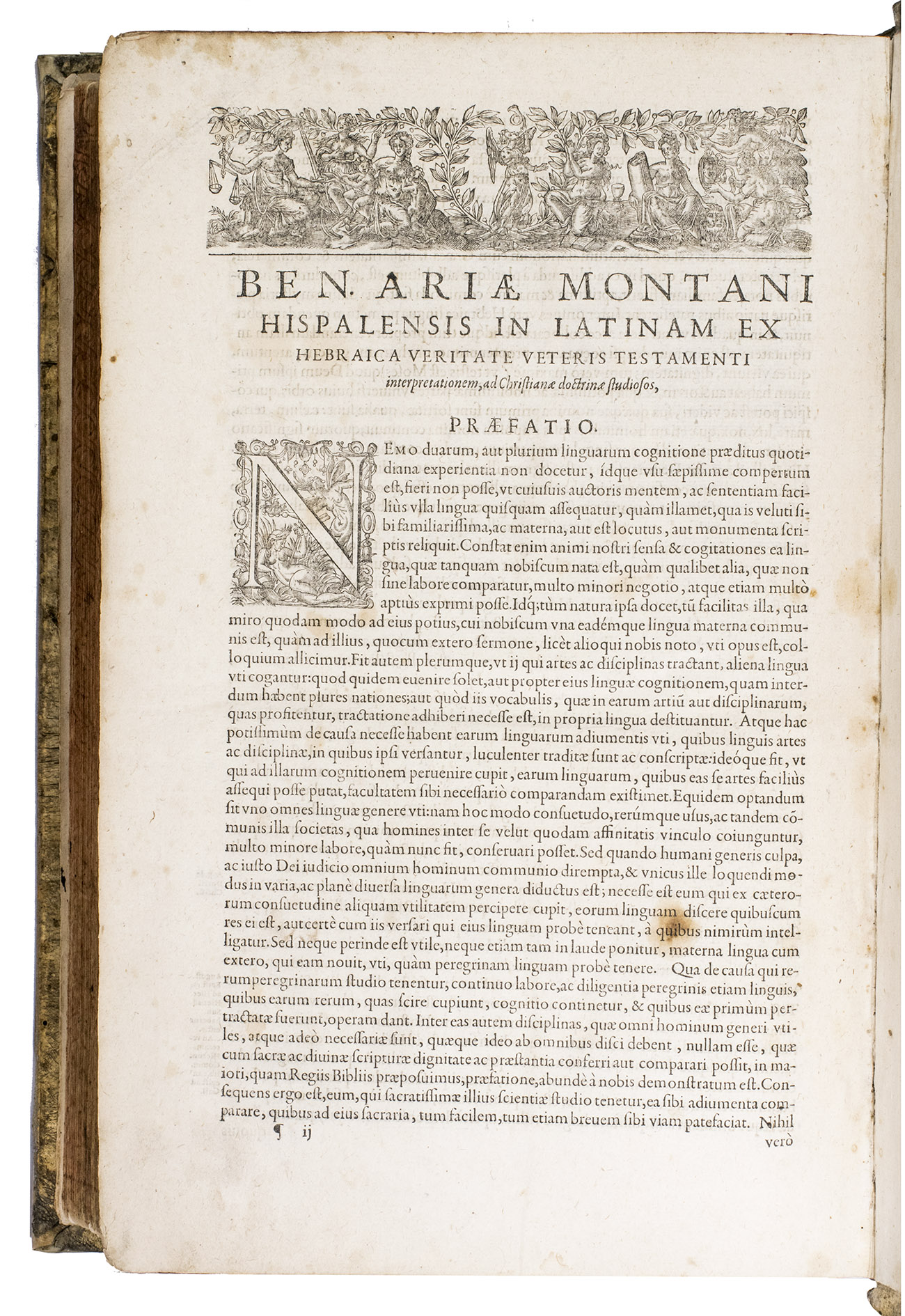 [Geneva], Petrus de la Rouière, 1618. 2 works in 1 volume, both in 4 parts. Folio. With numerous decorated woodcut initials and woodcut headpieces, the work is printed in Latin, Greek, and Hebrew type. Contemporary blind-tooled vellum with remnants of closing ties, red gauffered edges. [8], 271, [1 blank], [50], [2 blank], [4], 70, [2 blank], 167, [1 blank]; 183, [1], 283, [1 blank], 84, 203, [1 blank] pp.