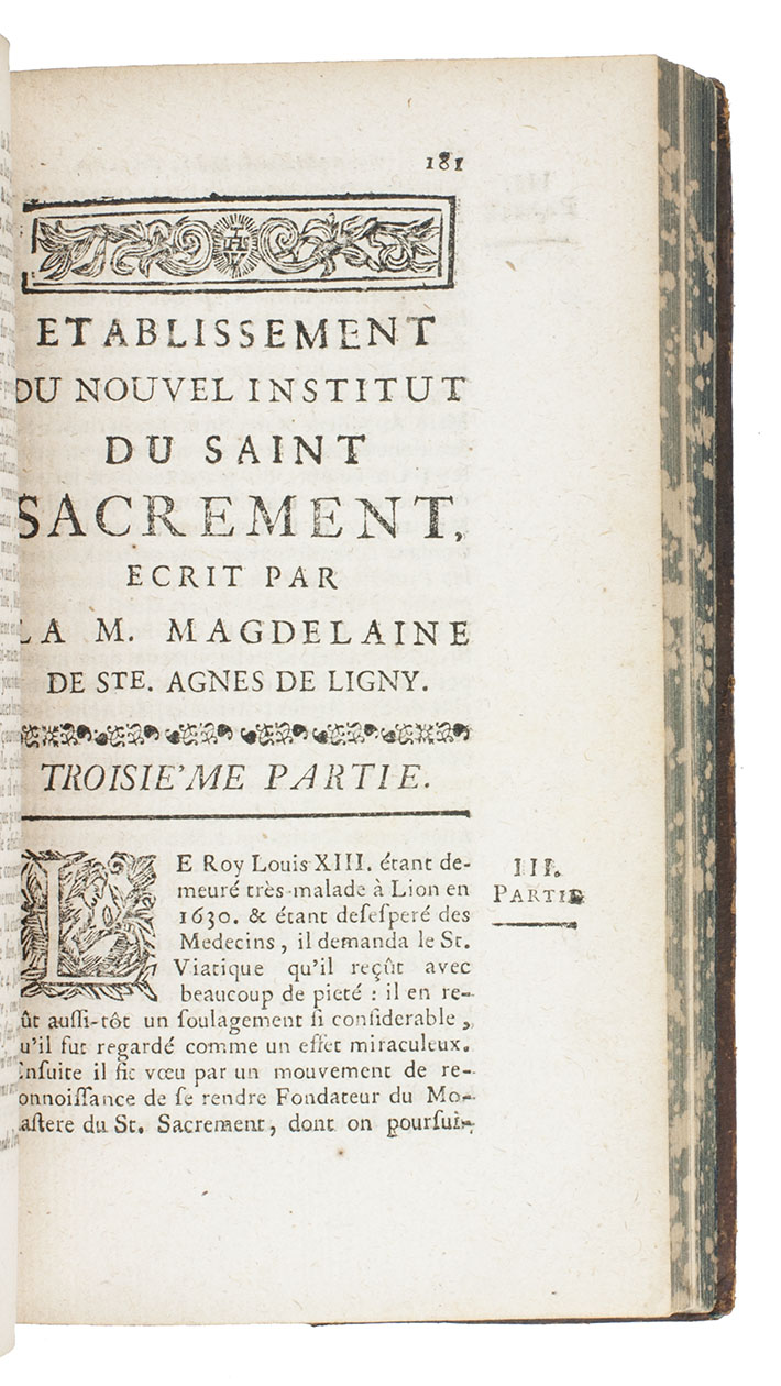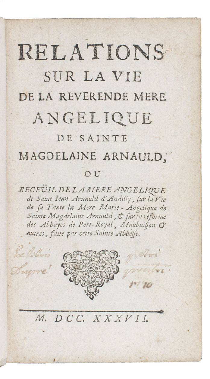First edition of the biography of the famous abbess and reformer of Port-Royal, Mother Angélique de Sainte Magdelaine Arnauld (1591-1661) and notes on the history of Port-Royal, Maubuisson and other monasteries by her niece Angélique de Saint Jean Arnauld d'Andilly (1624-1684). Together with notes on her own life and the events at Port-Royal during the years she was abbess there.
