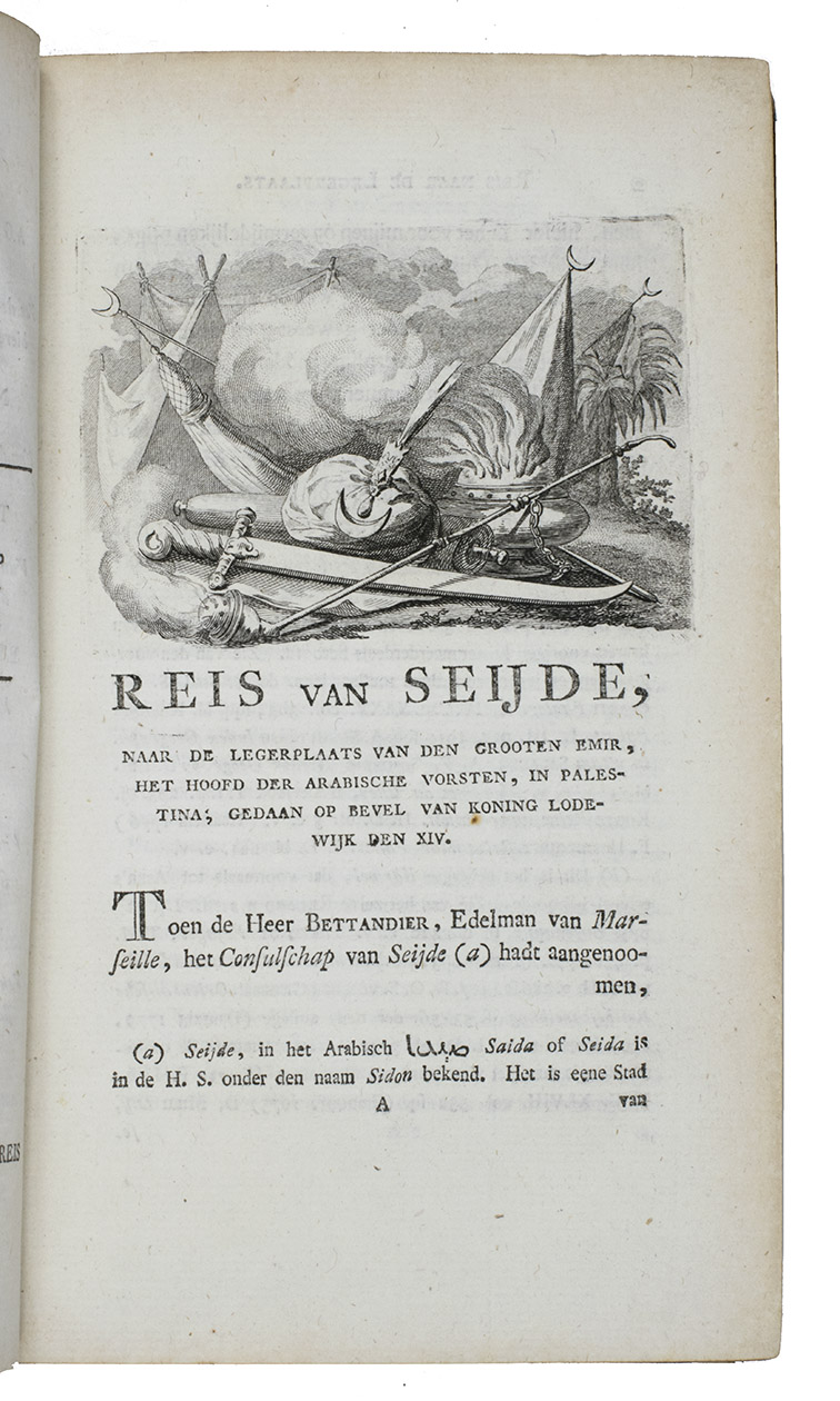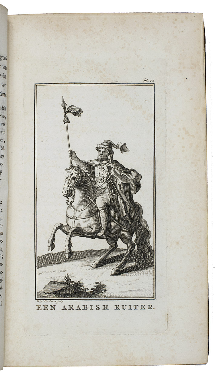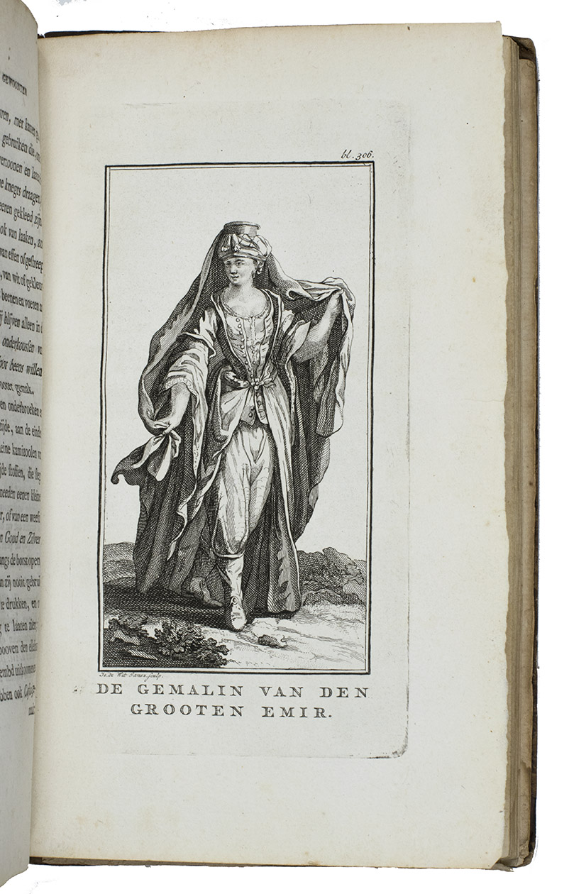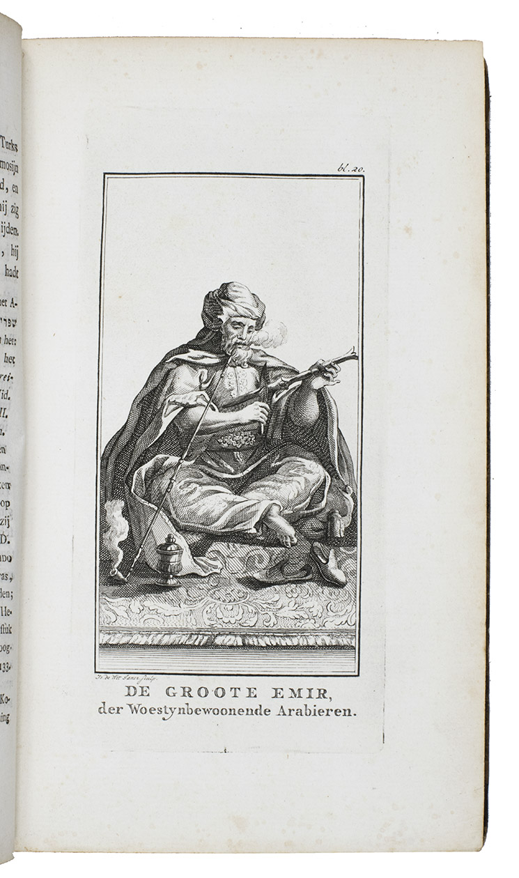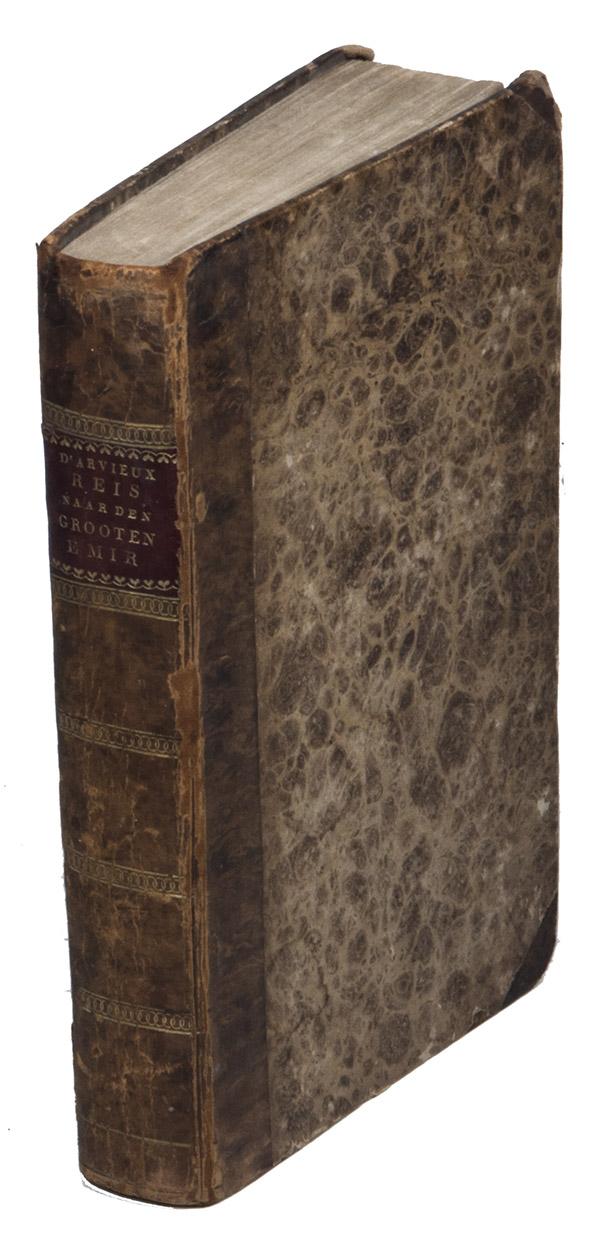 First Dutch edition of D'Arvieux's Voyage ... vers le grand Emir, translated and annotated by Gerard Kuipers. Well-versed in Arabic, Turkish, Persian, Hebrew and Syriac languages and dressed in local costume, D'Arvieux travelled widely in the Levant. He resided in Sidon (or Saïda) in Lebanon (then under Ottoman rule) from 1653 to 1664, when he was sent on a mission to the Arabs of Mount Carmel in Palestine, which is narrated in the present work. The account includes a general description of the traditions and customs of nomadic tribes and is illustrated with 3 fine plates, showing an Arabian horseman, the Emir and the Emir's wife. It was first edited and posthumously published by Jean La Roque in 1717.