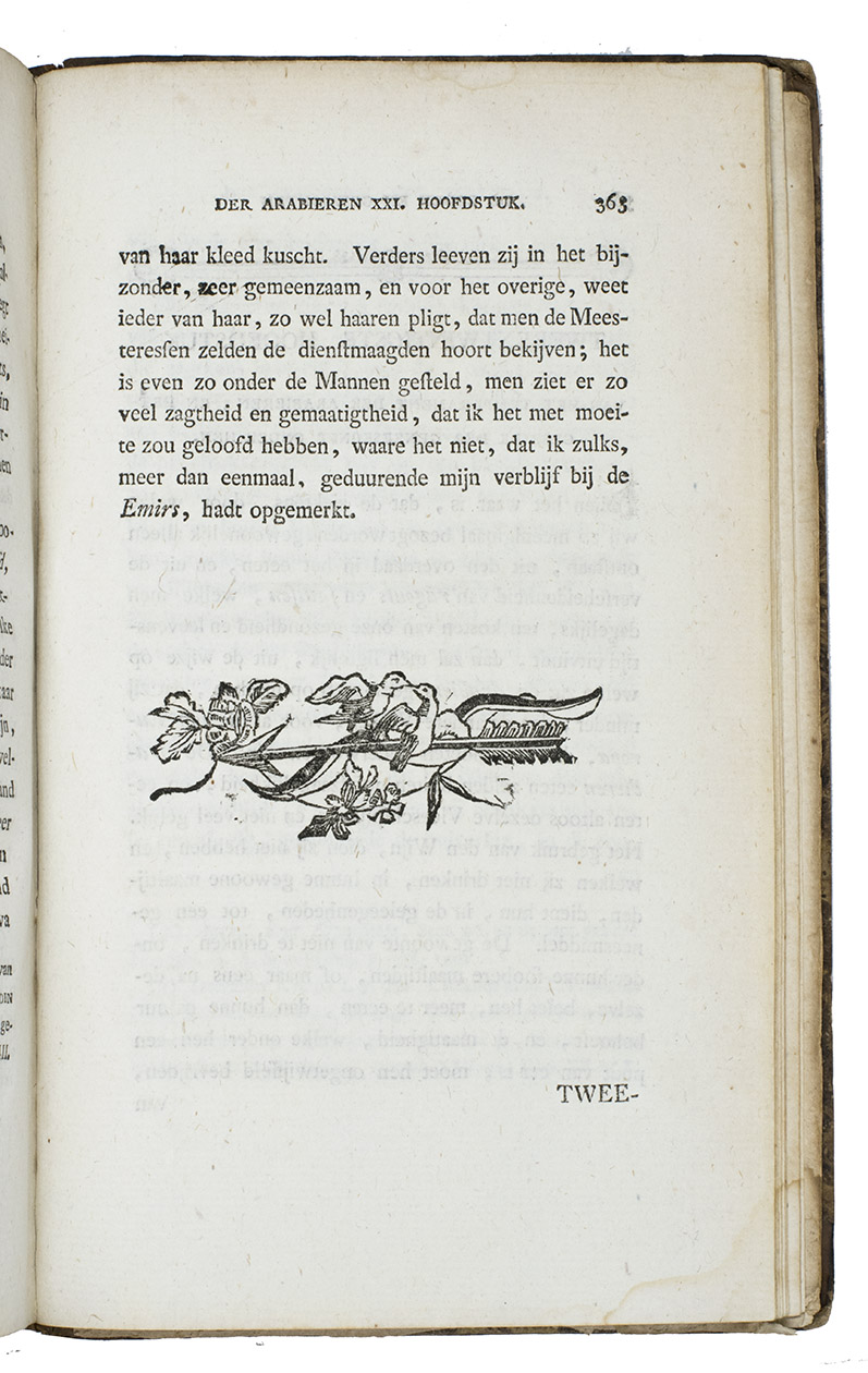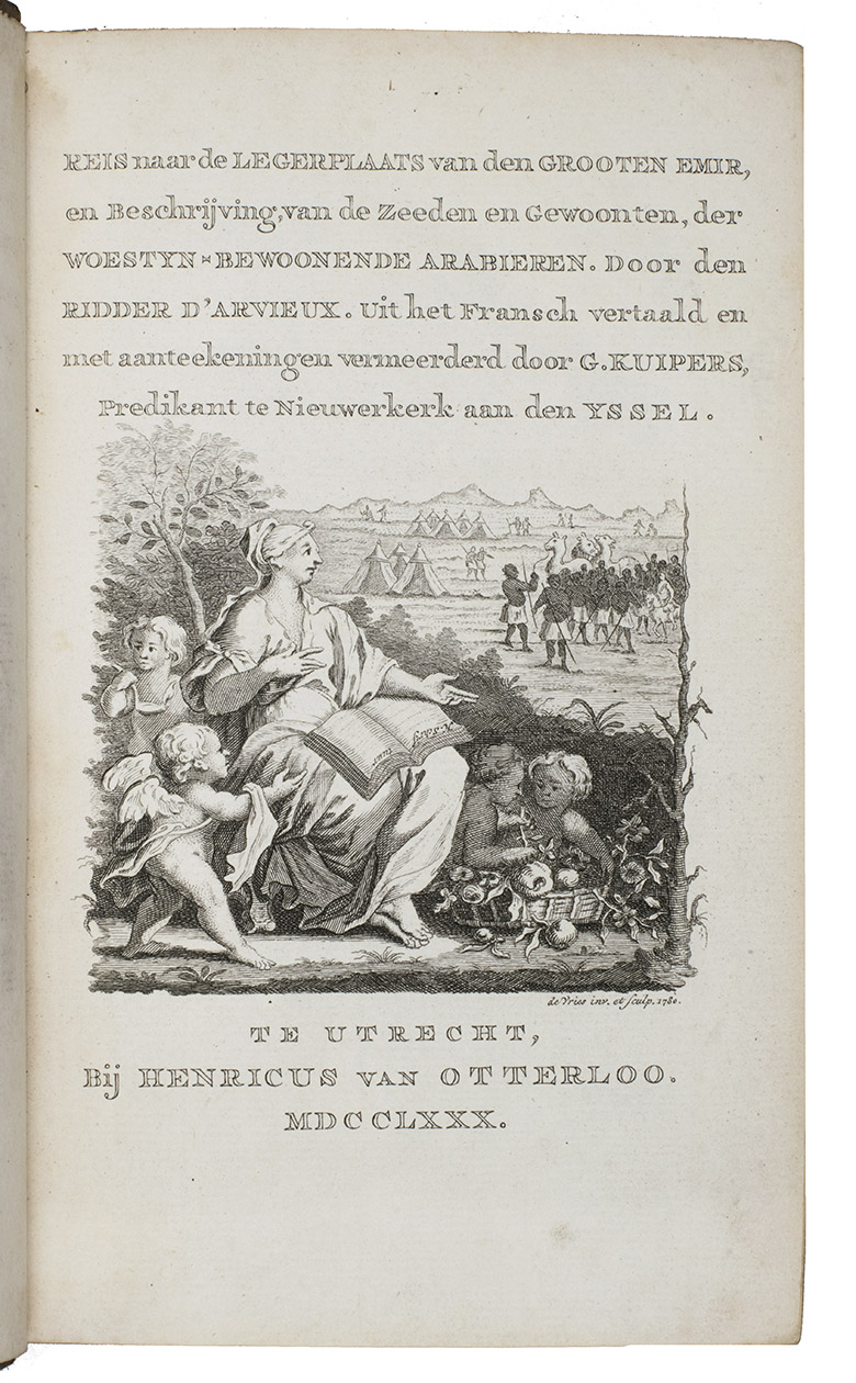 Utrecht, Henricus van Otterloo, 1780. 8vo. With engraved title-page with a vignette by De Vries (a female figure reading from "H[eilige] Schriftuur" (Holy Scripture) with 4 putti and in the background a desert scene with tents, camels and dozens of mostly dark-skinned people, apparently representing nomads), 3 full-page engraved plates by Izaak de Wit Jansz., an engraved half-page illustration (unsigned), headpieces built up from rococo typographic ornaments and woodcut tailpieces. Contemporary half tree calf, gold-tooled spine with red morocco label, shell-marbled sides. [6], XL, 384, [16] pp.