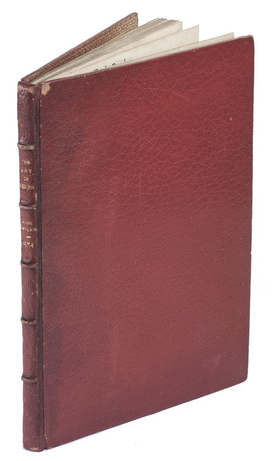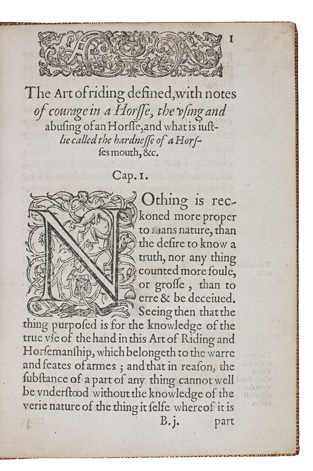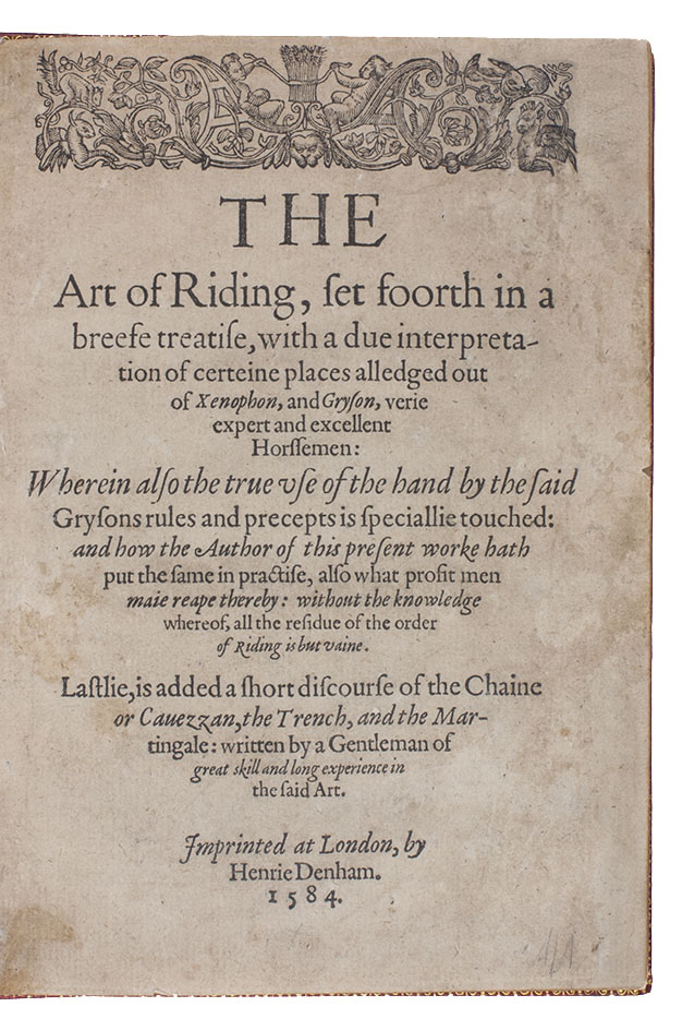 With the first three leaves somewhat browned and their upper outside corners skilfully and unobtrusively restored, slightly affecting the corner of one headpiece and a few letters of the text, and a tear in the fourth leaf restored without loss, but otherwise in good condition, with only an occasional minor blemish. A rare classic of horsemanship deserving pride of place in any collection on the subject. Dejager, Great books on horsemanship (2014), 38; Huth, p. 11; Podeschi 12; STC 884 (8 complete & 2 incomplete copies).