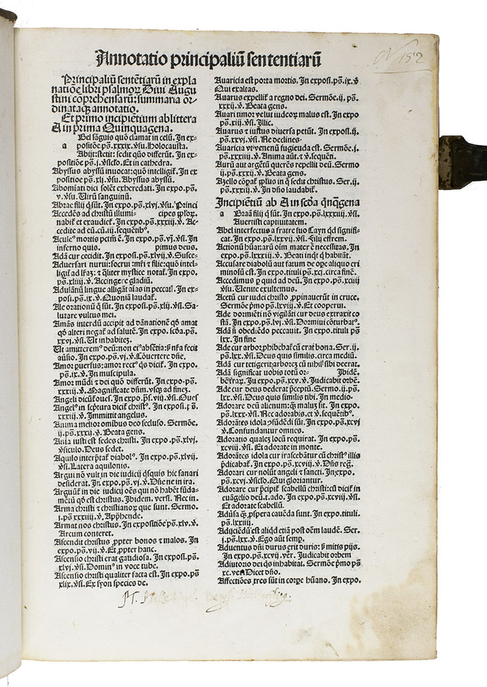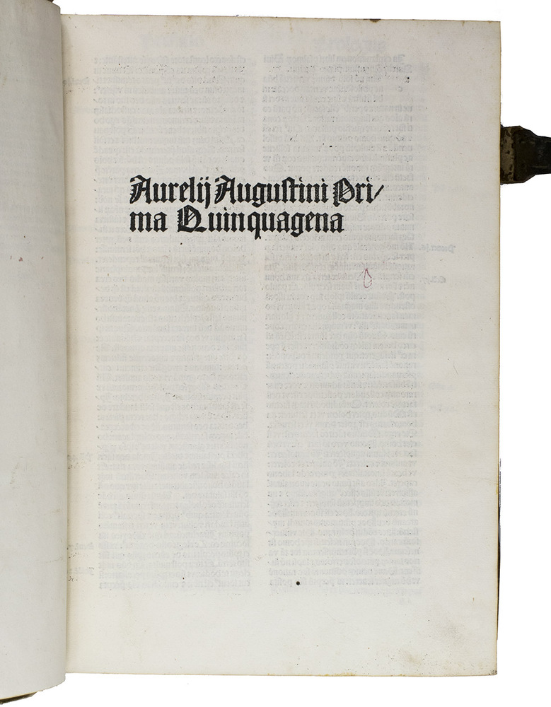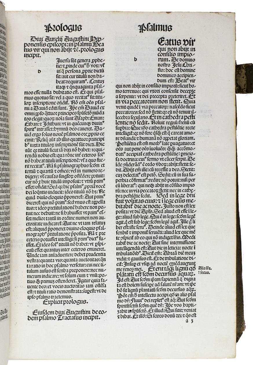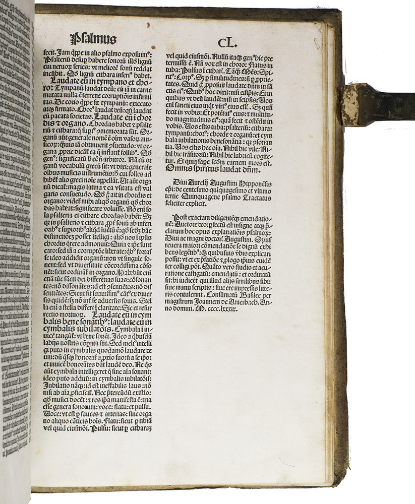 A complete copy of one of Saint Augustine's chief exegetical works. The present Amerbach edition is only the second time Augustine's explanation of and commentary on the Psalms was ever printed. The first time was in ca. 1485, only a few years earlier, and was printed by an anonymous press in the Low Countries.